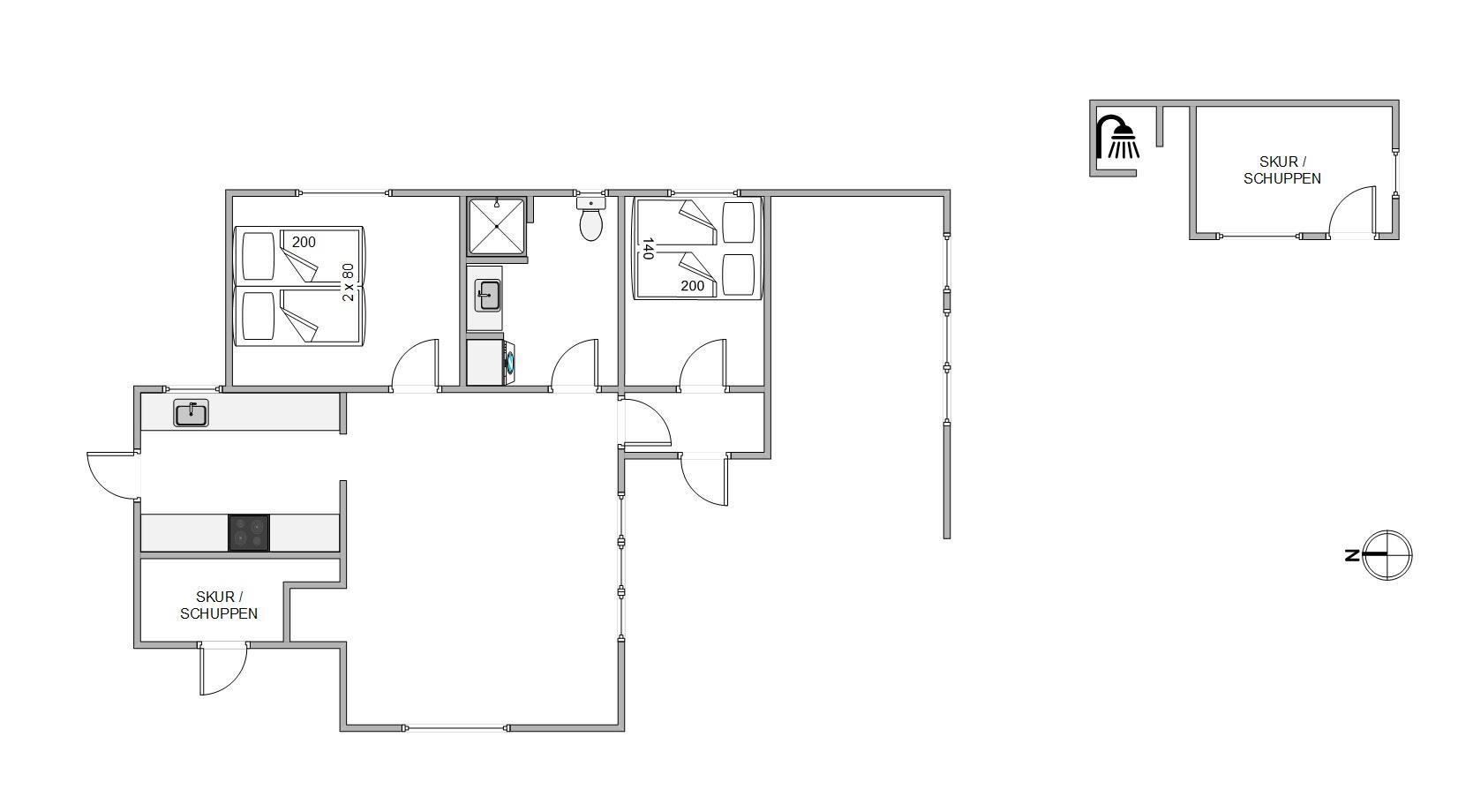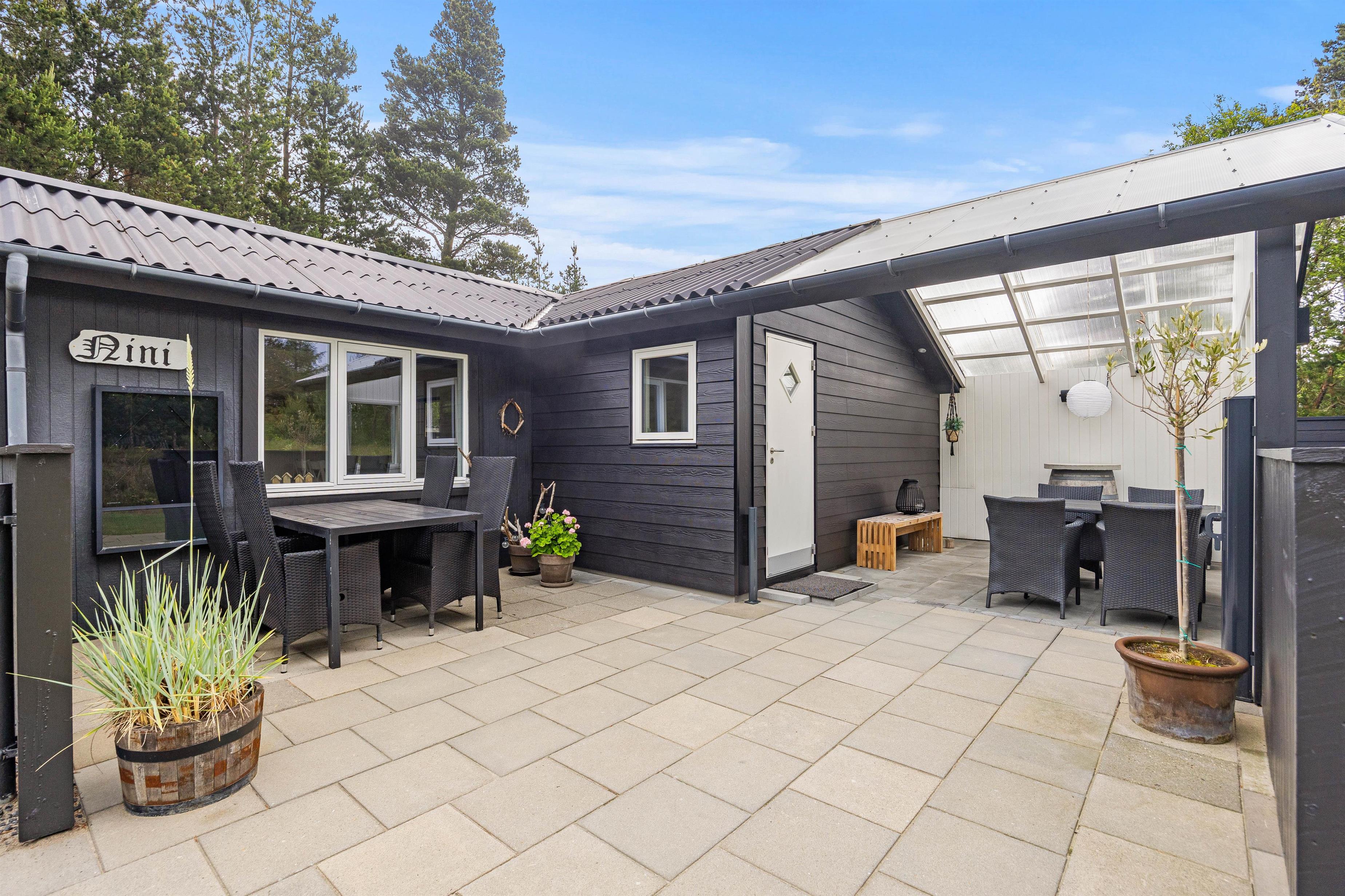Sommerhuset er indrammet af en dejlig terrasse, hvor I kan slappe af i de komfortable havemøbler, solbade på liggestolene, spise udendørs eller trække jer tilbage med en god bog. I kan altid finde en rolig plet til en af siderne. Hvis solen er for stærk, kan en hurtig douche under udebruseren* friske op. Tænd op i gasgrillen og slut dagen af med et lækkert grillmåltid, imens skyggerne bliver lange.