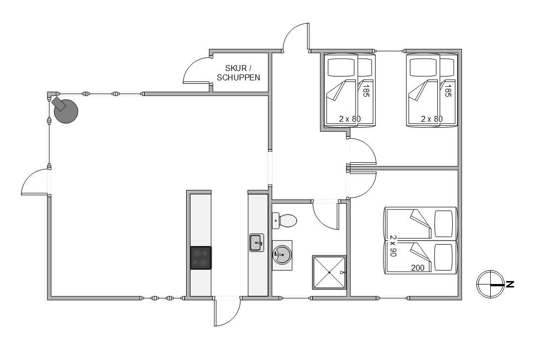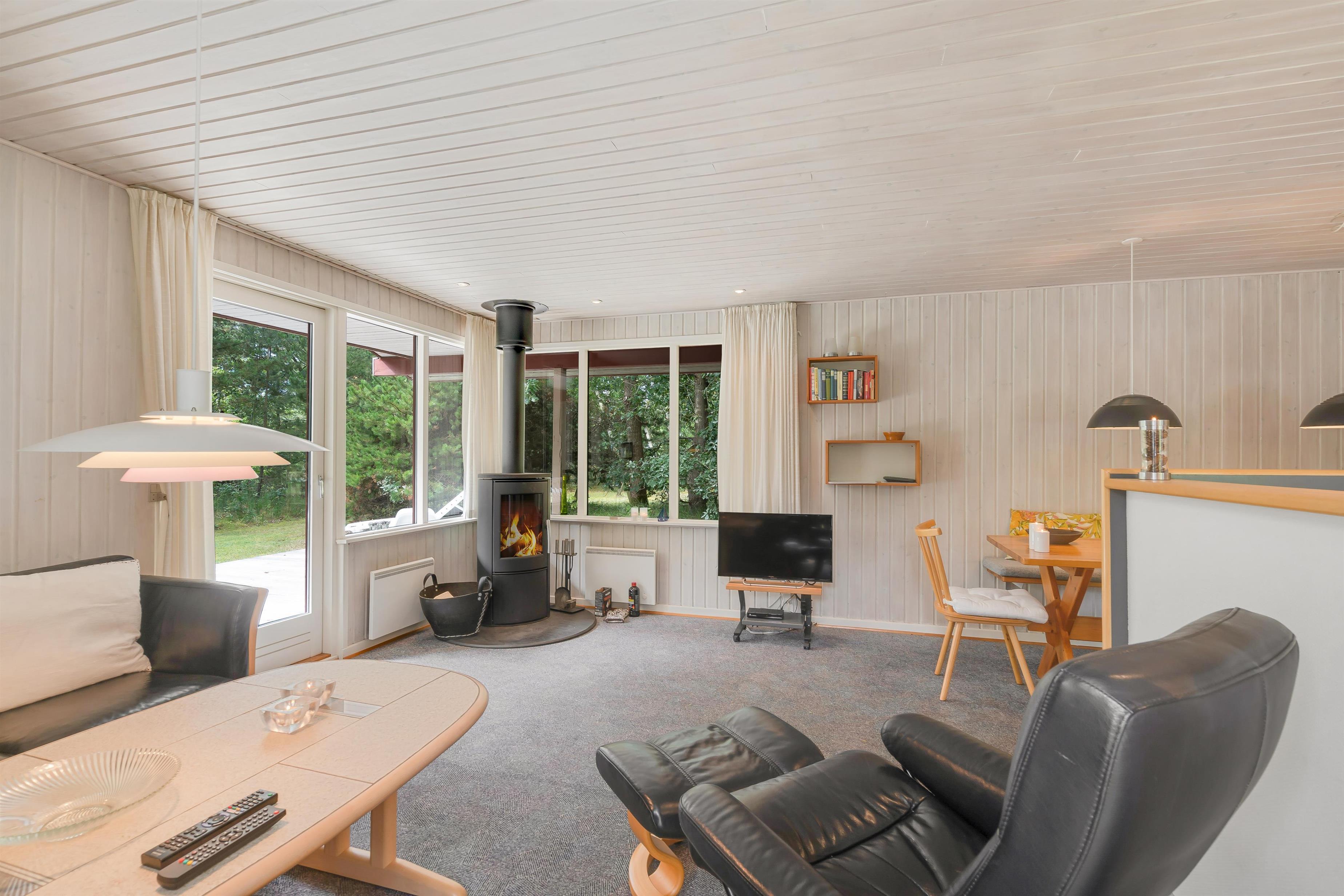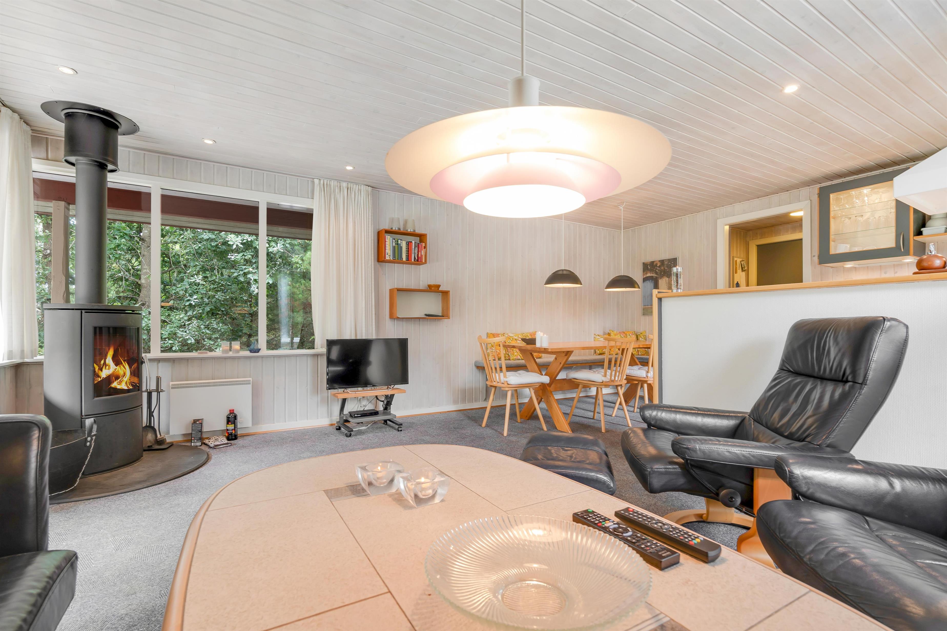 Den åbne forbindelse mellem køkken, stue og spiseplads gør, at I kan være sammen om at lave mad, se film og meget mere. Samtidig kan I nyde hinandens selskab, selvom I har gang i forskellige ting. Da sommerhuset ingen internet har, kan I hygge jer med brætspil og bare nyde selskabet. Brændeovnen knitrer i baggrunden og sørger for, at den hyggelige feriestemning bliver fuldendt.