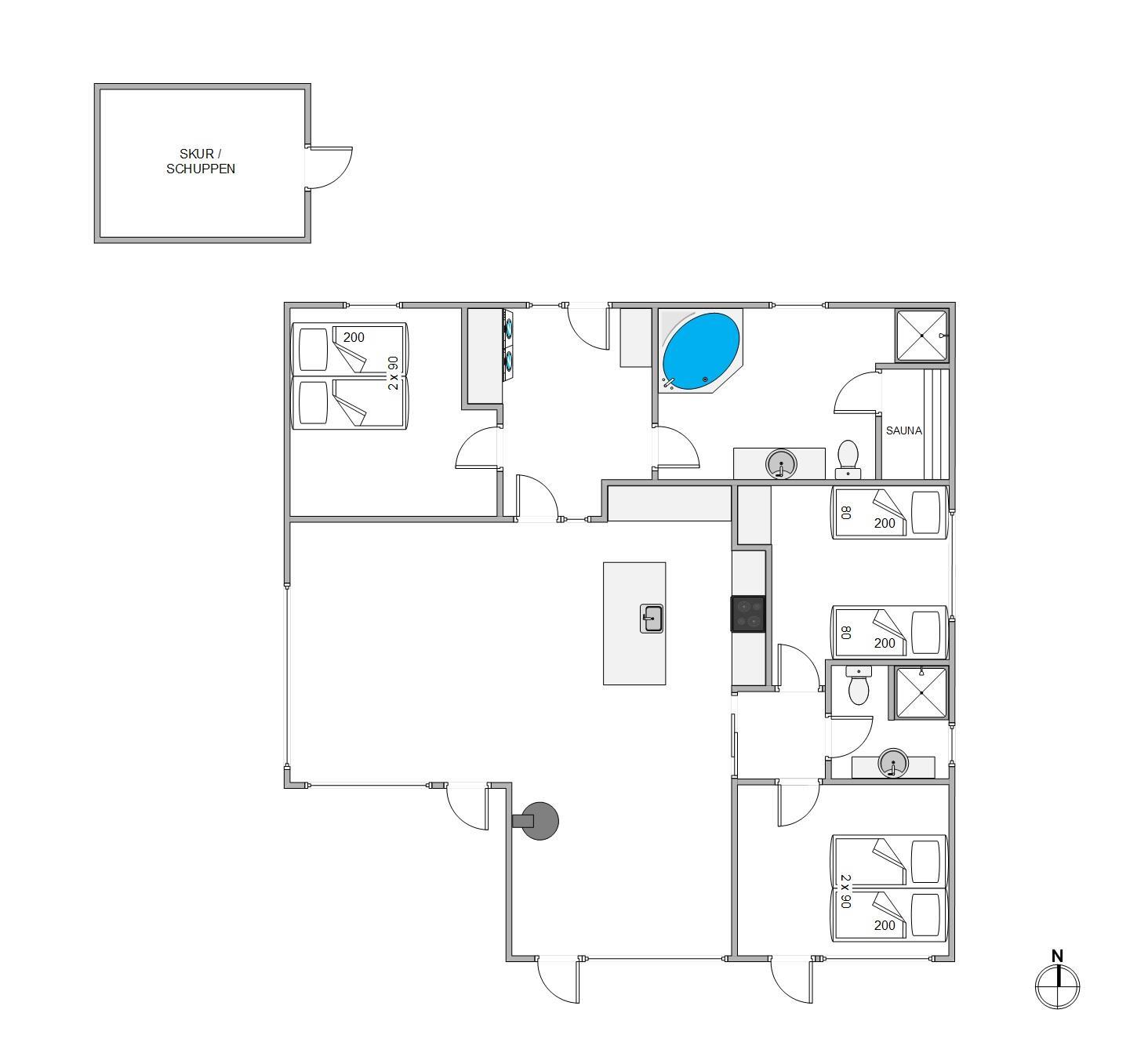 Sommerhuset, der er 120 kvadratmeter stort, har 3 gode soveværelser, hvoraf 2 af indrettet med en dobbeltseng hver, og det tredje er indrettet med 2 enkeltsenge. Derudover er der i alt 2 badeværelser i sommerhuset, der begge er udstyret med gulvvarme, så ingen fryser tæerne fra morgenstunden.