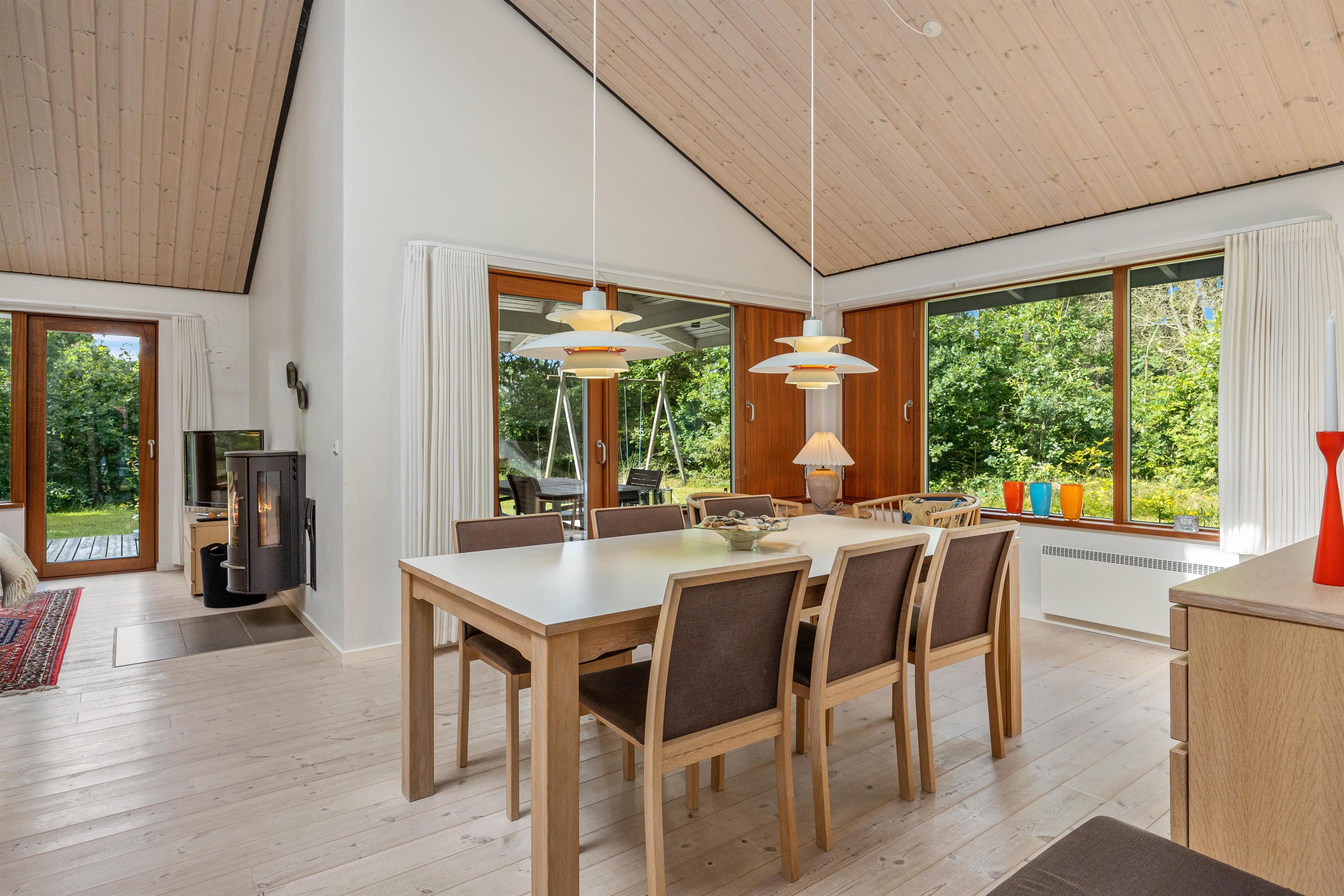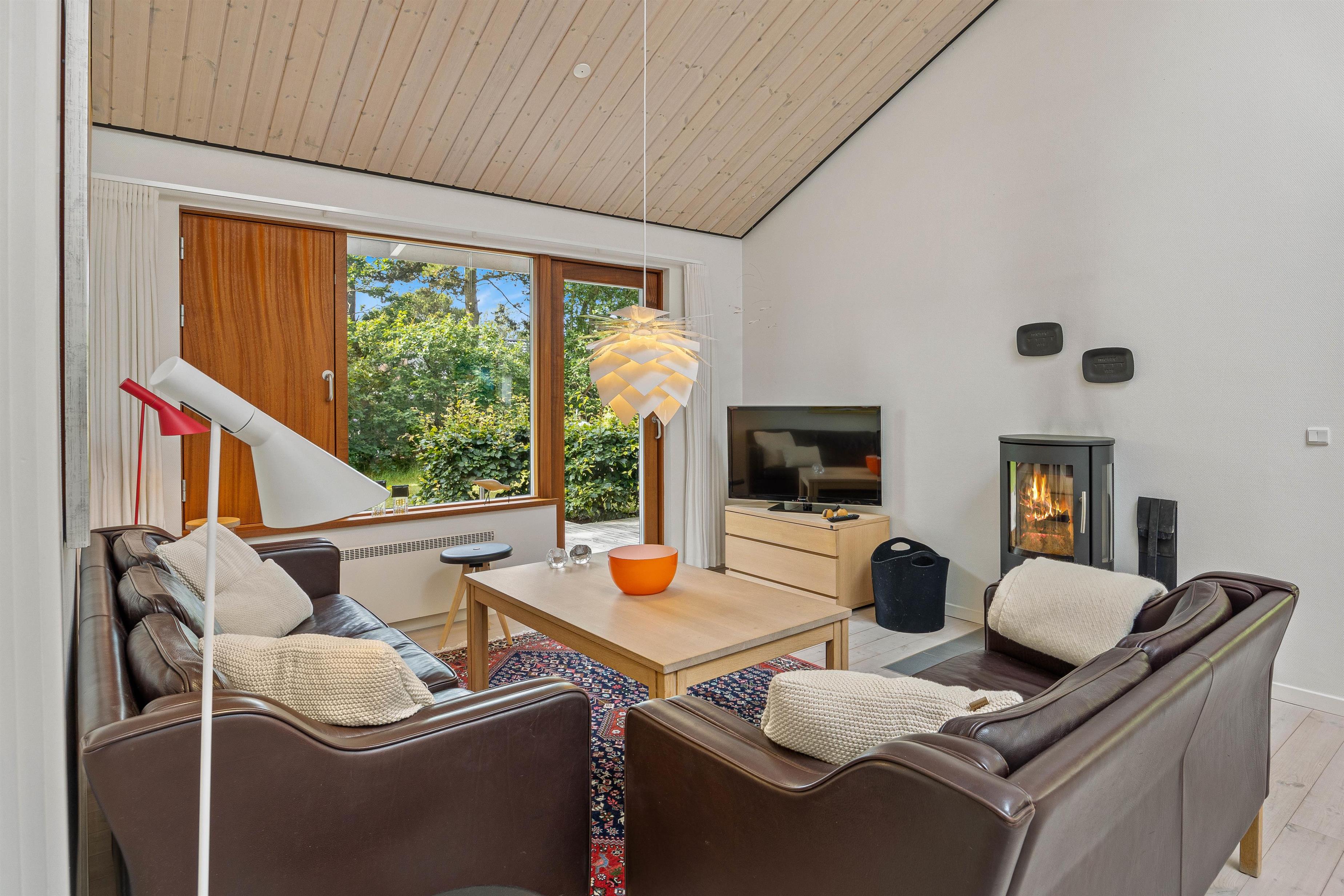 Alrummet byder også på en brændeovn, hvis knitrende flammer fuldender den hyggelige feriestemning, mens den også spreder en dejlig varme i rummet. Derudover har sommerhuset en energivenlig varmepumpe, der sørger for et godt indeklima.
