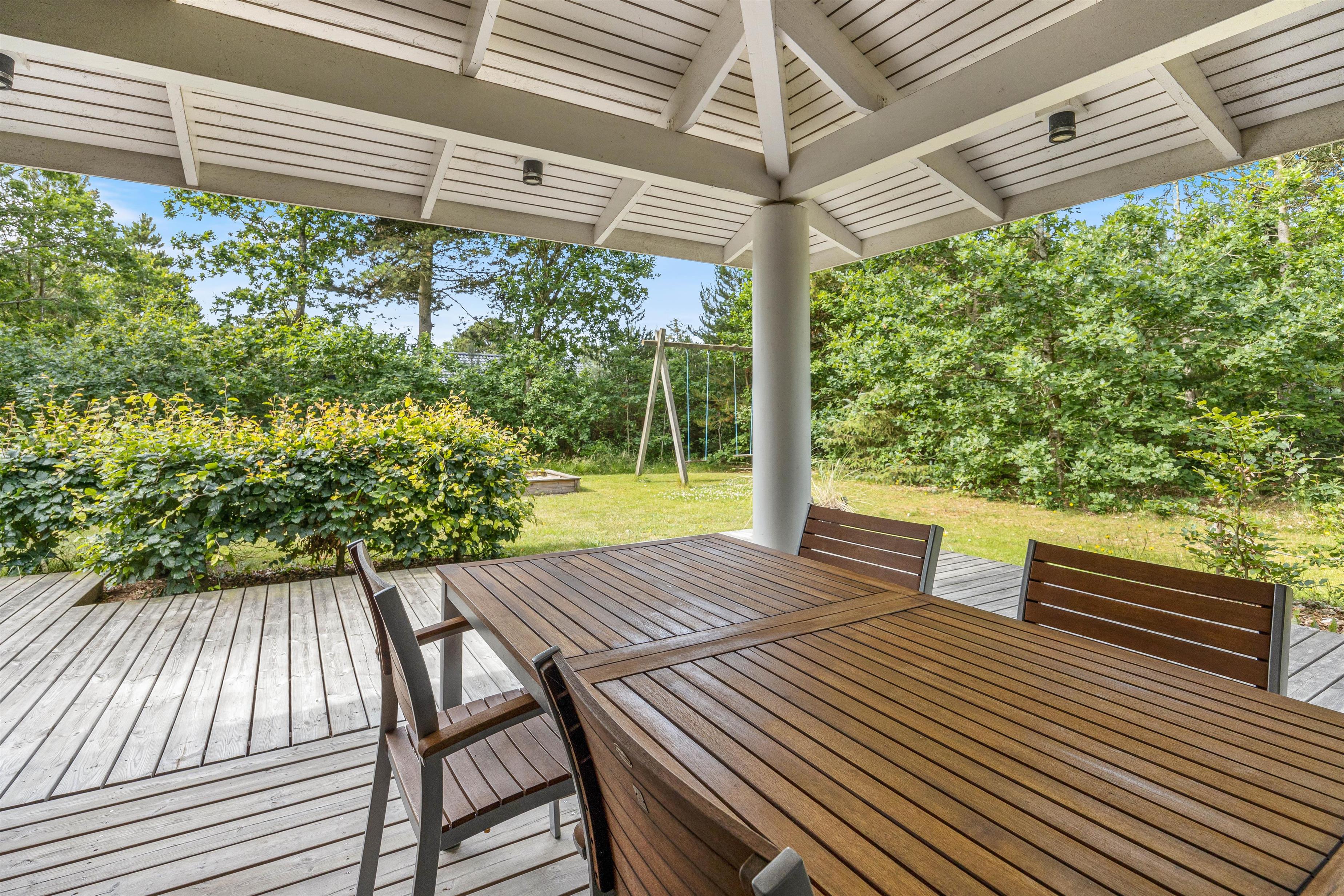 Mens børnene leger, gynger og bygger sandslotte, kan I andre slappe af på terrassen, hvor I kan finde jer en god plads, hvor I kan sætte jer til rette i havemøbler og liggestole. Terrassen er delvist overdækket, og derfor har I også mulighed for at sidde i skyggen, hvis I får brug for at holde en pause fra solen.