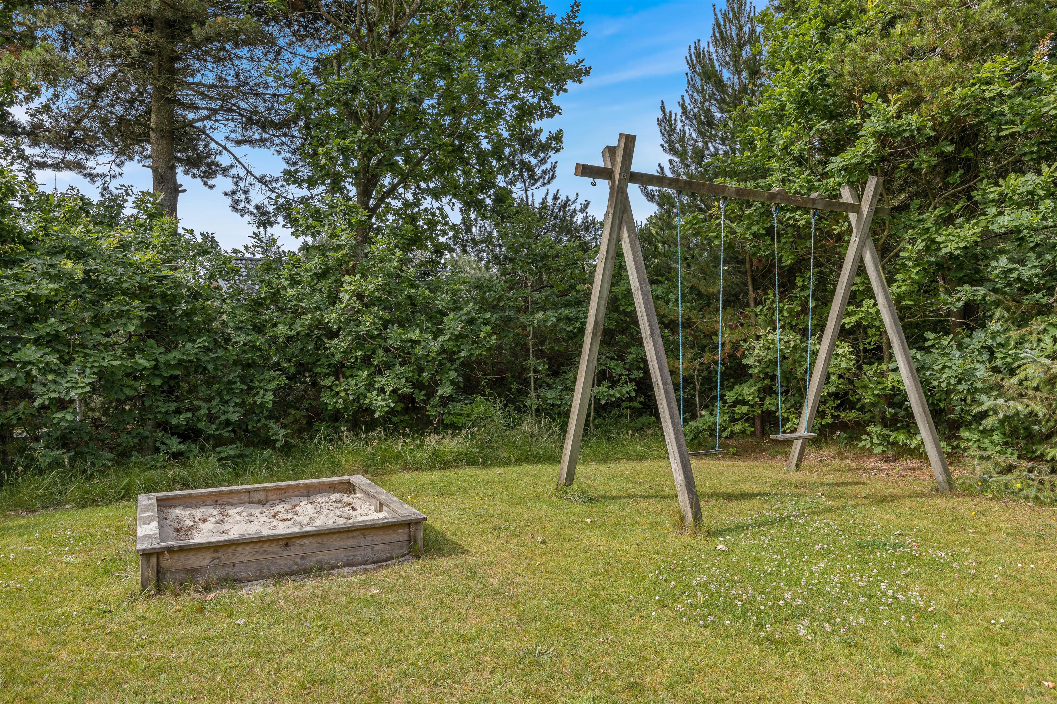 Sommerhusets udeområde inviterer hele ferieflokken til at tilbringe feriens varme og solrige dage udendørs. Til feriens yngste gæster er der en have, hvor de har god plads at boltre sig på, samt en sandkasse og et gyngestativ.