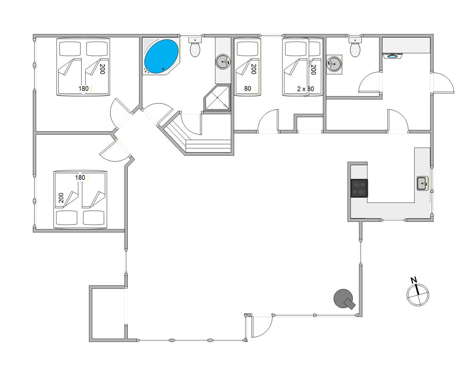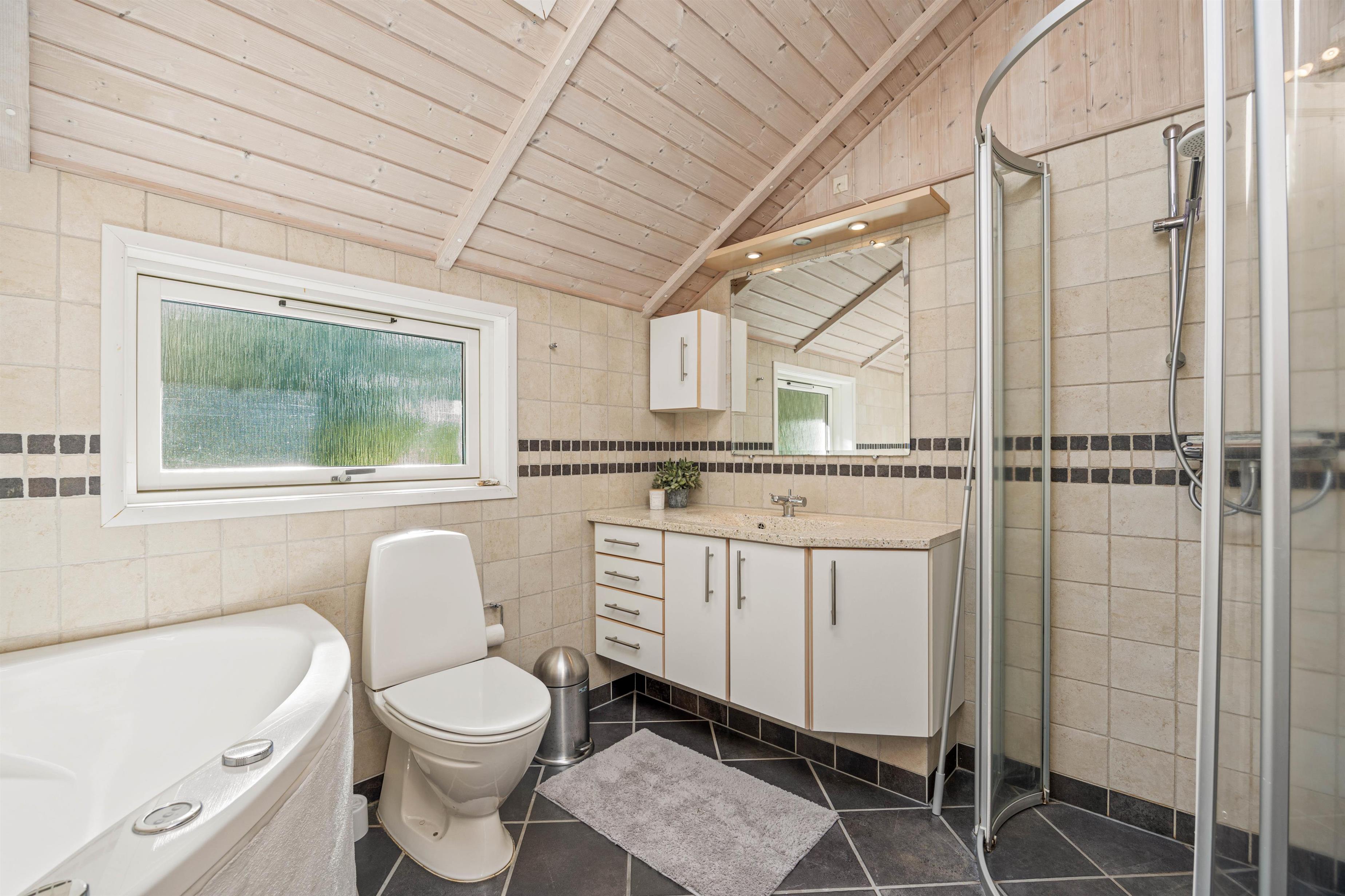 Badeværelset er udstyret med både spabad og sauna, så I kan nyde velvære og afslapning efter en aktiv feriedag. Dertil kommer et gæstetoilet, og begge rum har gulvvarme, som gør det ekstra behageligt – særligt i ydersæsonerne.