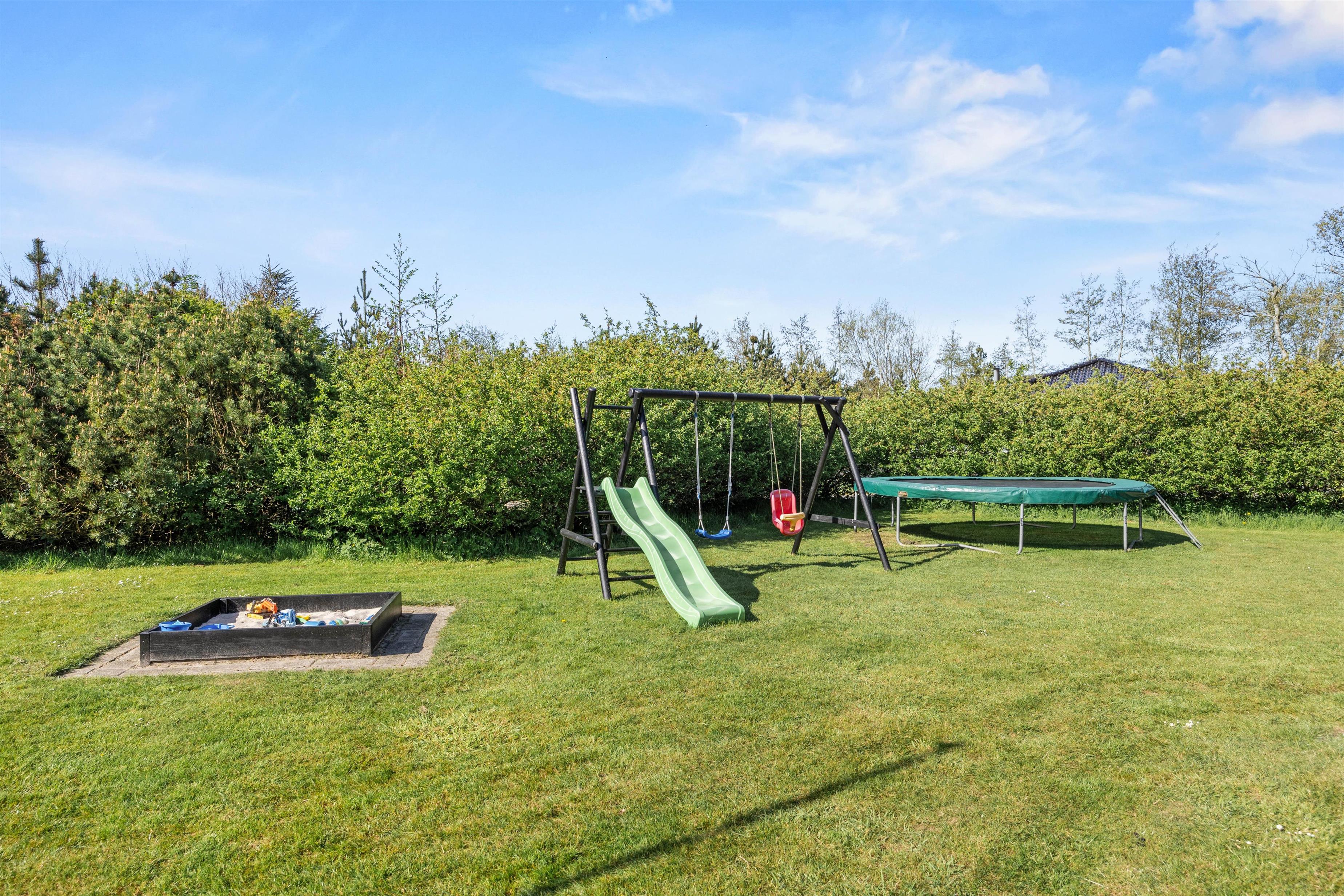 Grunden omkring Lykkebo er anlagt med en stor plæne, hvor der er plads til leg og bevægelse. For de yngste er der trampolin, gynge og sandkasse, som lægger op til mange timers sjov. Til bilen er der carport, og med ladestik til elbil er det nemt at holde bilen opladt til udflugterne - eget ladekabel medbringes (type 2).