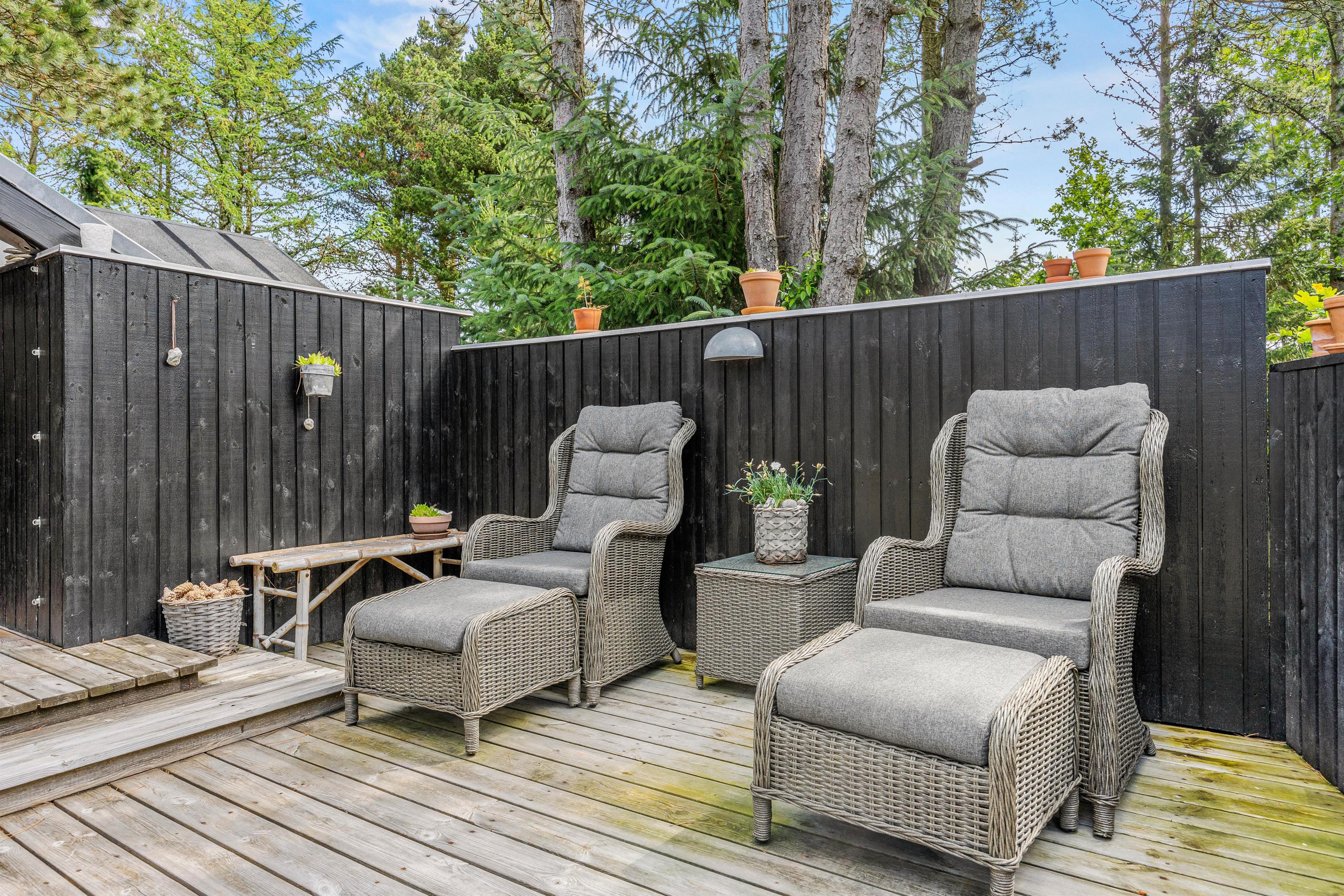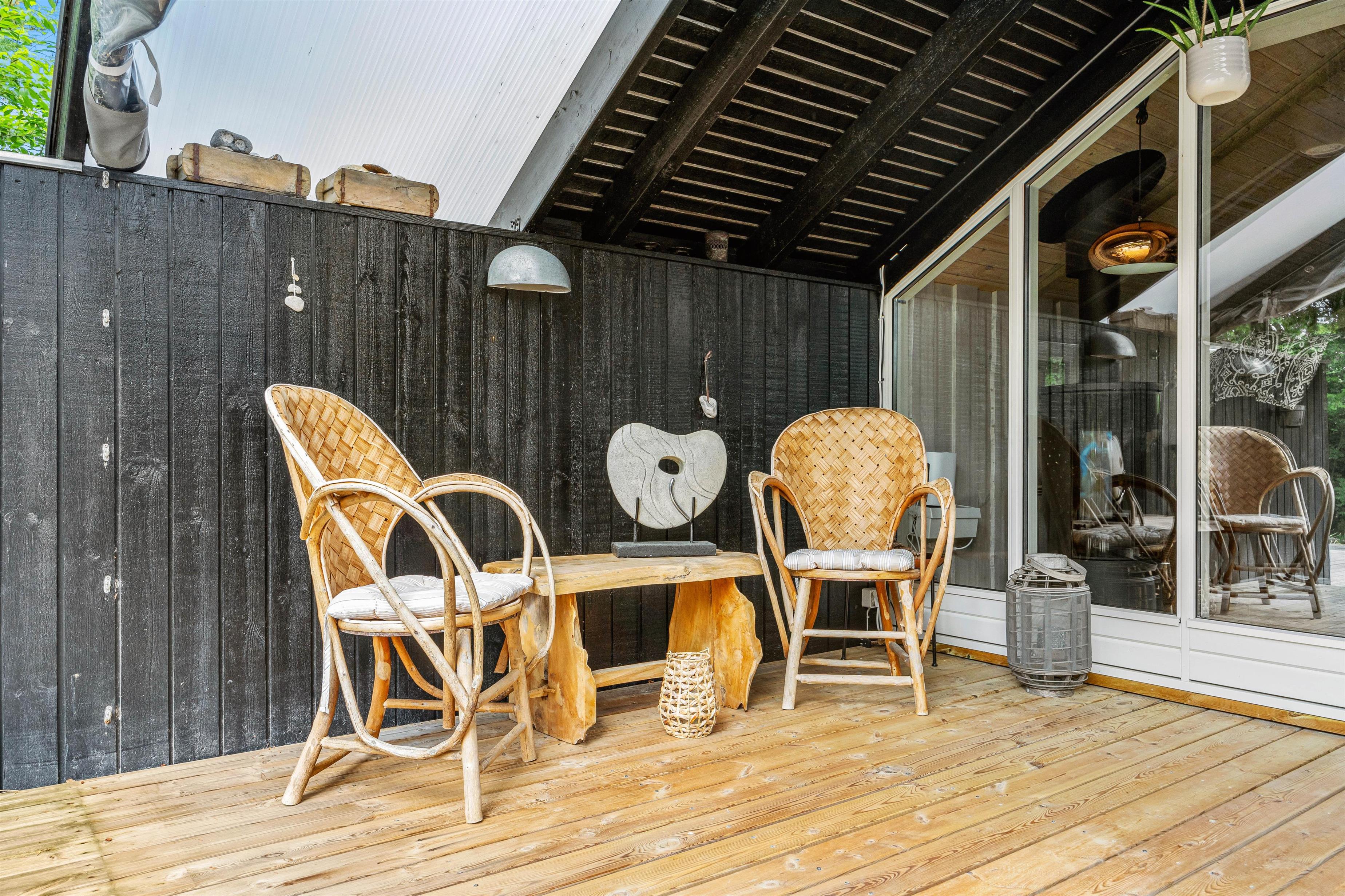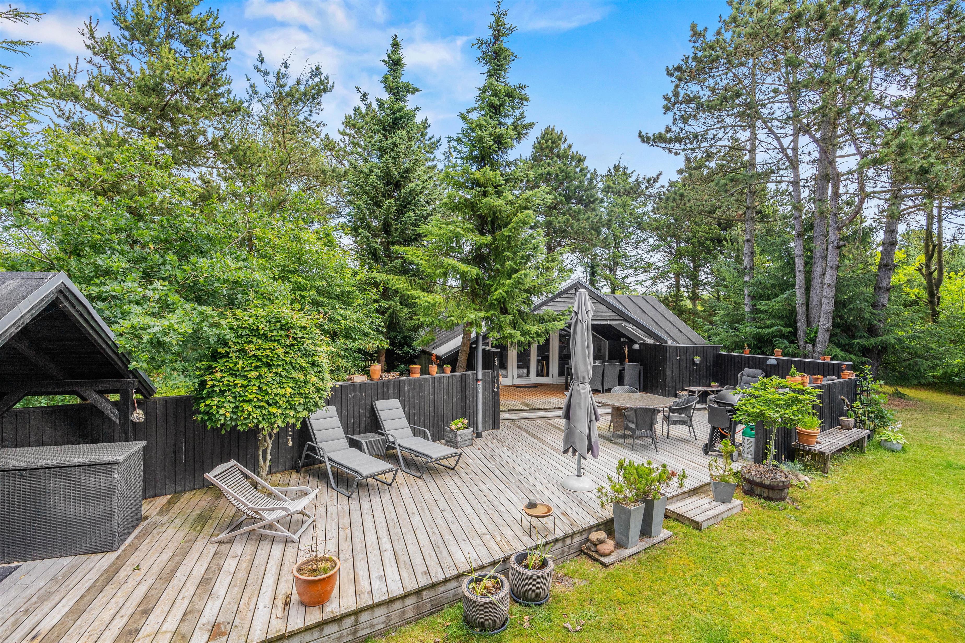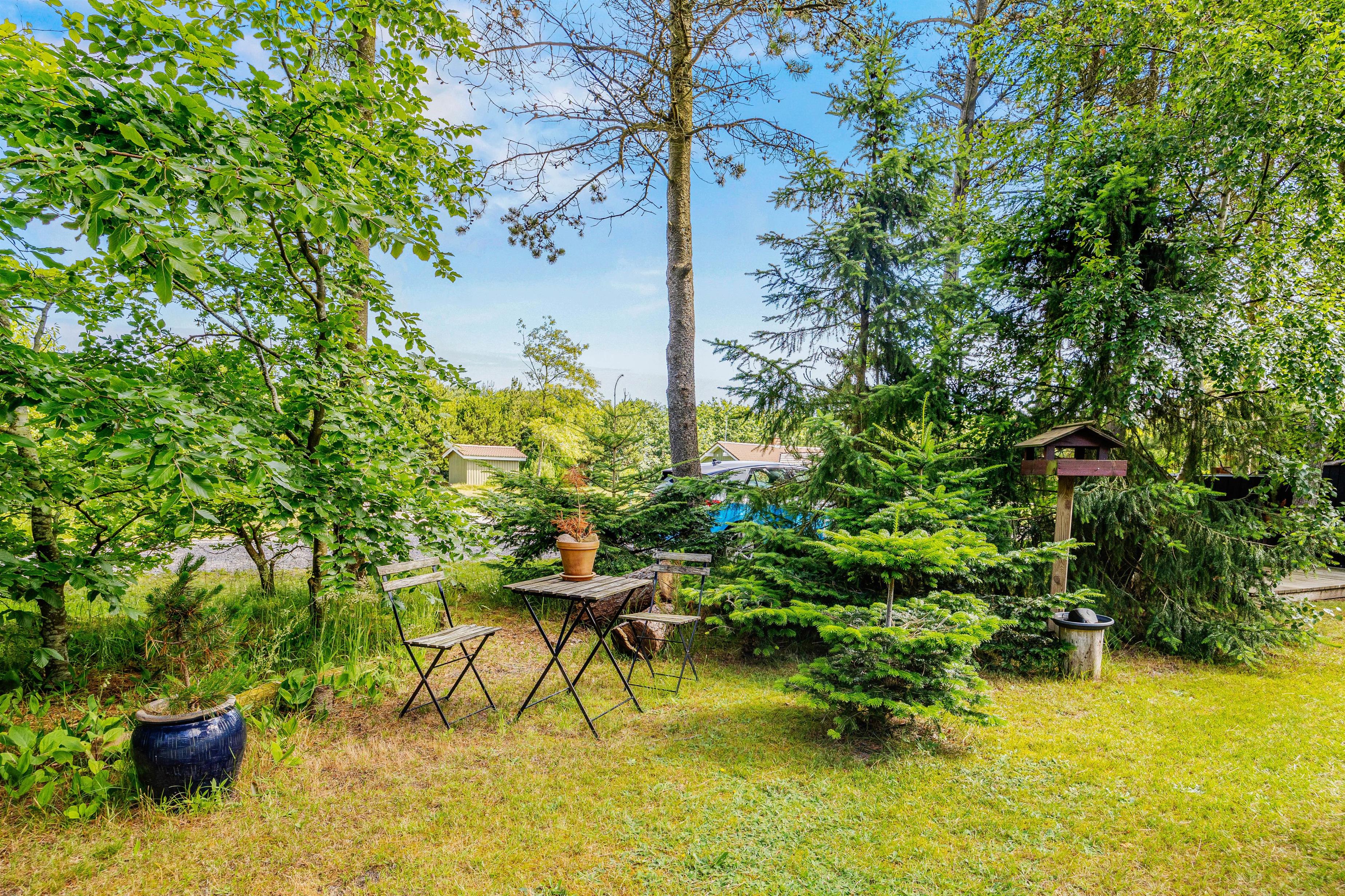 Også sommerhusets grund er yderst veludnyttet: rundt omkring i den hyggelige have er der placeret diverse siddepladser i adskillige hyggekroge: Her vil I uanset, hvor I befinder jer, opdage nye vinkler og skønne detaljer - i haven ligesom dens direkte omgivelse. Haven er delvis indhegnet, og kan I roligt lade børnene lege frit, imens I slapper af på den dejligt afskærmede terrasse. På træterrassen, som er direkte forbundet med sommerhuset, kan I mødes for at nyde hjemmelavede måltider på grillen eller også kan den bruges til at ligge i hængekøjen og holde øje med fugle og egern.
