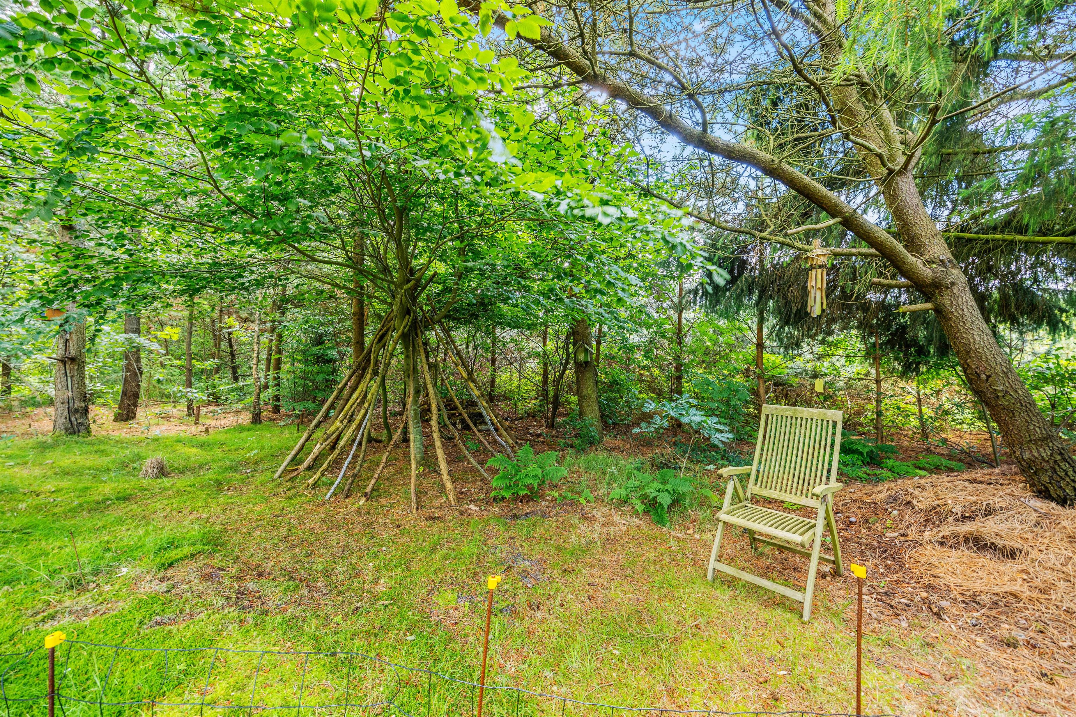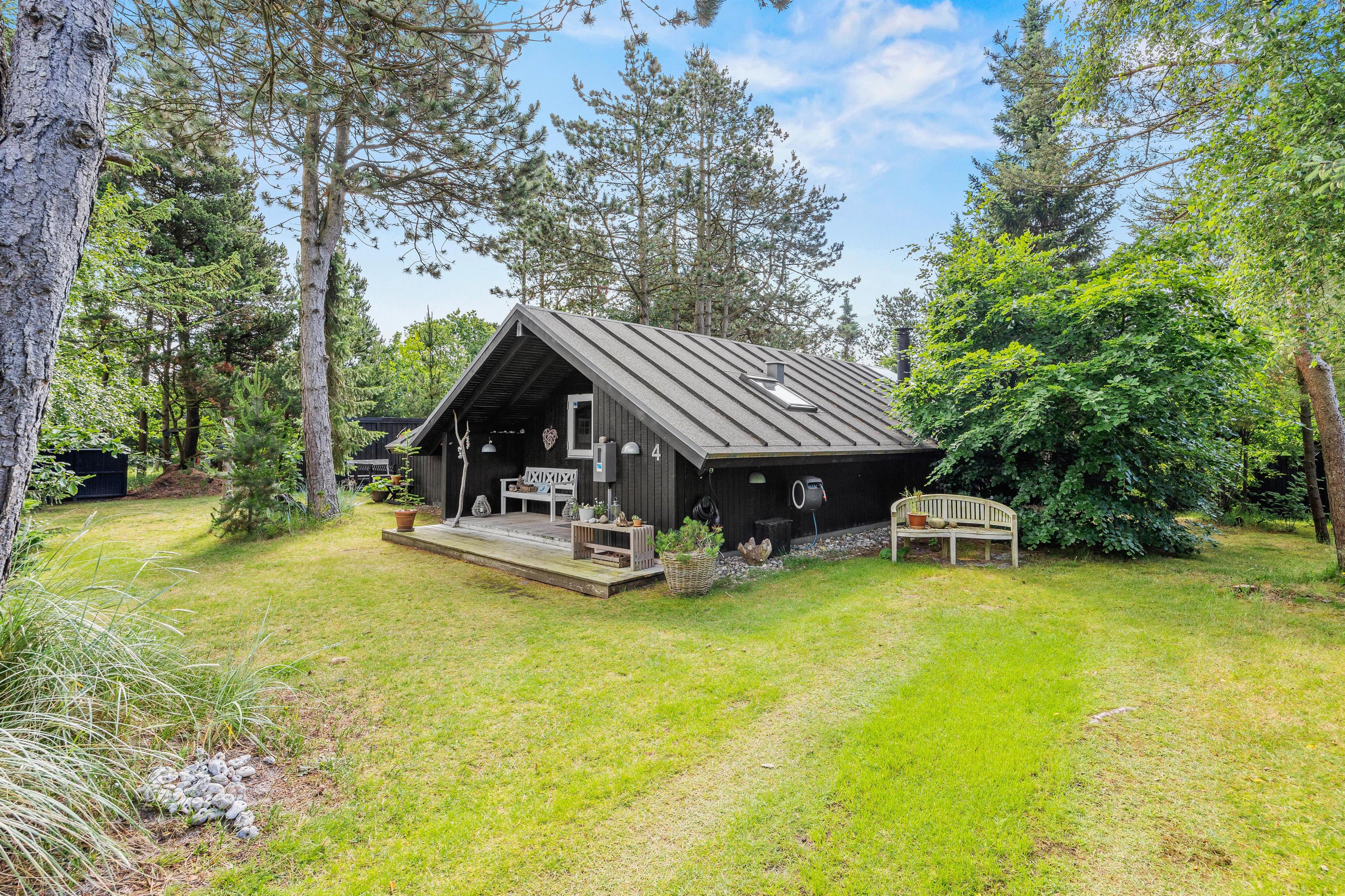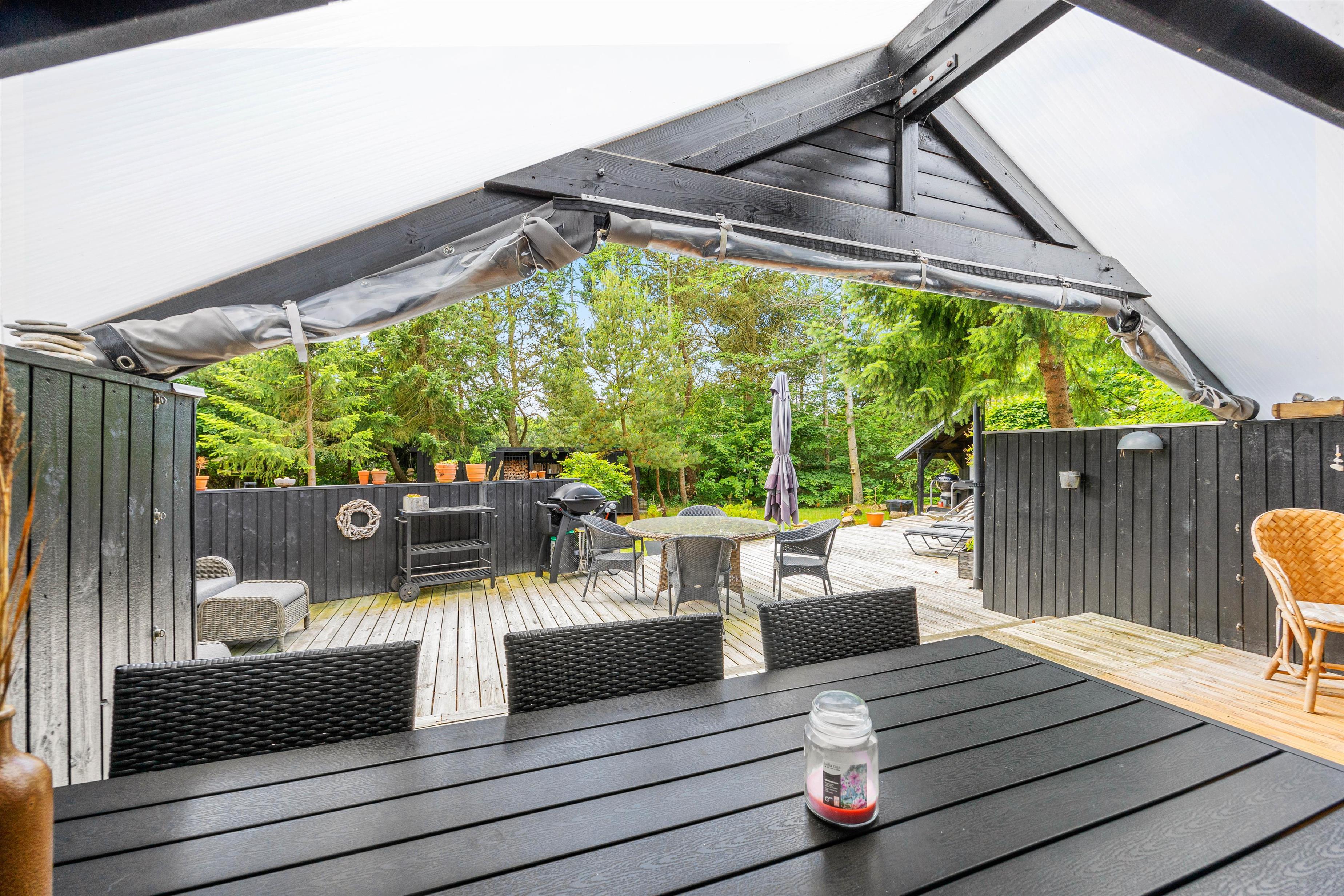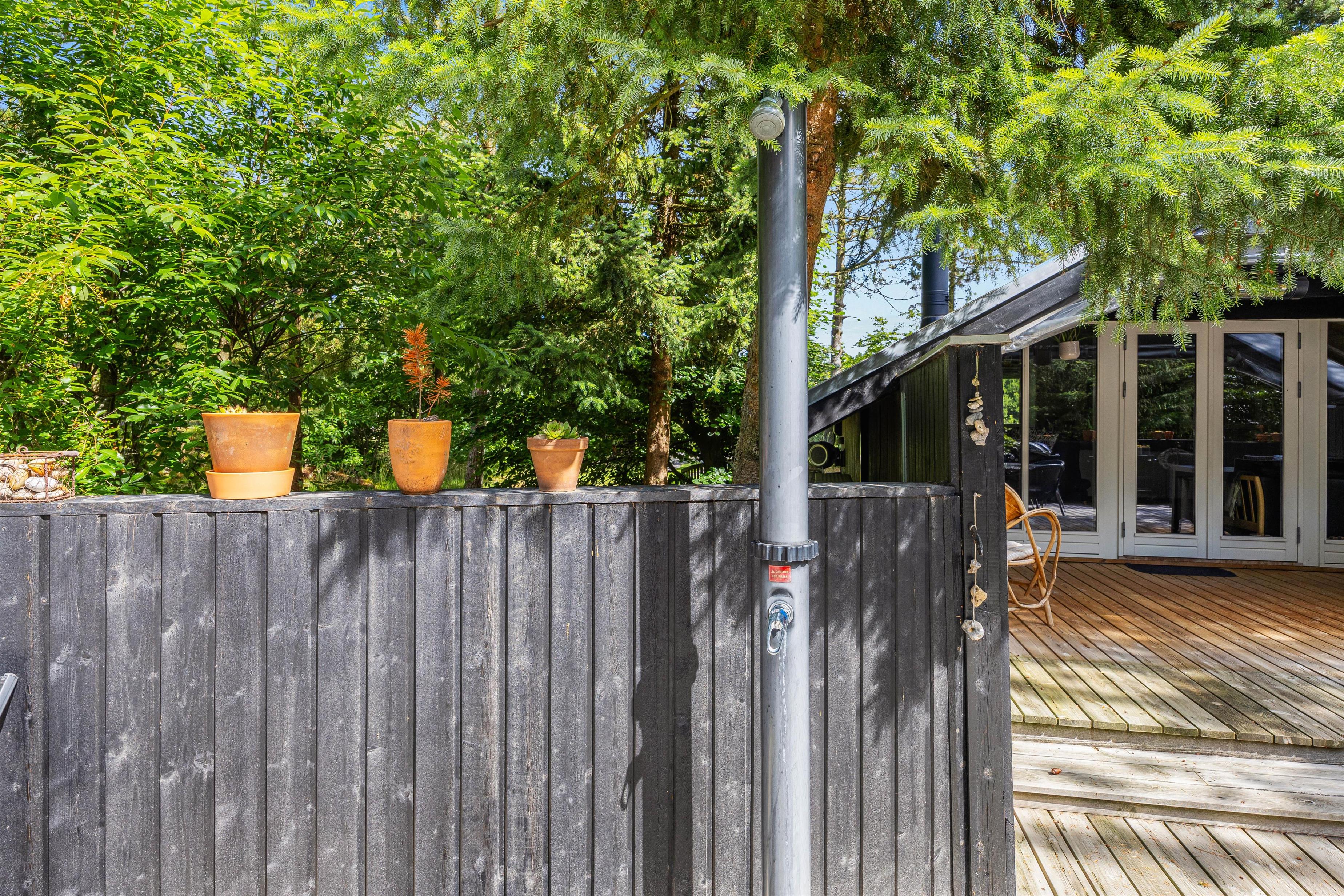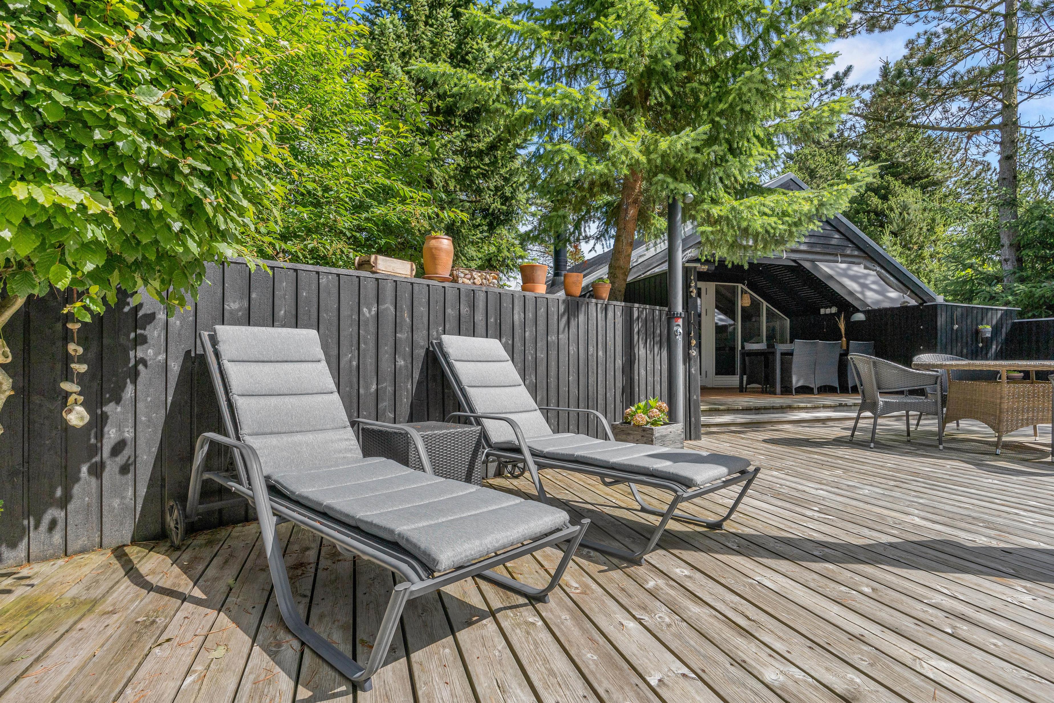 Også sommerhusets grund er yderst veludnyttet: rundt omkring i den hyggelige have er der placeret diverse siddepladser i adskillige hyggekroge: Her vil I uanset, hvor I befinder jer, opdage nye vinkler og skønne detaljer - i haven ligesom dens direkte omgivelse. Haven er delvis indhegnet, og kan I roligt lade børnene lege frit, imens I slapper af på den dejligt afskærmede terrasse. På træterrassen, som er direkte forbundet med sommerhuset, kan I mødes for at nyde hjemmelavede måltider på grillen eller også kan den bruges til at ligge i hængekøjen og holde øje med fugle og egern.
