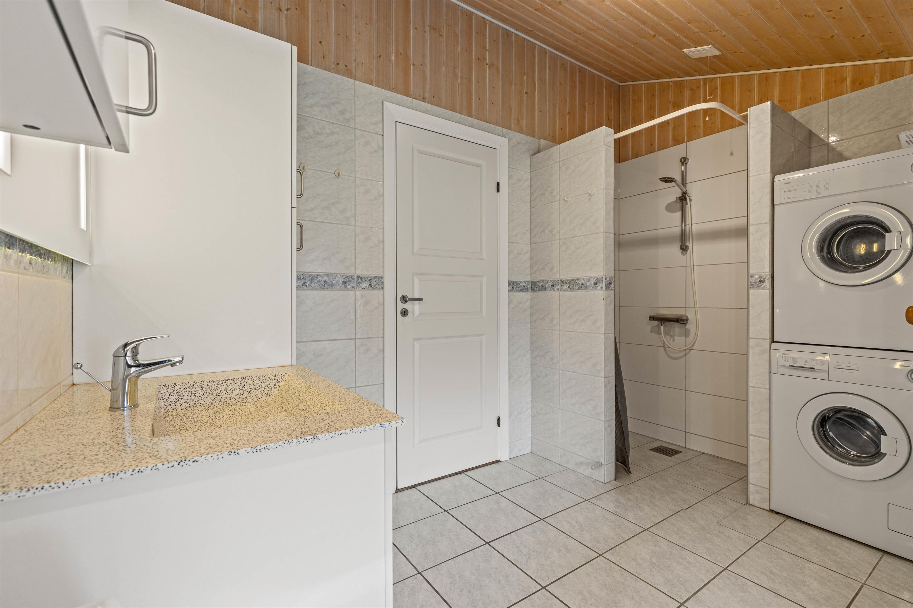 Der er vaskemaskine, tørretumbler og en energibesparende varmepumpe i sommerhuset.