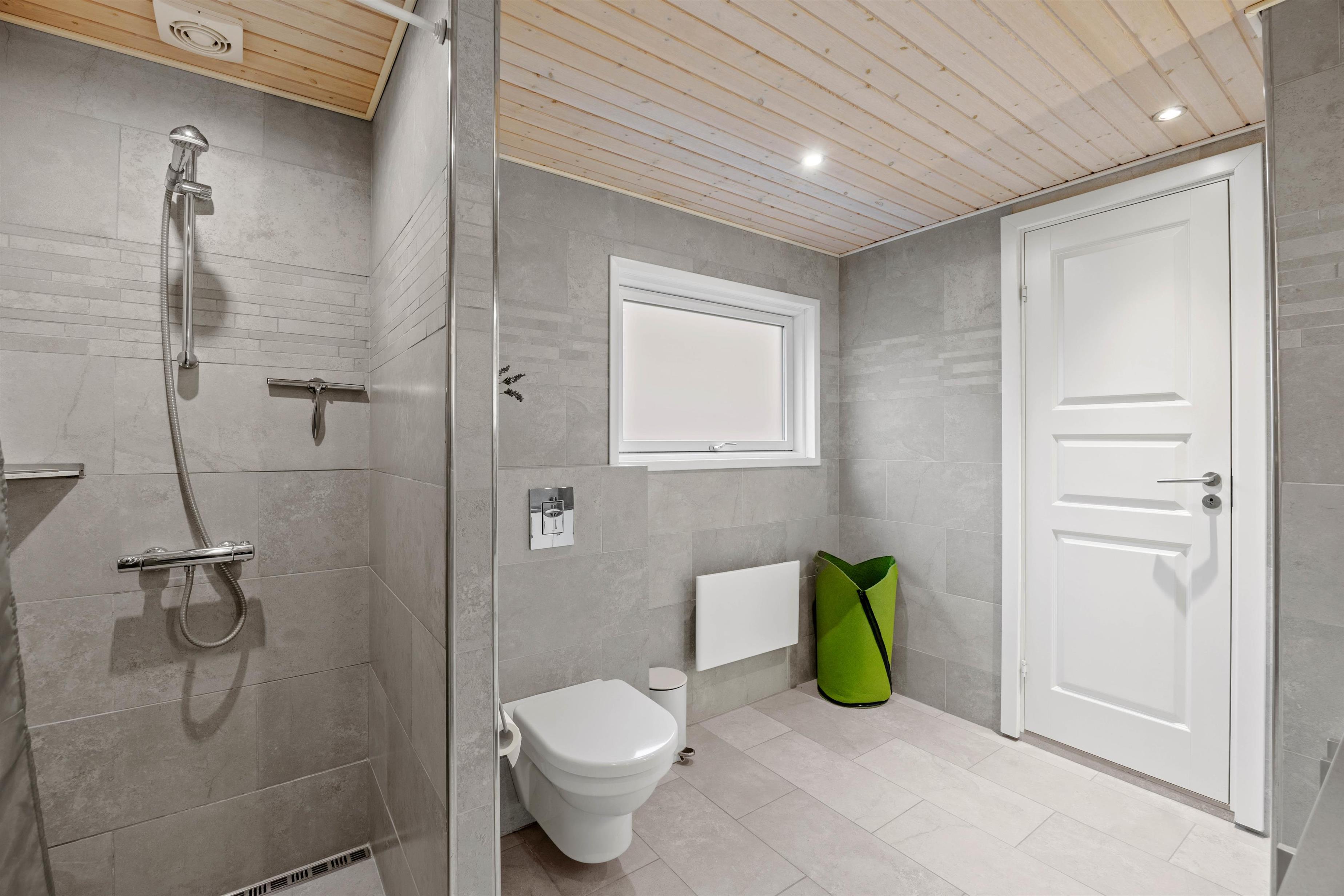 På badeværelset er der gulvvarme, så I ikke kommer til at fryse jeres fødder, når der skal børstes tænder om morgenen, og her står også vaskemaskinen, som er ekstra praktisk til børnefamilierne.