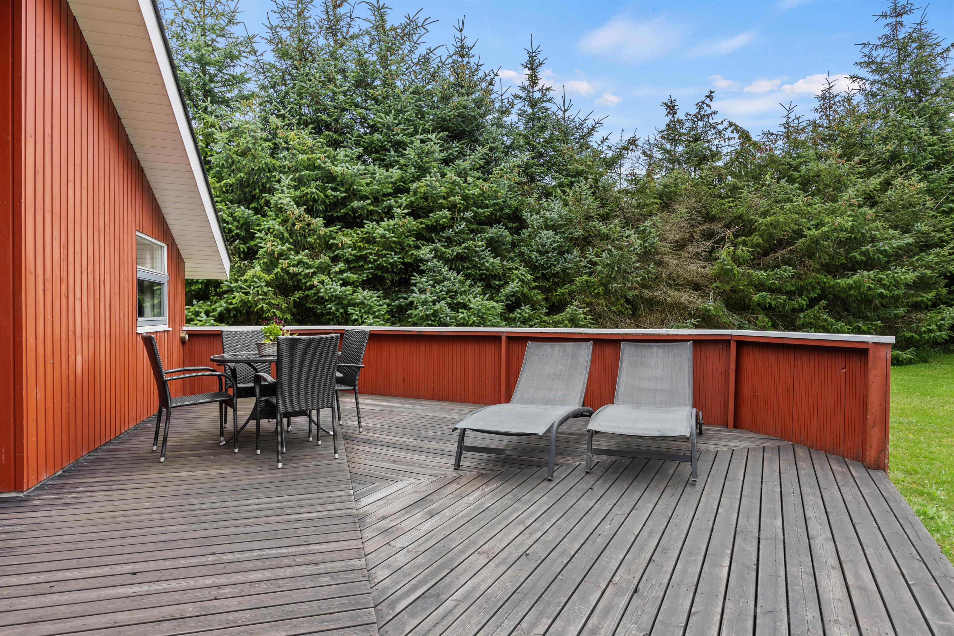 I hver ende af sommerhuset finder I en dejlig terrasse, den ene delvist overdækket og den anden åben. Her står havemøblerne og liggestolene klar, så I kan nyde de varme solskinsdage i fulde drag.