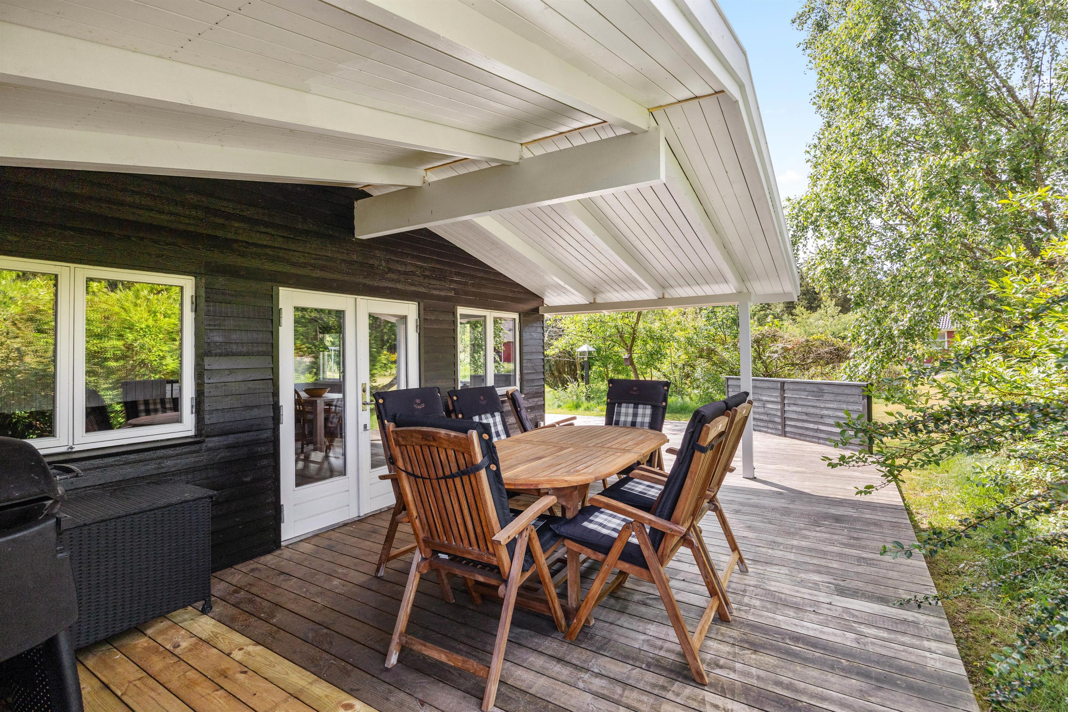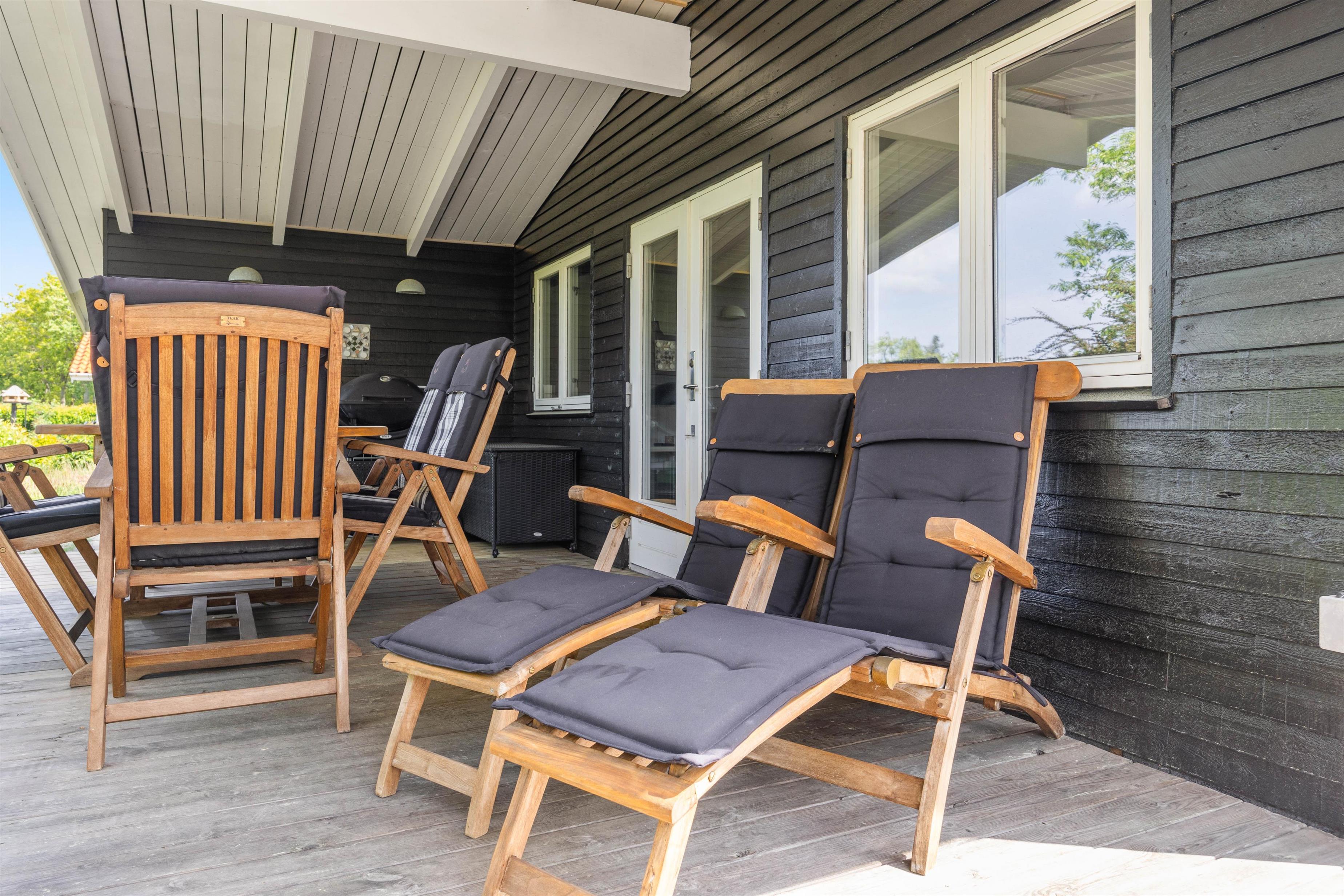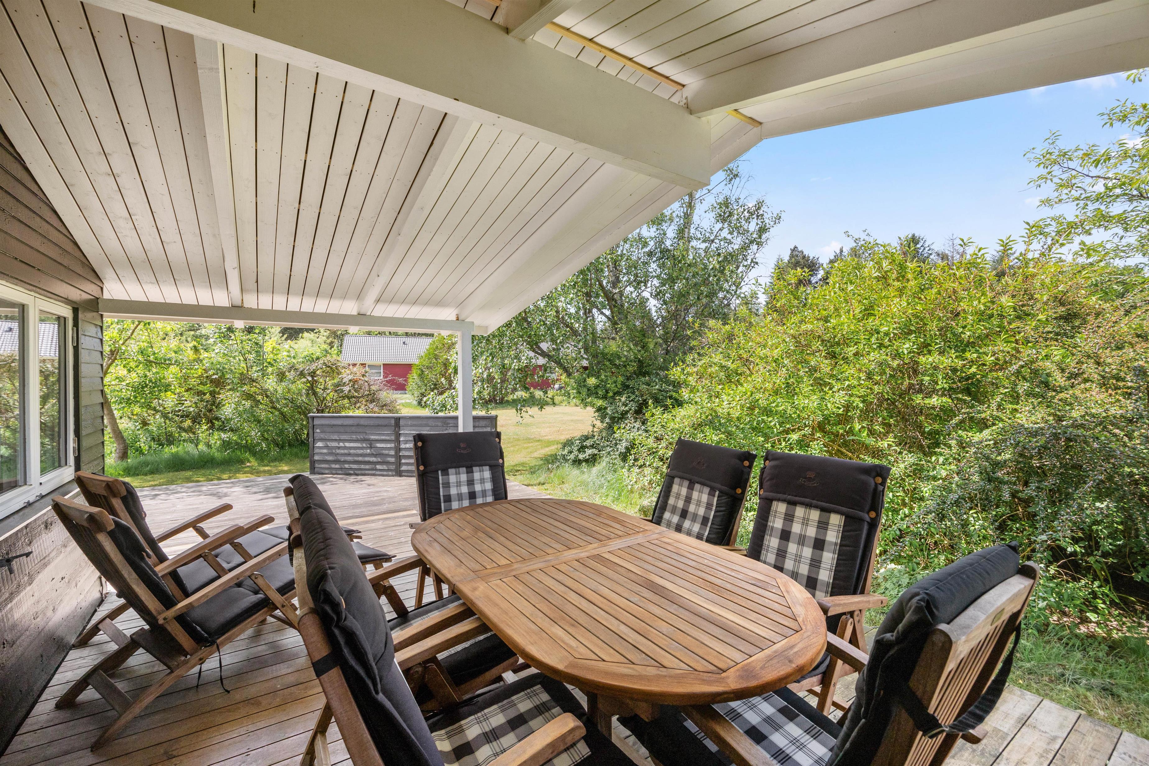 Fra stuen kommer I ud på den delvist overdækkede terrasse, som er udstyret med gode havemøbler. Her kan I spise en lækker morgenmad i solen og lytte til fuglenes kvidren i træerne på de varme dage. Den store græsplæne byder også på god plads til leg og boldspil for de små feriegæster, mens I ser til fra liggestolene og nyder den friske luft.