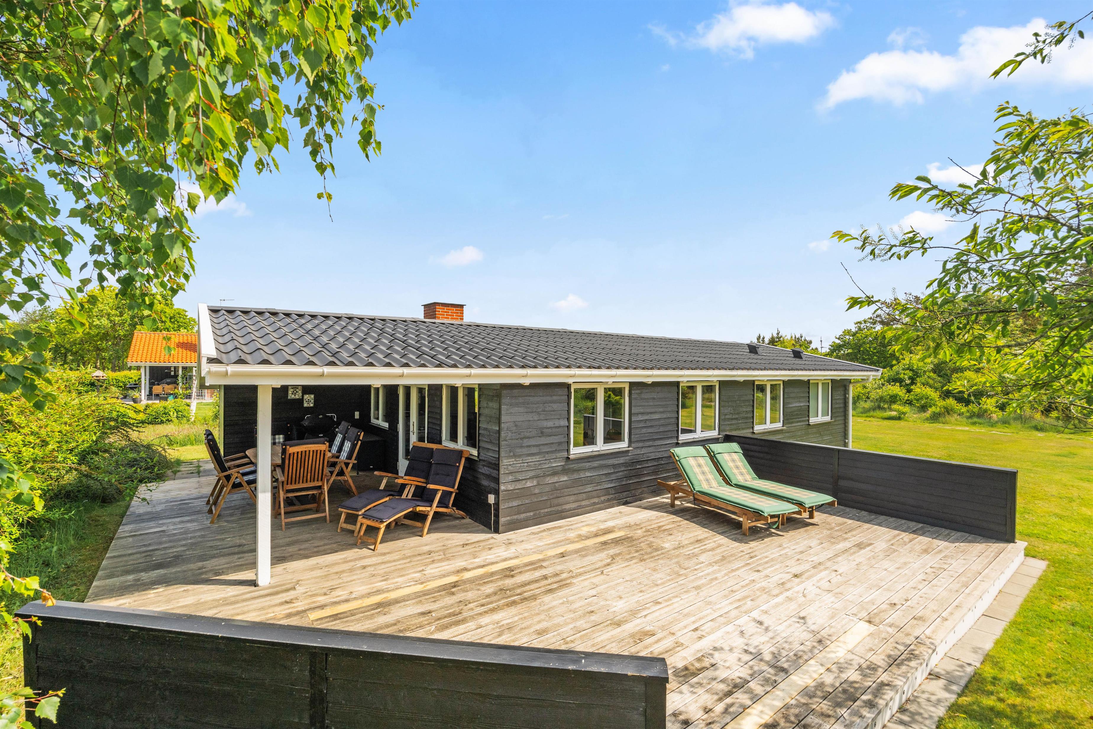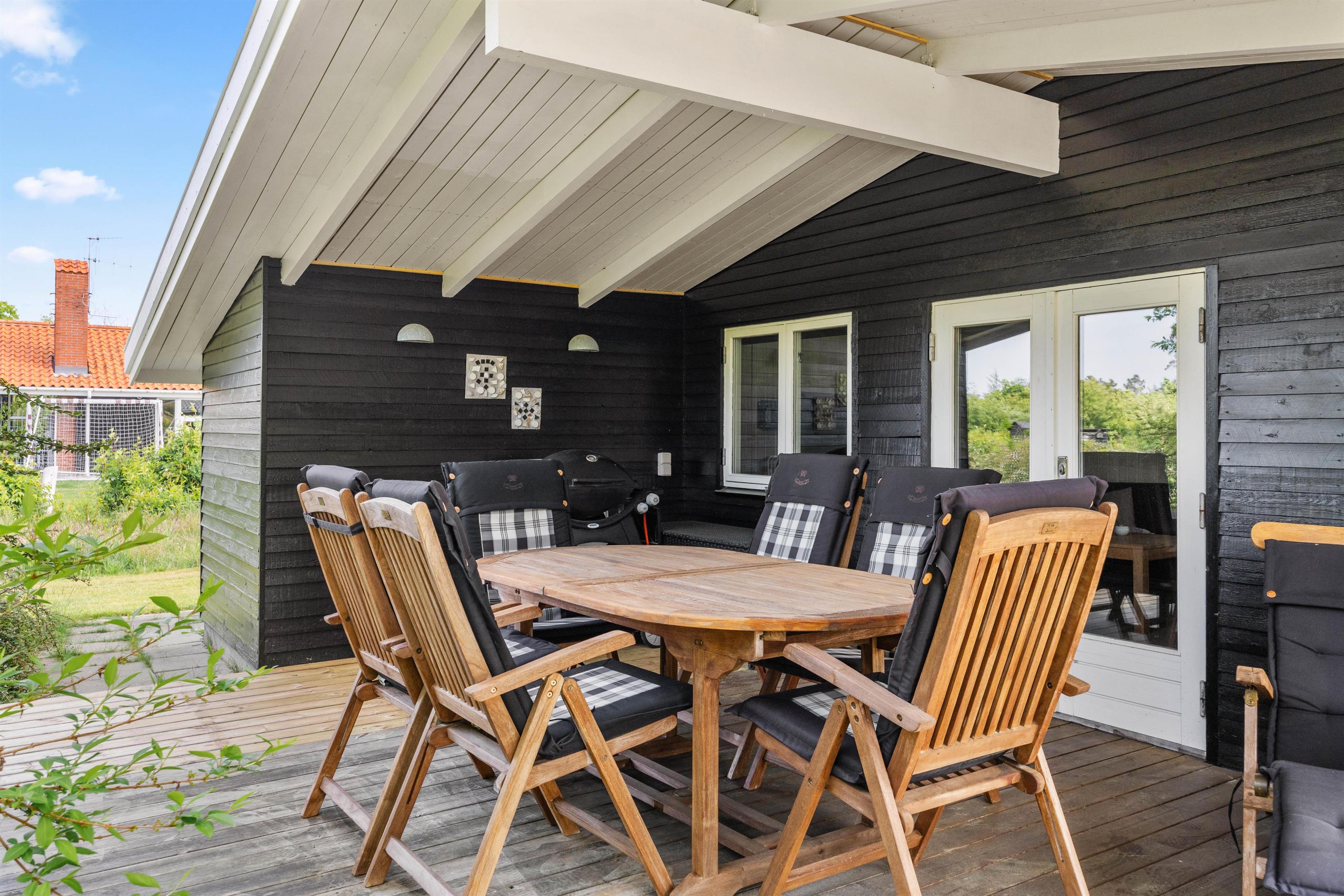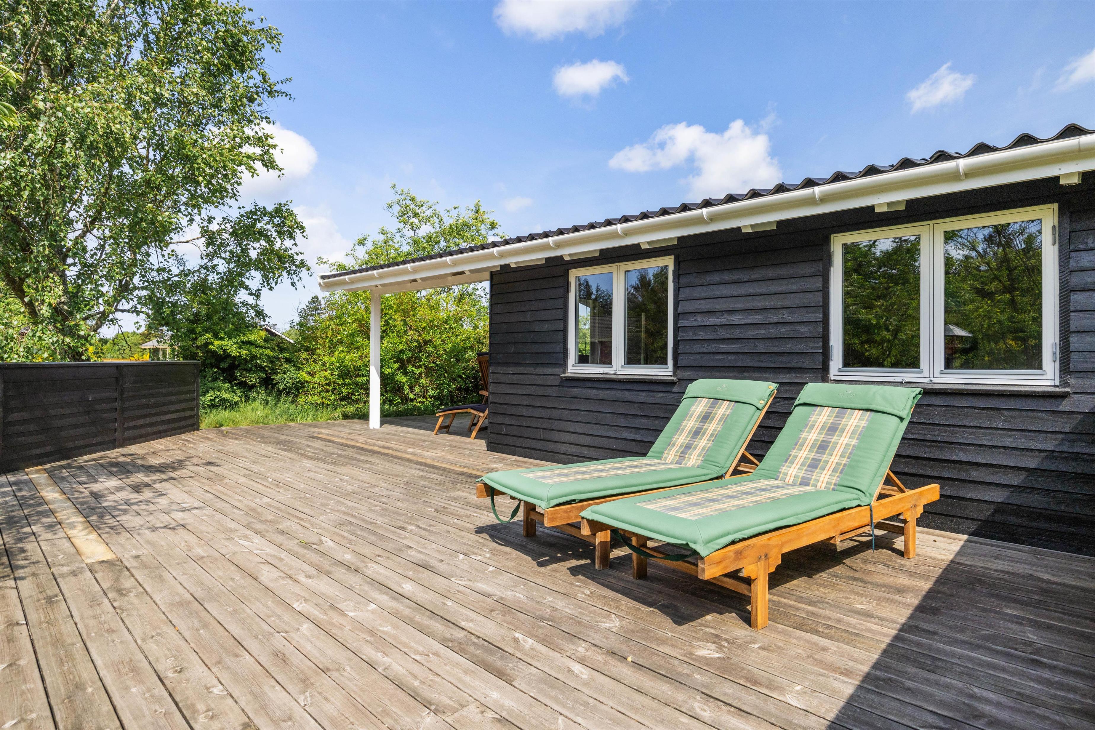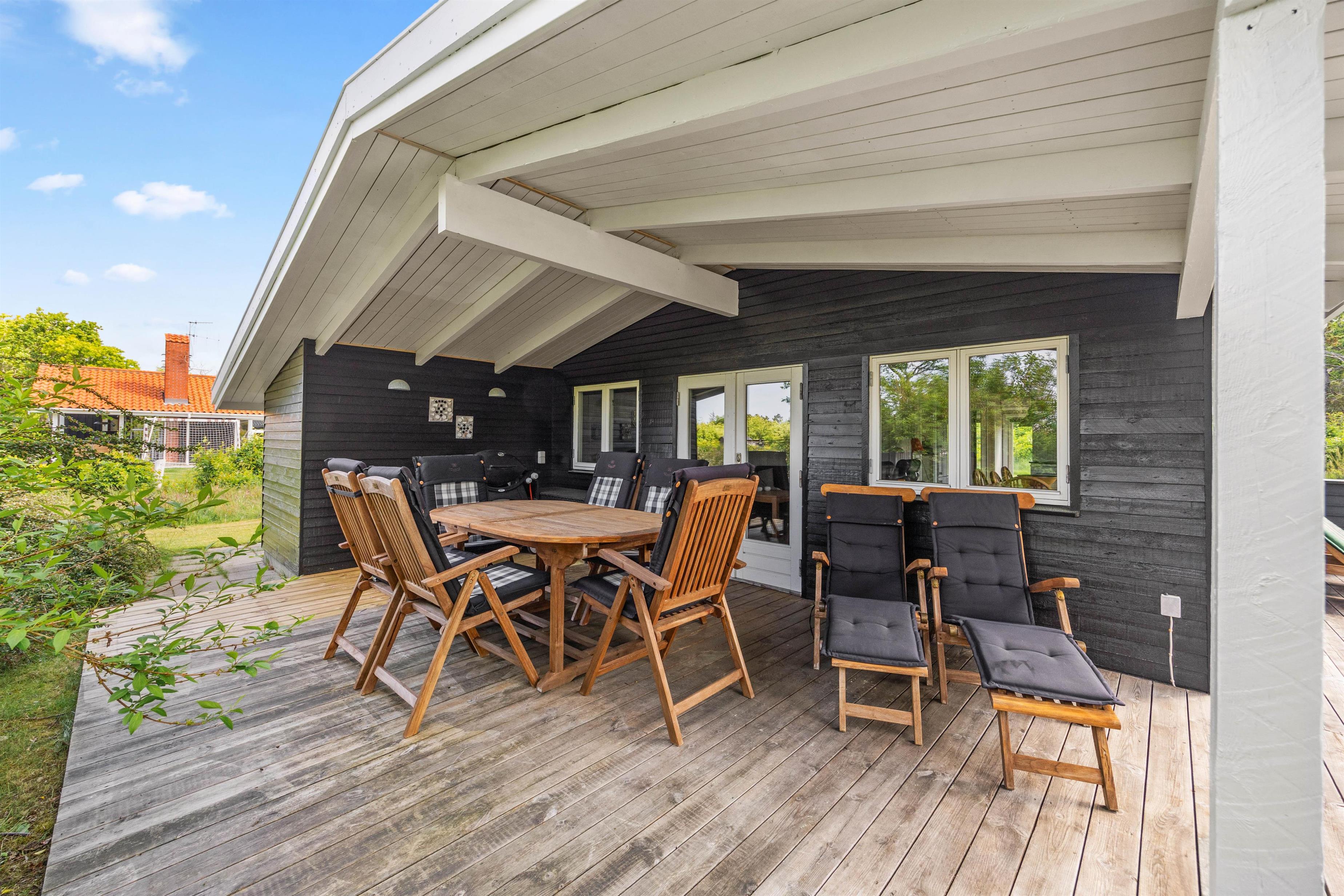 Fra stuen kommer I ud på den delvist overdækkede terrasse, som er udstyret med gode havemøbler. Her kan I spise en lækker morgenmad i solen og lytte til fuglenes kvidren i træerne på de varme dage. Den store græsplæne byder også på god plads til leg og boldspil for de små feriegæster, mens I ser til fra liggestolene og nyder den friske luft.