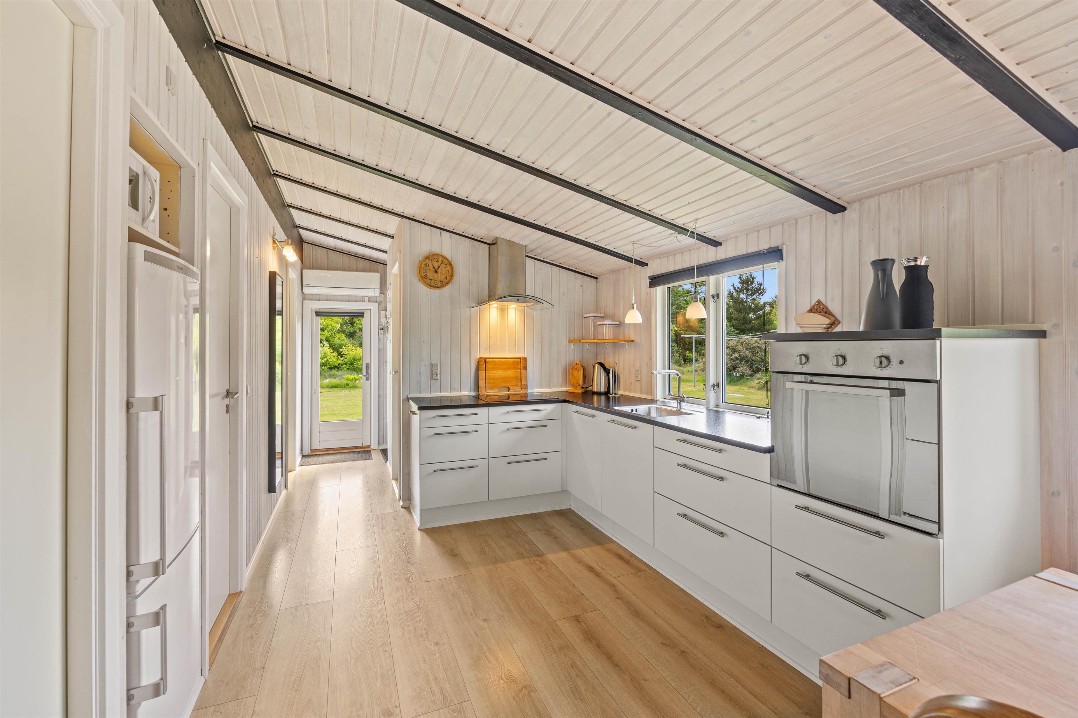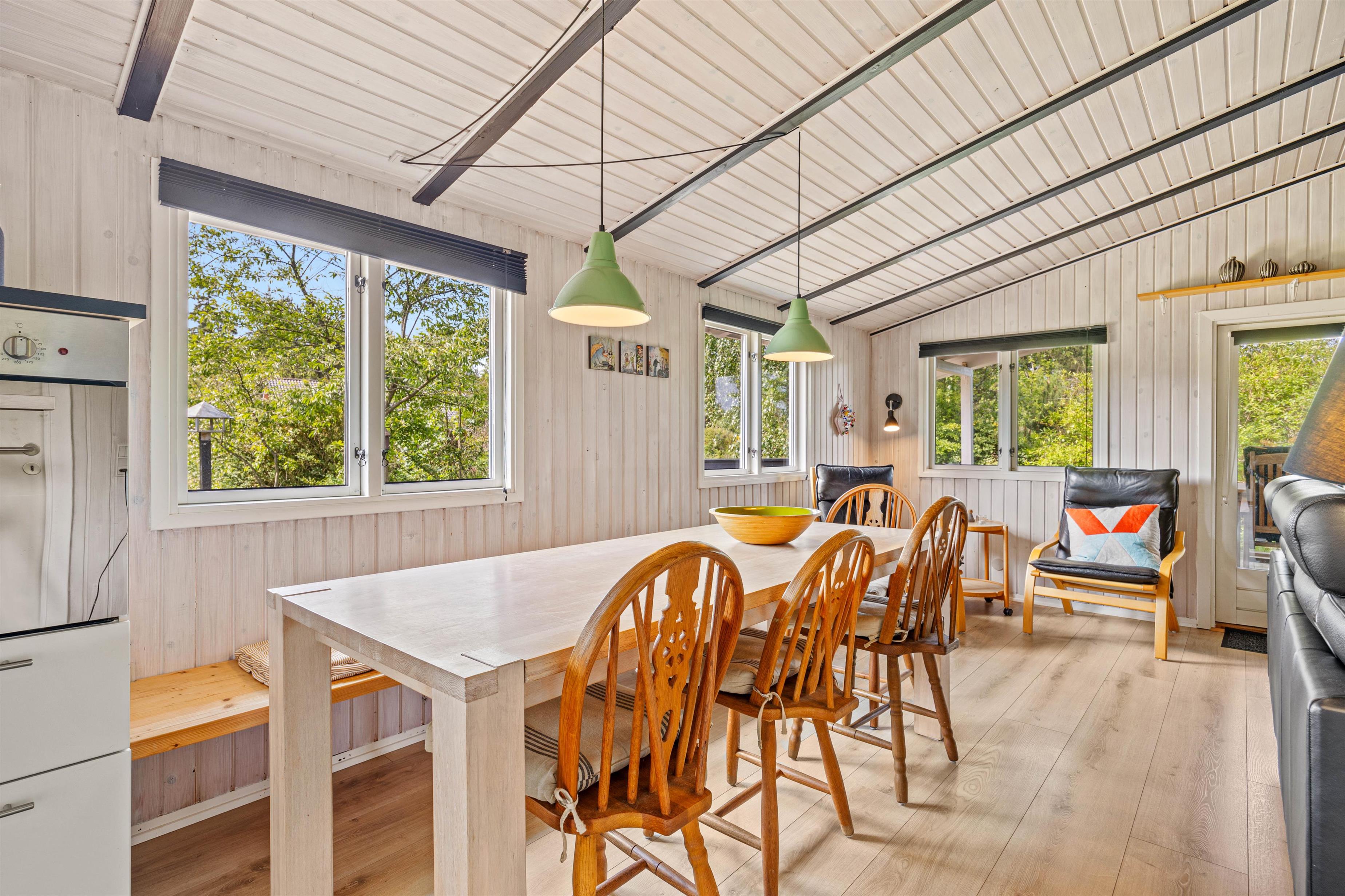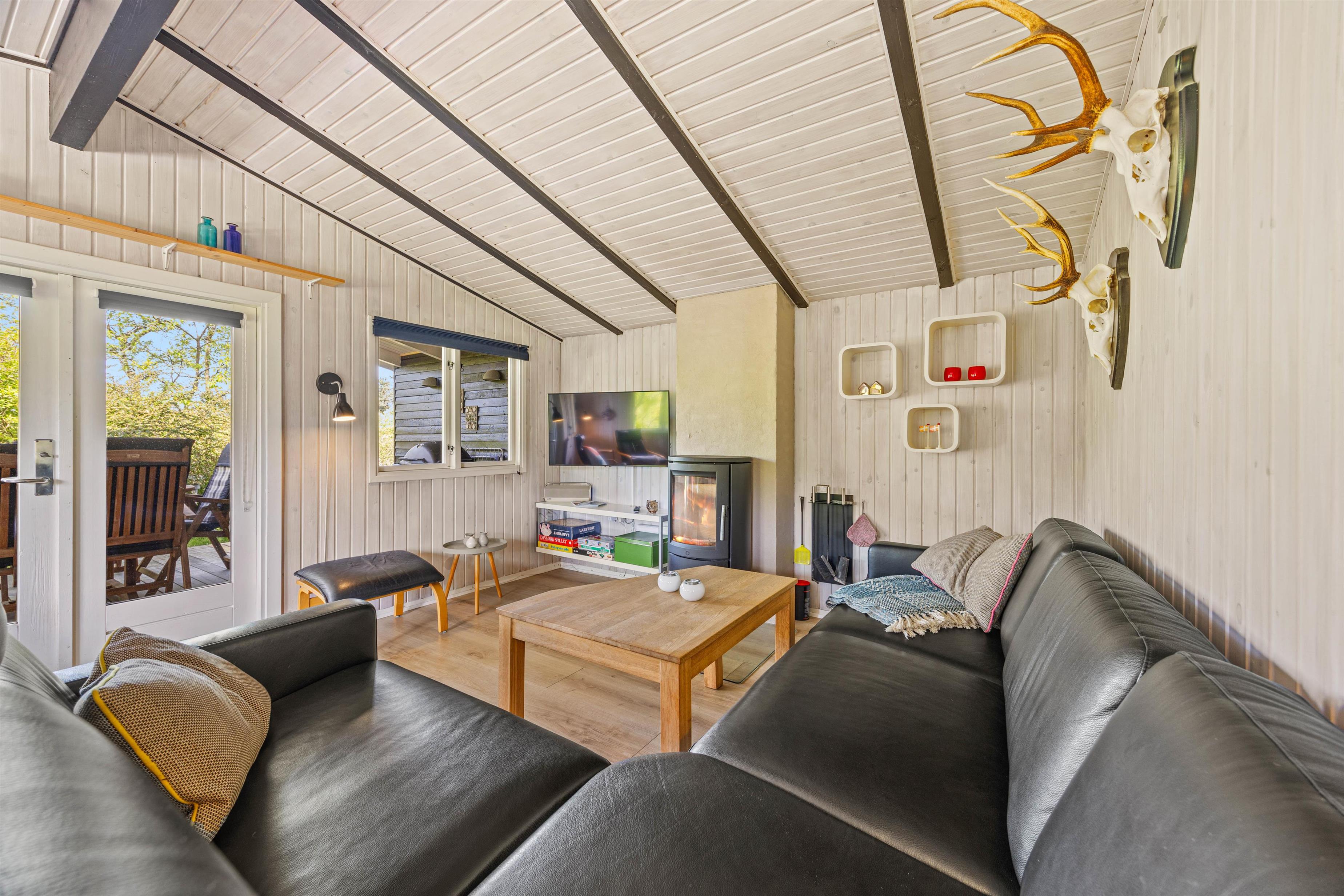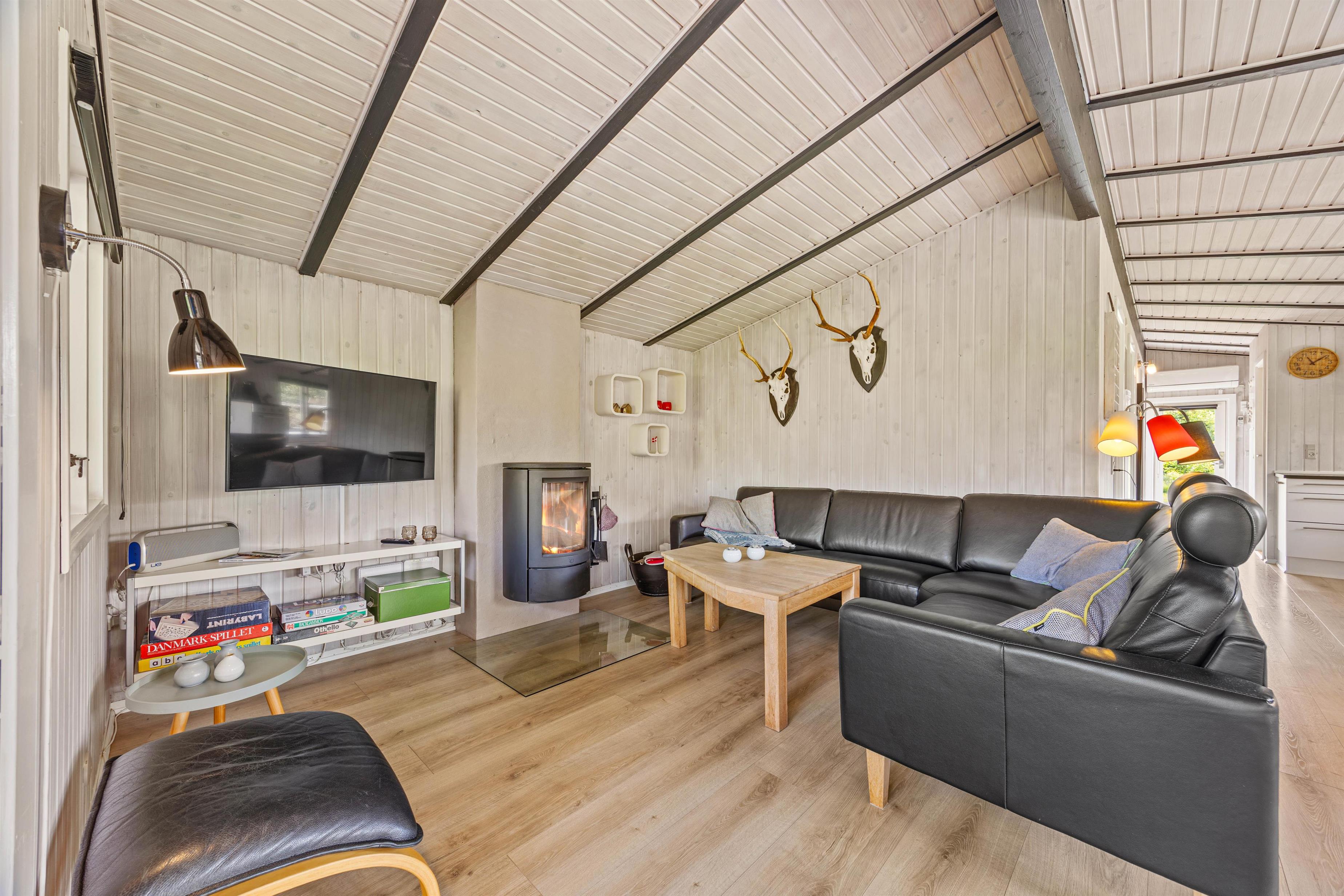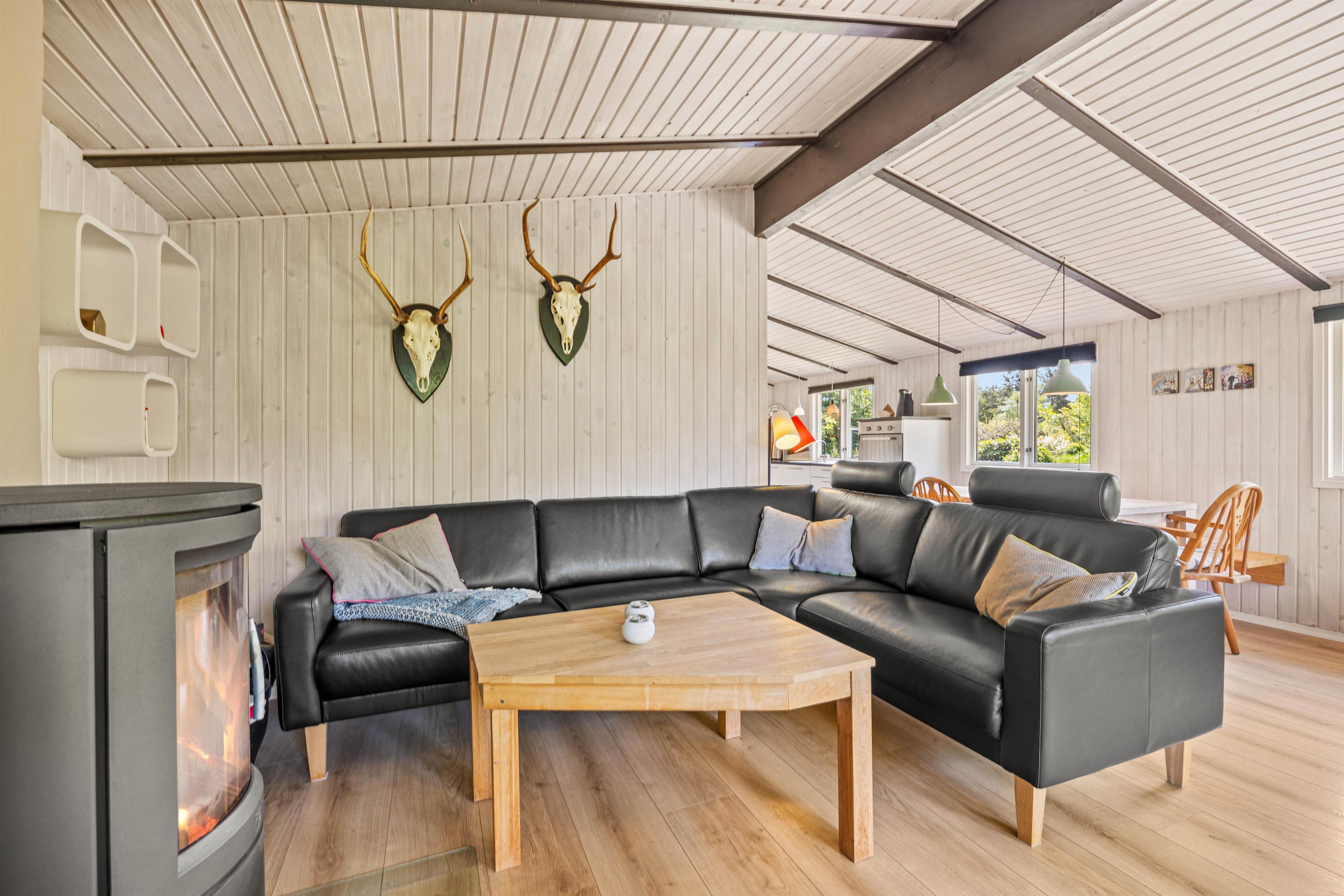Den lyse stue med det åbne, veludstyrede køkken indbyder til masser af familietid. Den venlige og moderne indretning og de mørke loftsbjælker som kontrast på de lyse trælofter tilfører omgivelserne den helt klassiske sommerhuscharme. På de kølige dage kan I sætte jer til rette foran den knitrende brændeovn og varme jer på en kop kakao.