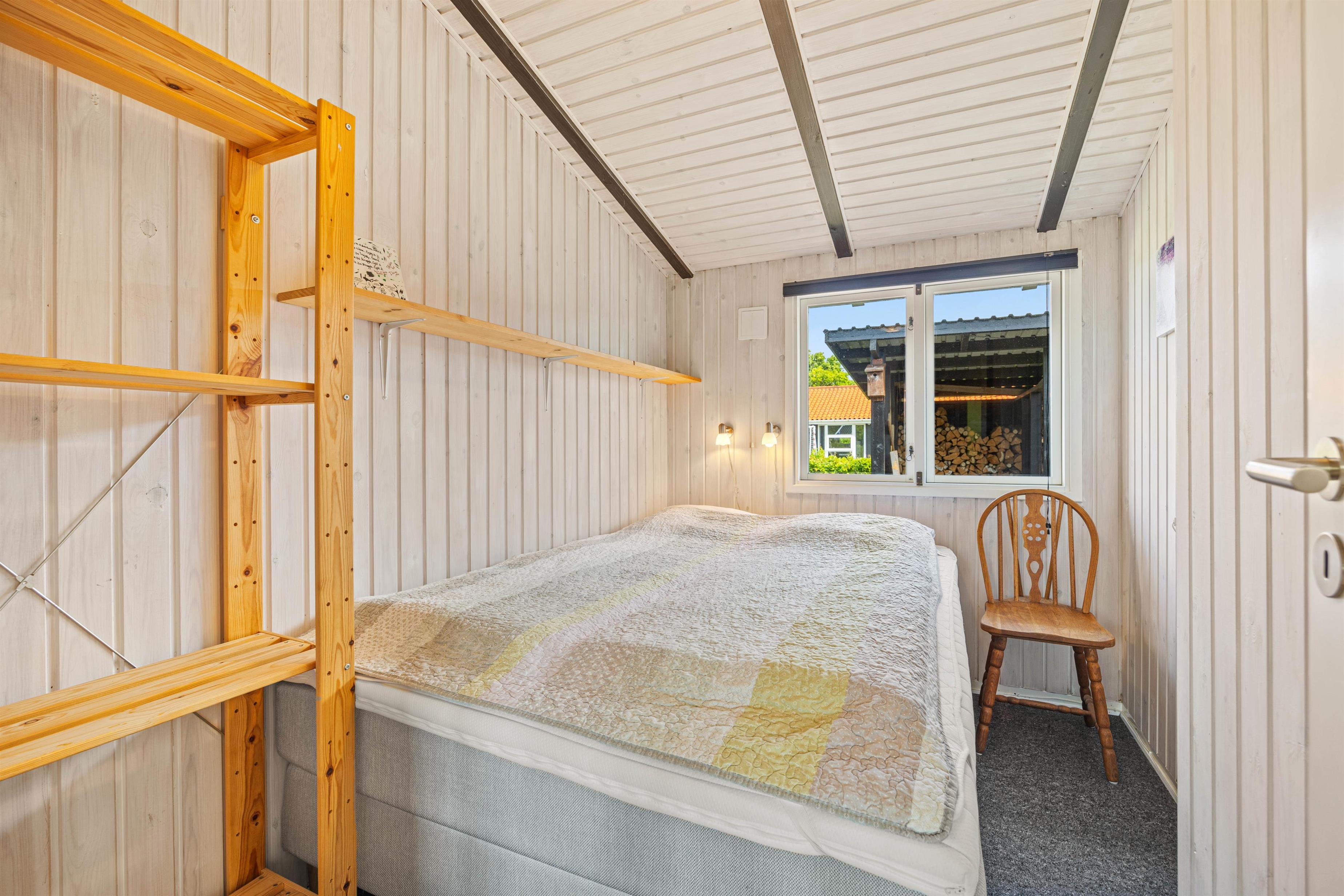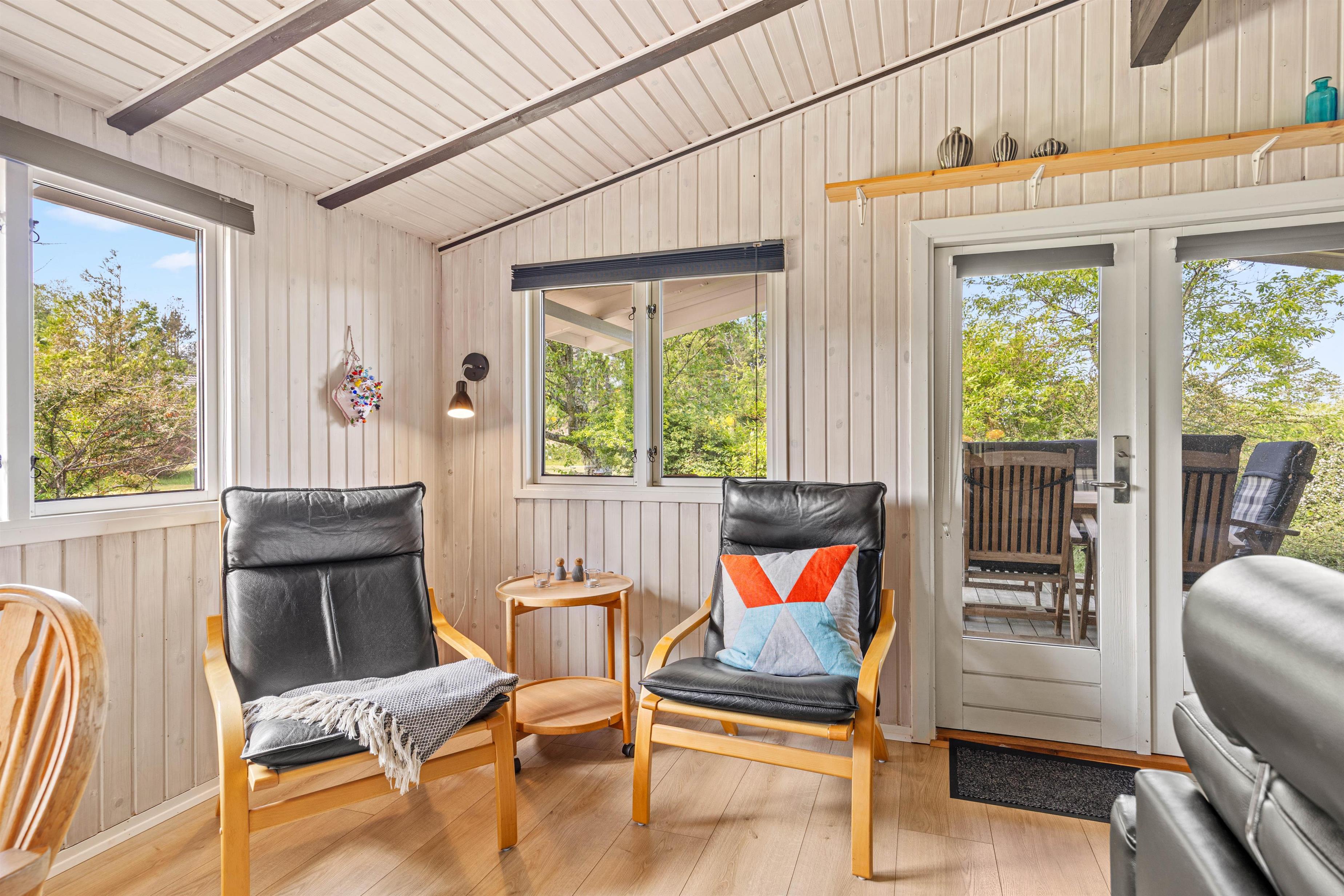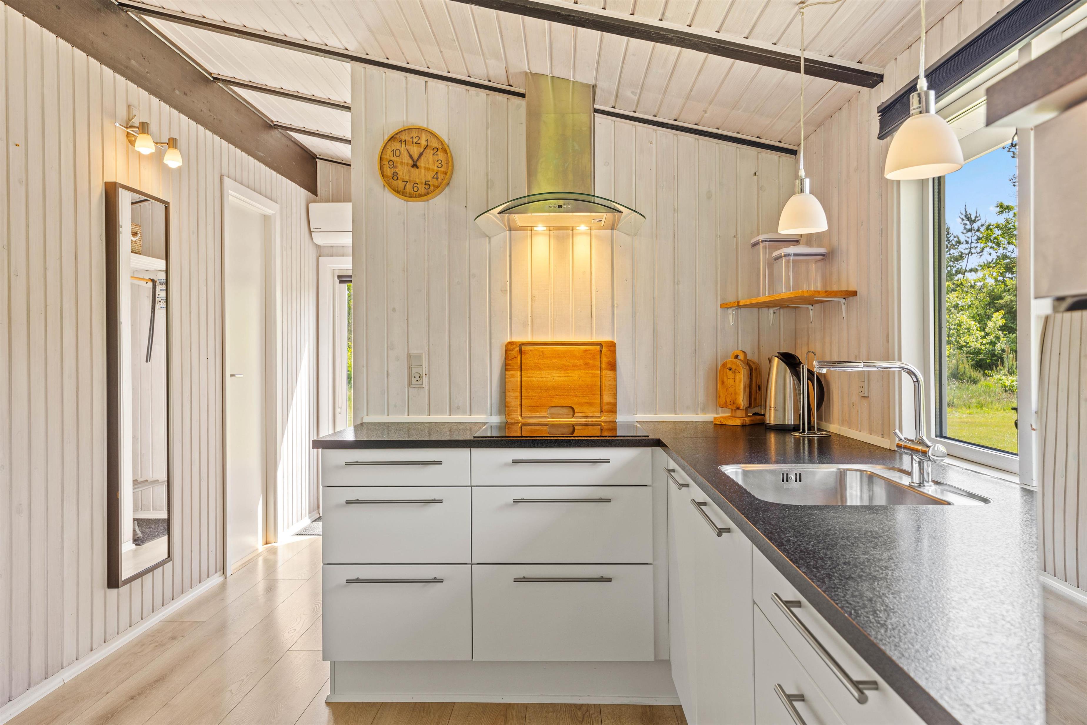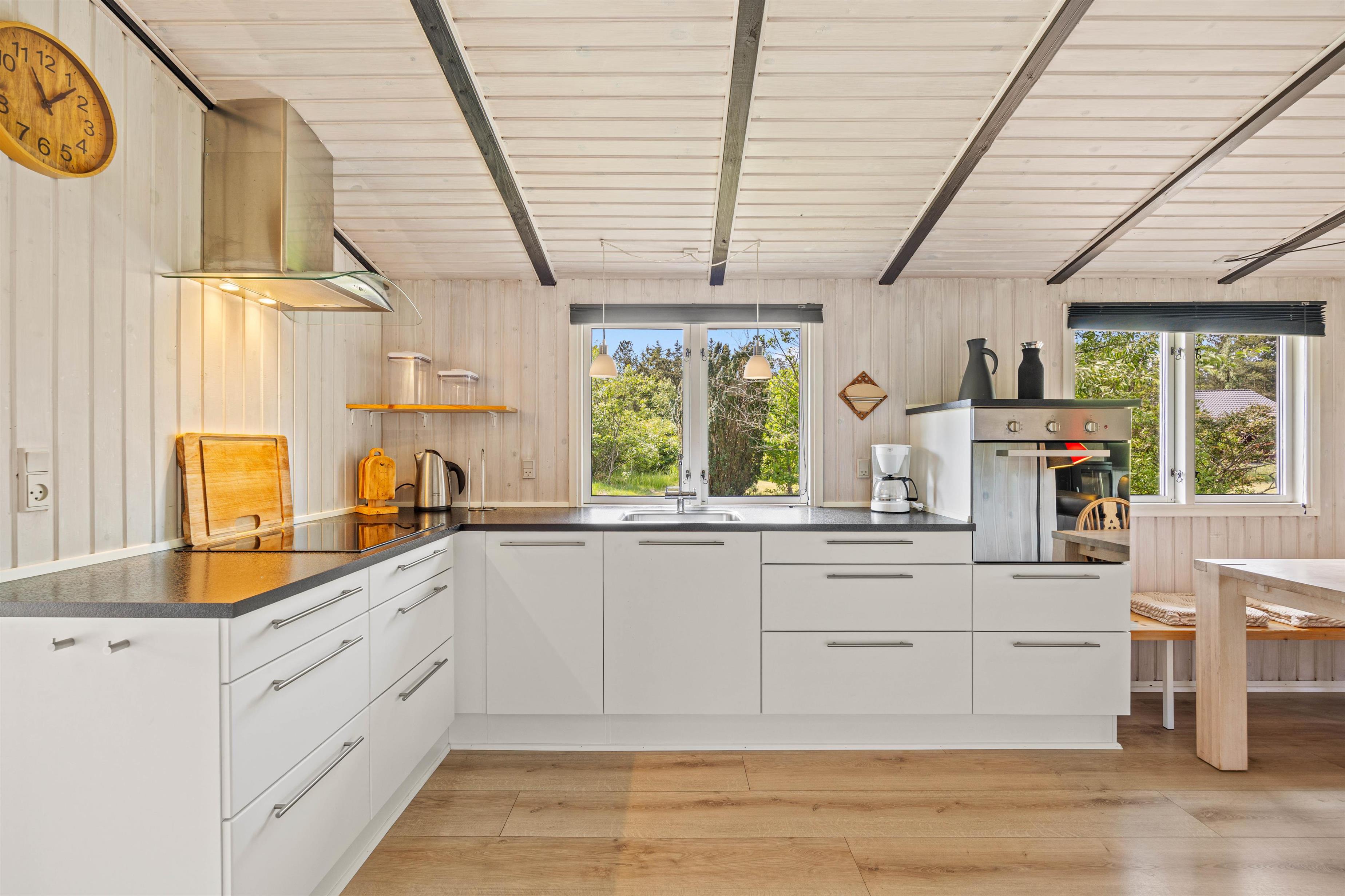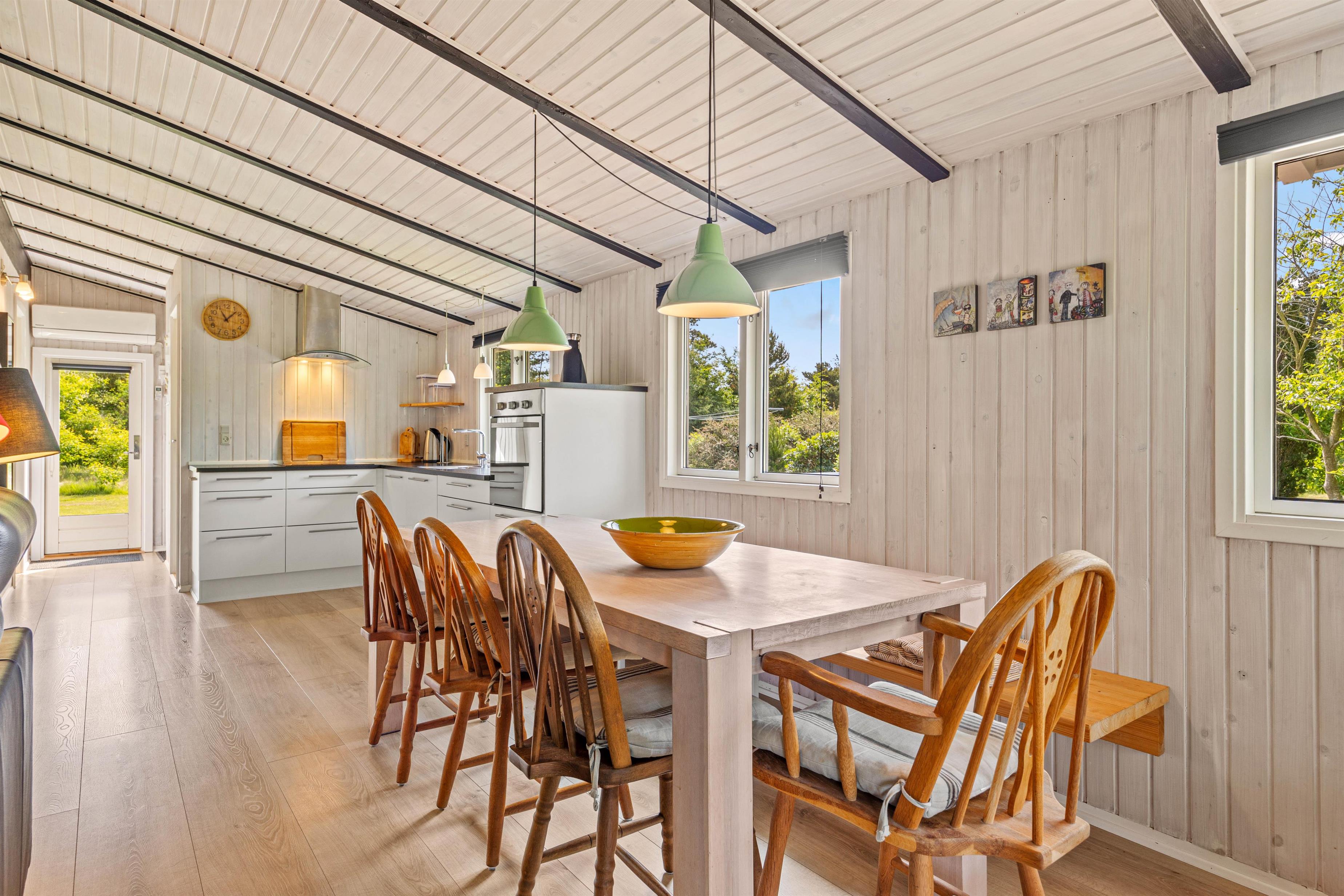 Den lyse stue med det åbne, veludstyrede køkken indbyder til masser af familietid. Den venlige og moderne indretning og de mørke loftsbjælker som kontrast på de lyse trælofter tilfører omgivelserne den helt klassiske sommerhuscharme. På de kølige dage kan I sætte jer til rette foran den knitrende brændeovn og varme jer på en kop kakao.