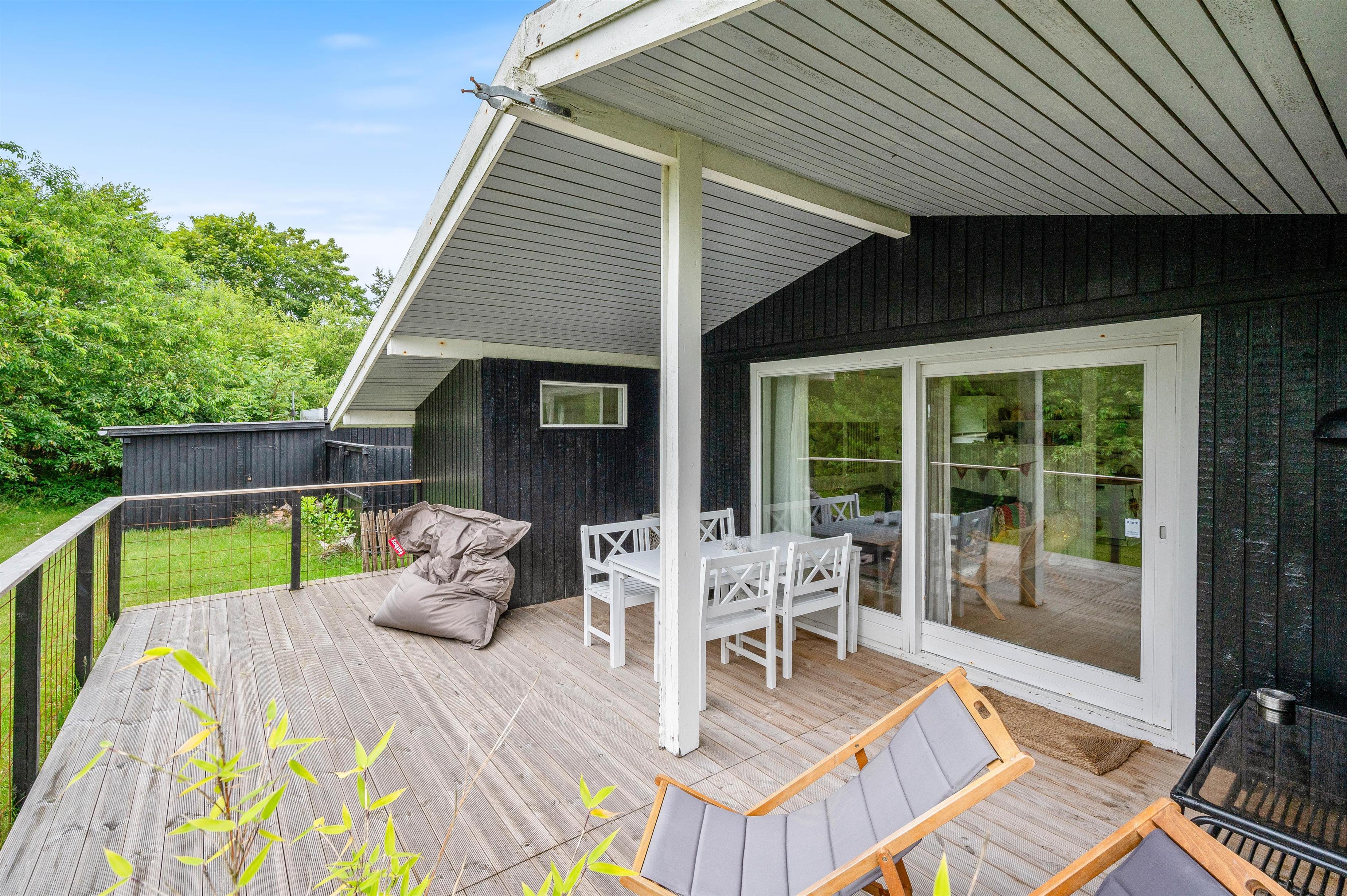 Slå fødderne op, sæt jer godt til rette i liggestolen, for nu er det virkelig tid til at slukke for hverdagen! Når det bliver køligere om aftenen, trækker I jer tilbage til sommerhuset, og her sikrer brændeovnen den perfekte ferieatmosfære og behagelige temperaturer på samme tid. Alternativt kan I også regulere temperaturen på en energibesparende måde med den varmepumpe, der er installeret i sommerhuset.