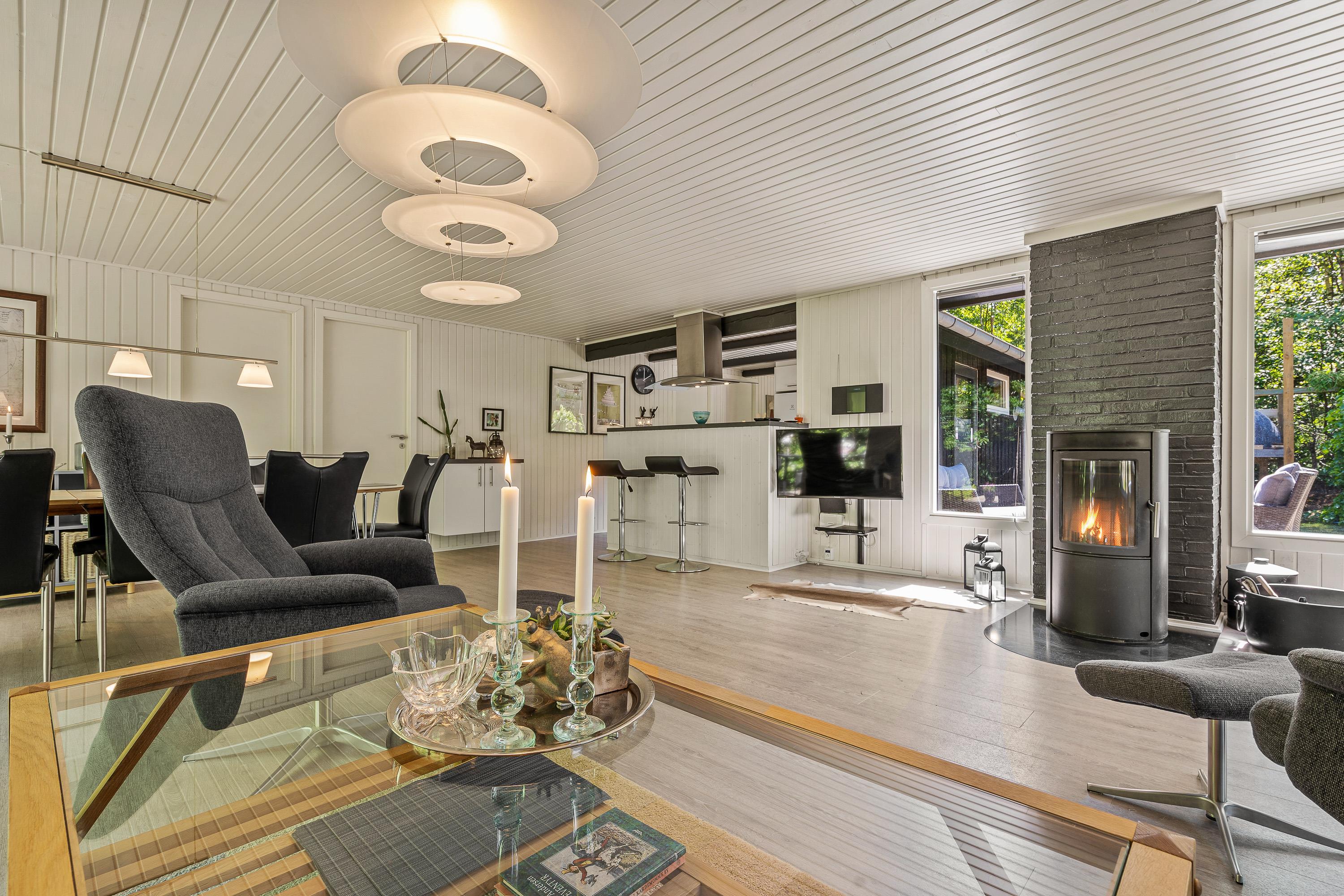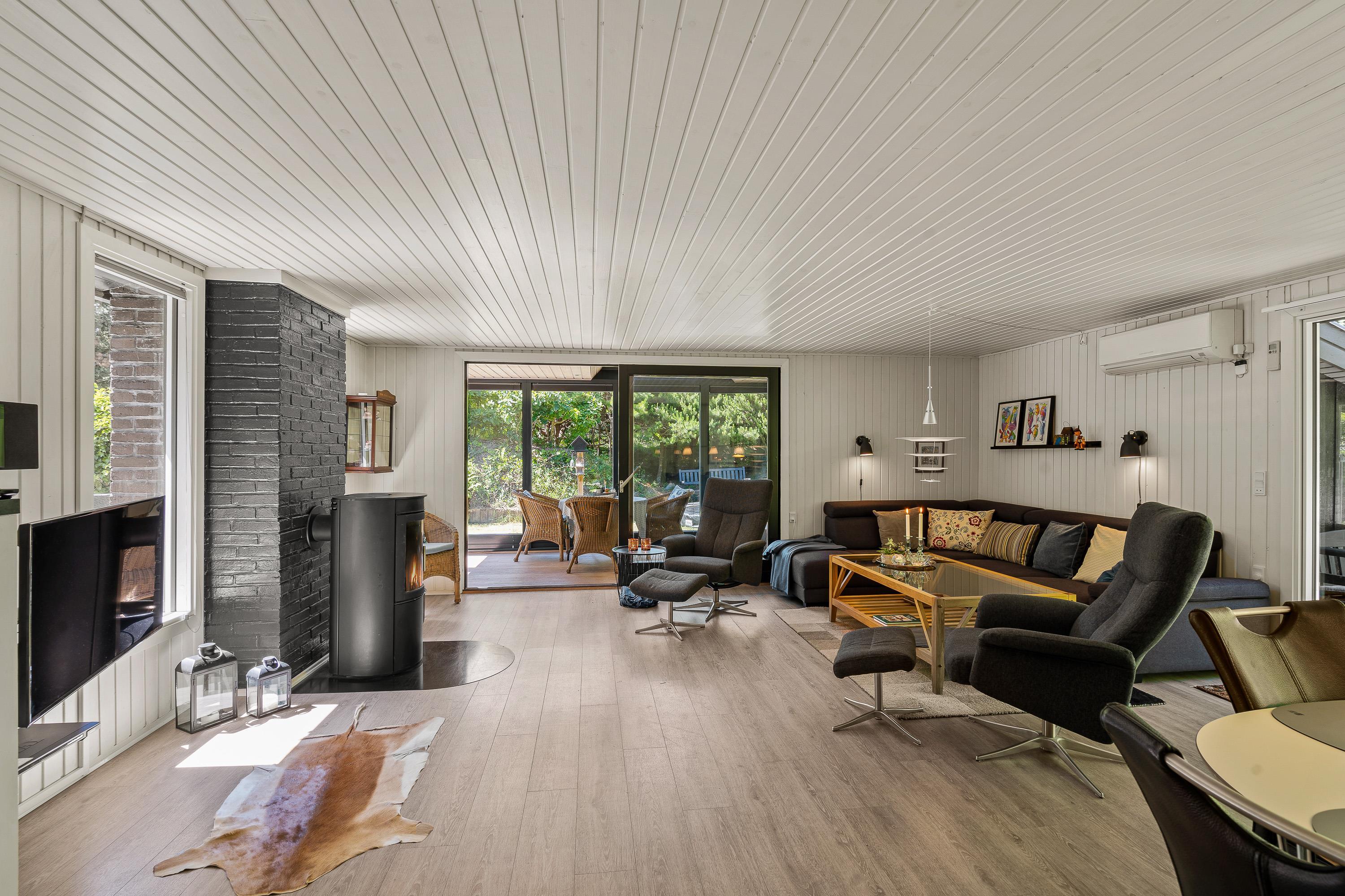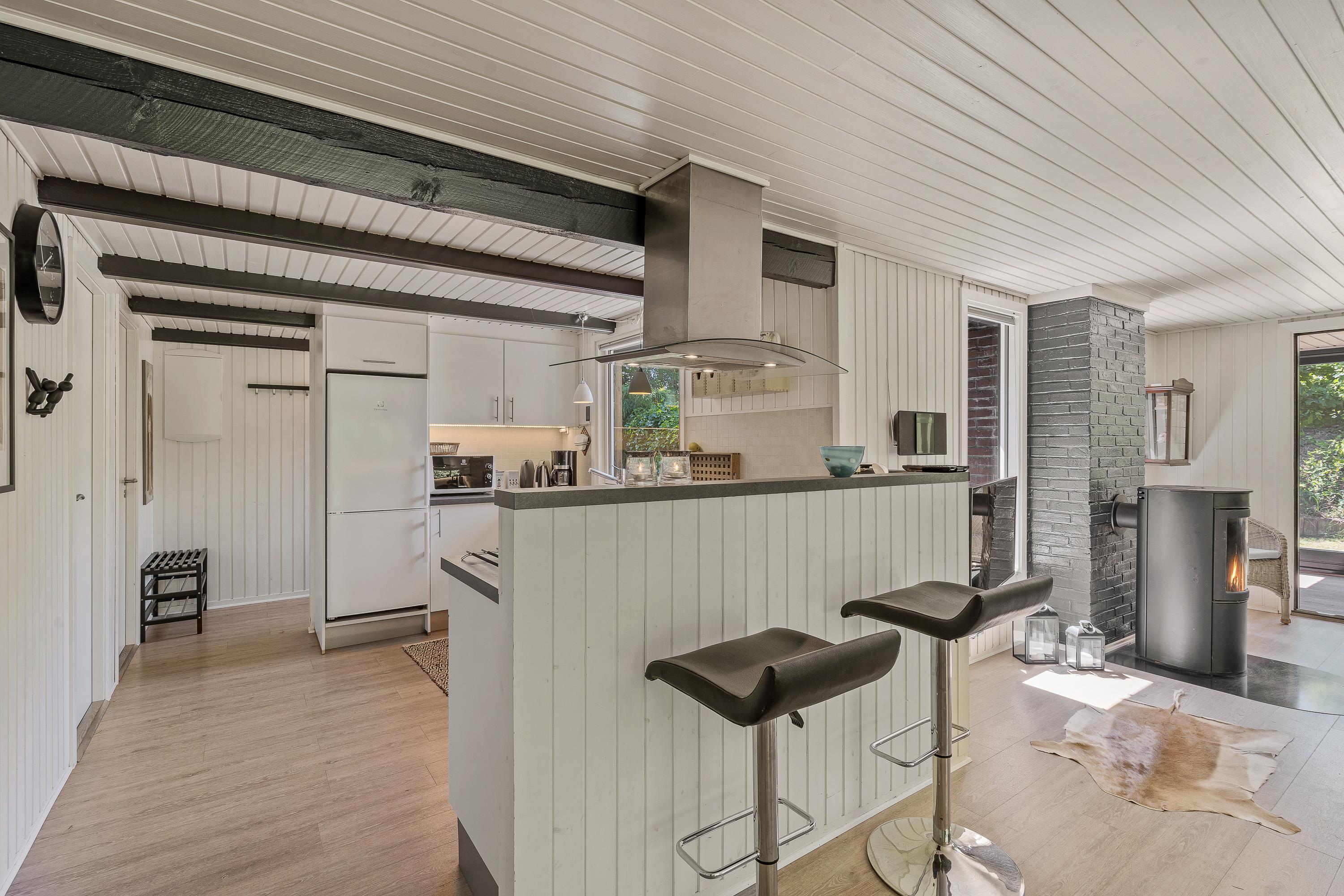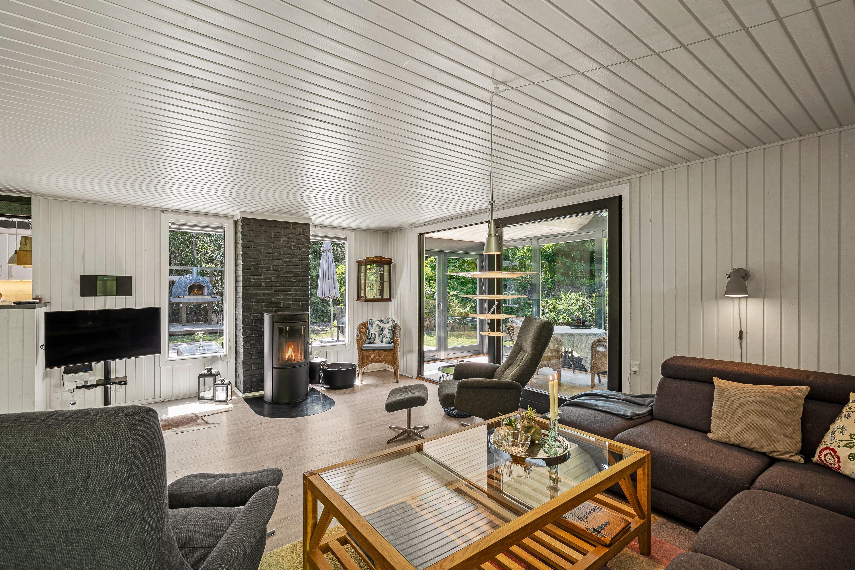 Sommerhusets alrum danner rammen om hyggelige feriestunder for hele familien. Alrummet forener køkken, stue og spisestue, så her kan I være sammen om alt fra madlavningen til gode film i tv’et. Samtidig sørger brændeovnen for at fuldende feriestemningen med sin knitren i baggrunden og dejlige varme. I forlængelse af alrummet har I en dejlig udestue, hvor I kan nyde udsigten til den omkringliggende natur.