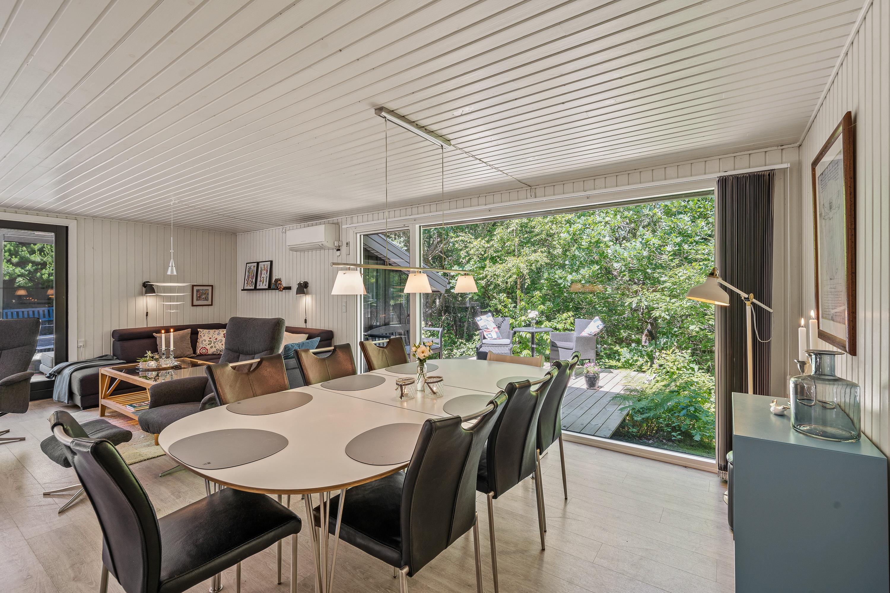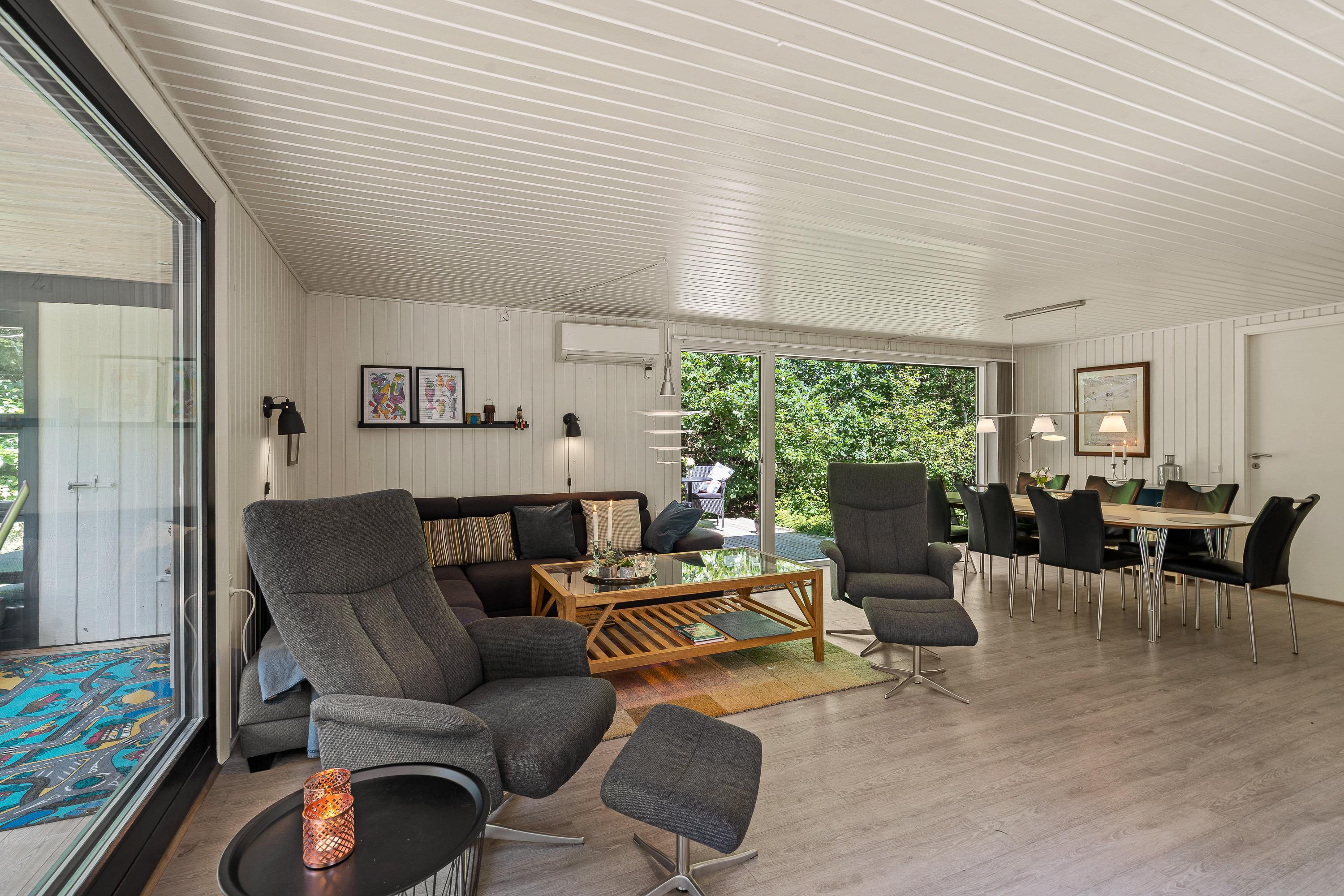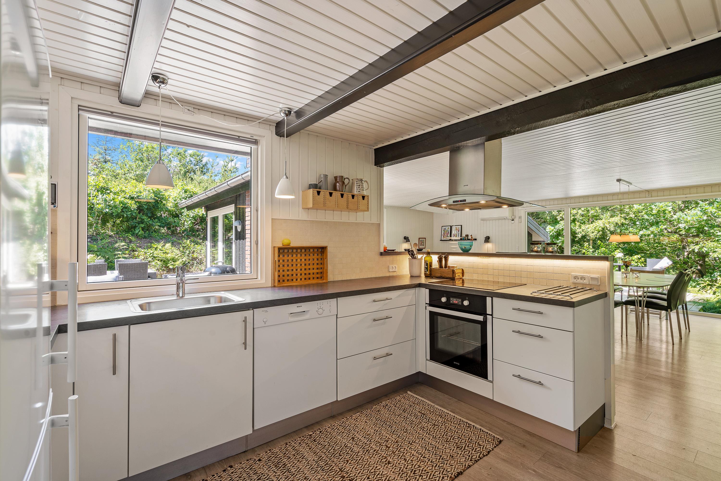 Sommerhusets alrum danner rammen om hyggelige feriestunder for hele familien. Alrummet forener køkken, stue og spisestue, så her kan I være sammen om alt fra madlavningen til gode film i tv’et. Samtidig sørger brændeovnen for at fuldende feriestemningen med sin knitren i baggrunden og dejlige varme. I forlængelse af alrummet har I en dejlig udestue, hvor I kan nyde udsigten til den omkringliggende natur.