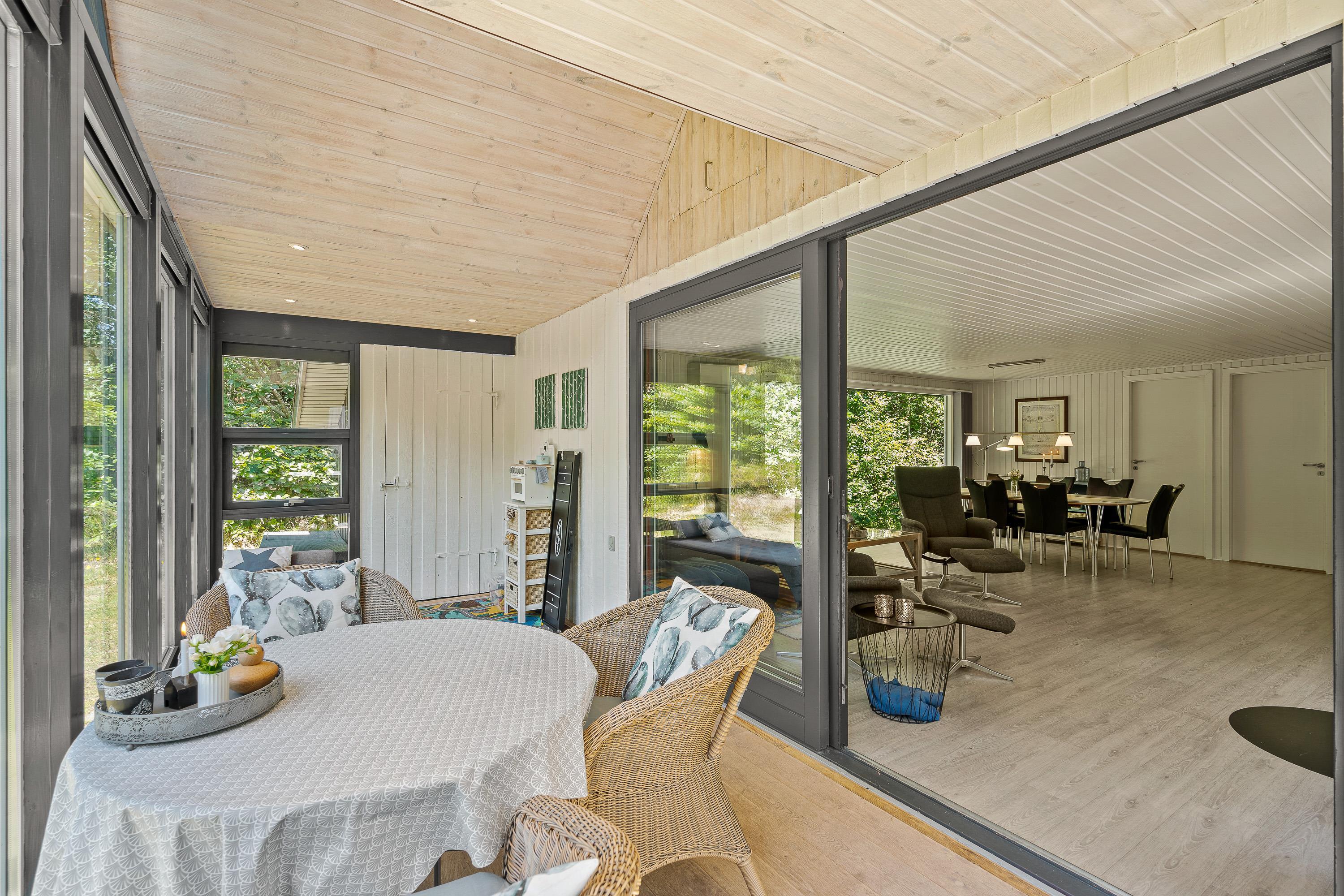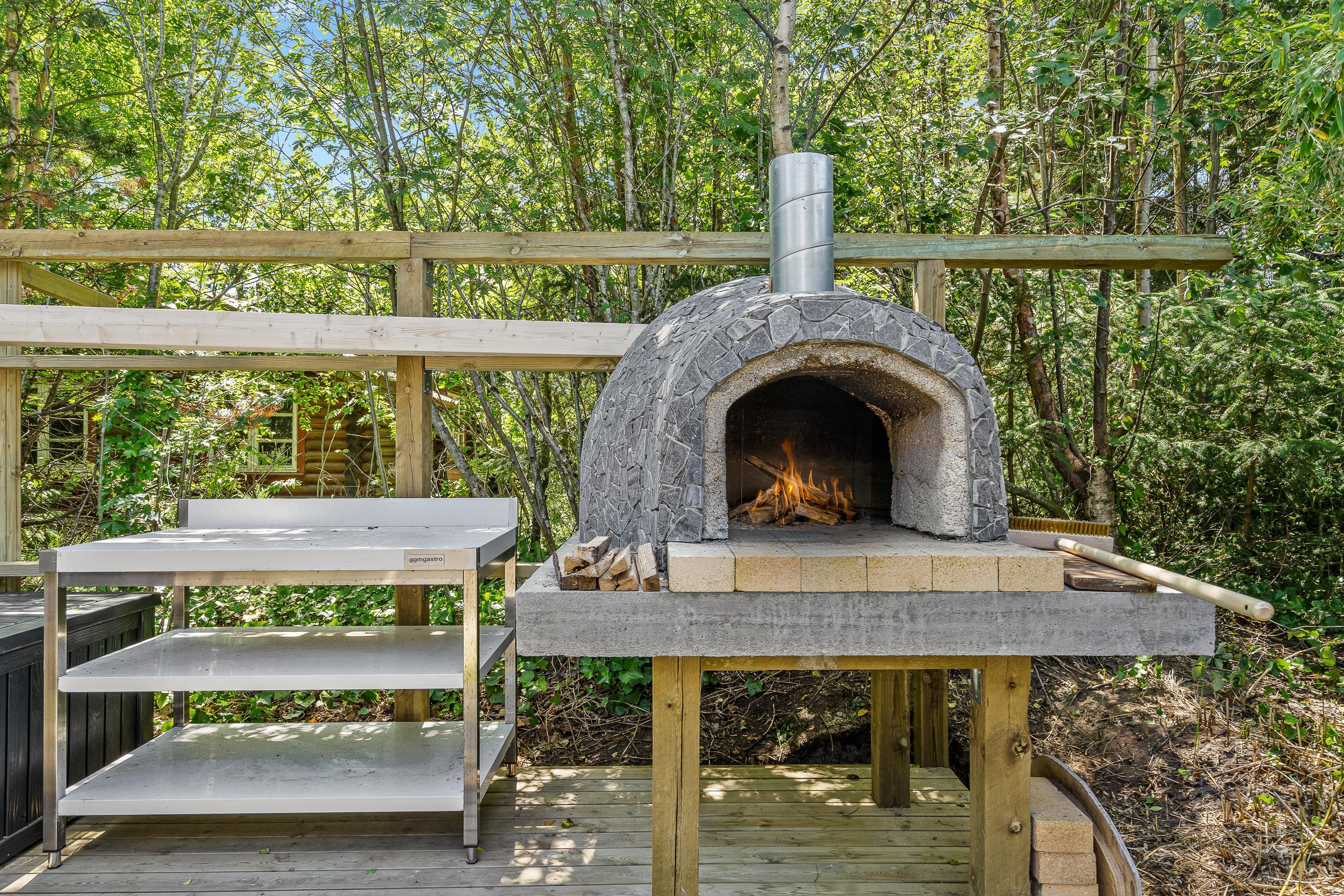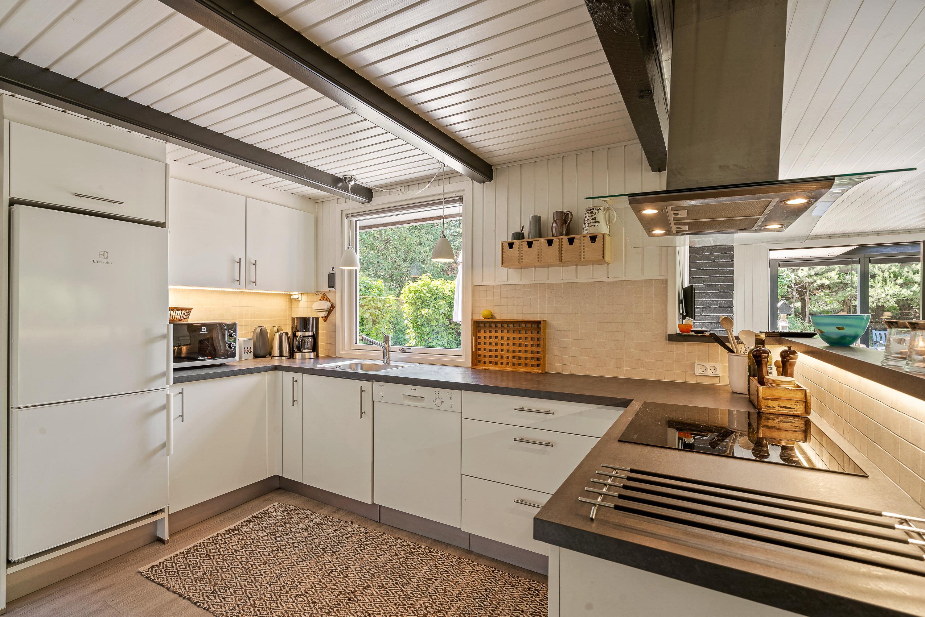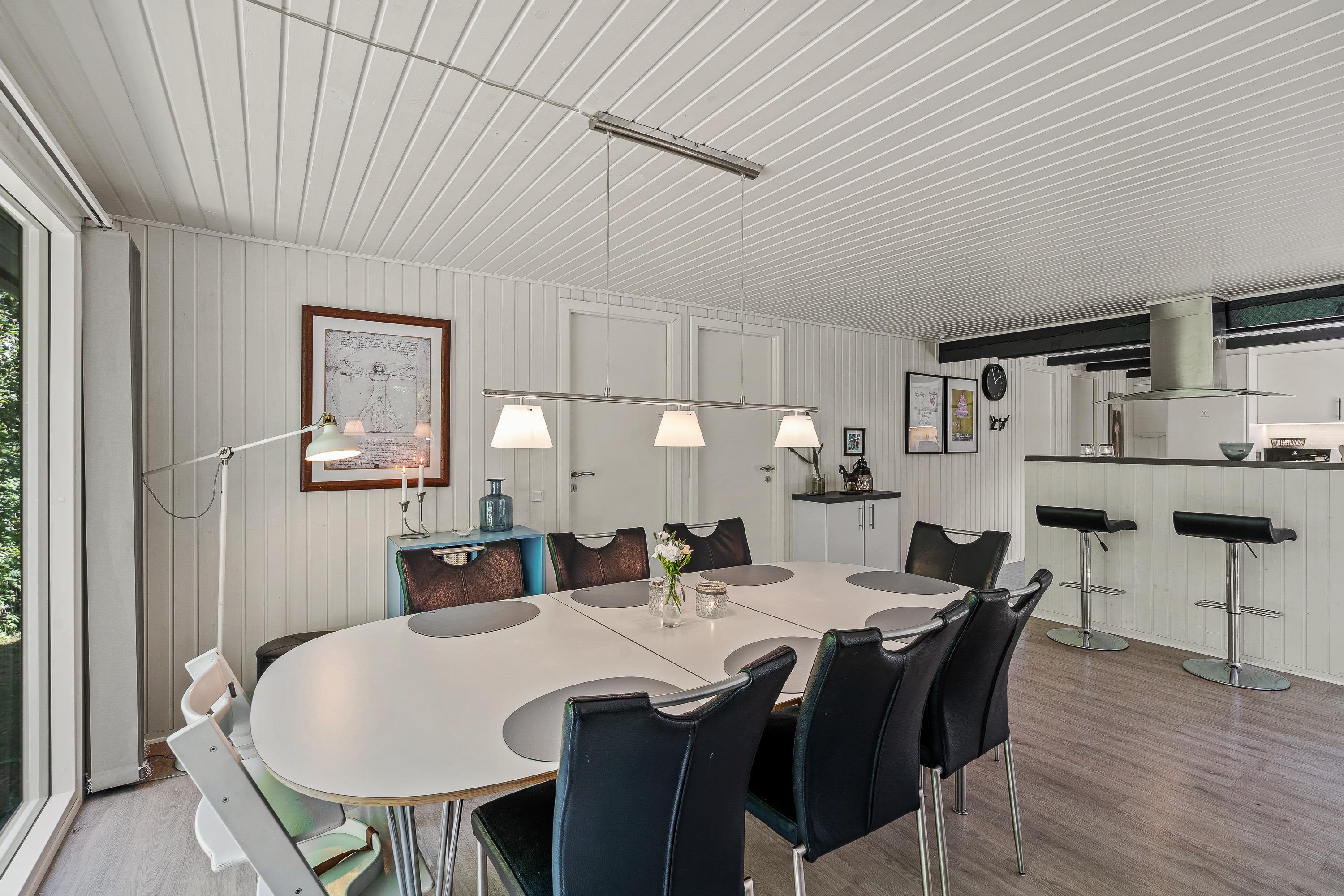 Sommerhusets alrum danner rammen om hyggelige feriestunder for hele familien. Alrummet forener køkken, stue og spisestue, så her kan I være sammen om alt fra madlavningen til gode film i tv’et. Samtidig sørger brændeovnen for at fuldende feriestemningen med sin knitren i baggrunden og dejlige varme. I forlængelse af alrummet har I en dejlig udestue, hvor I kan nyde udsigten til den omkringliggende natur.