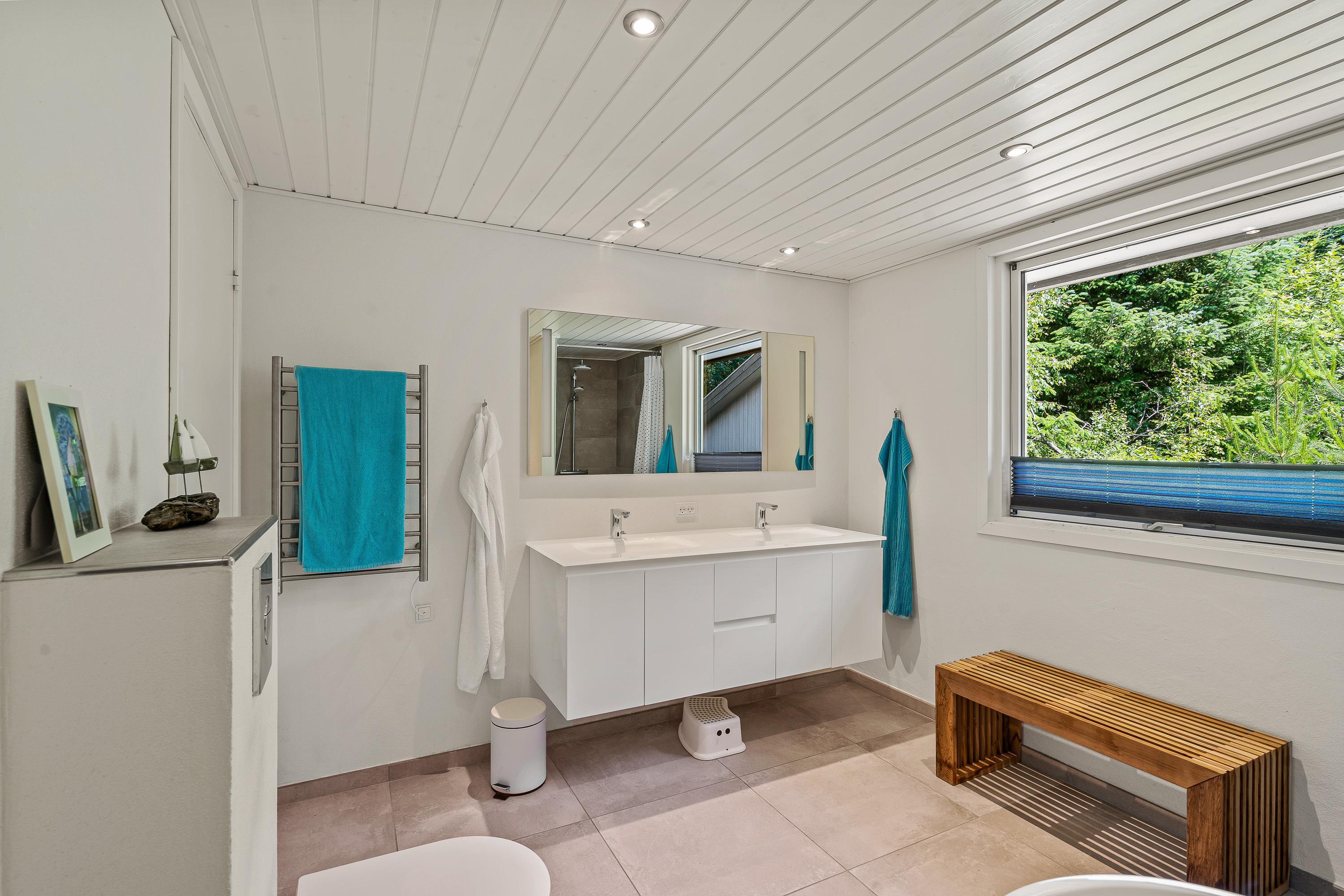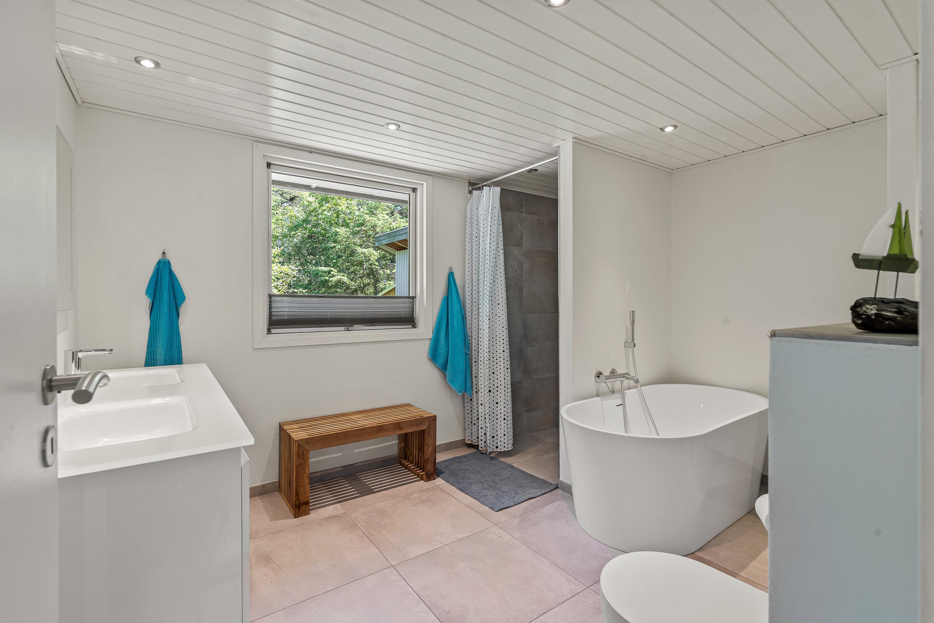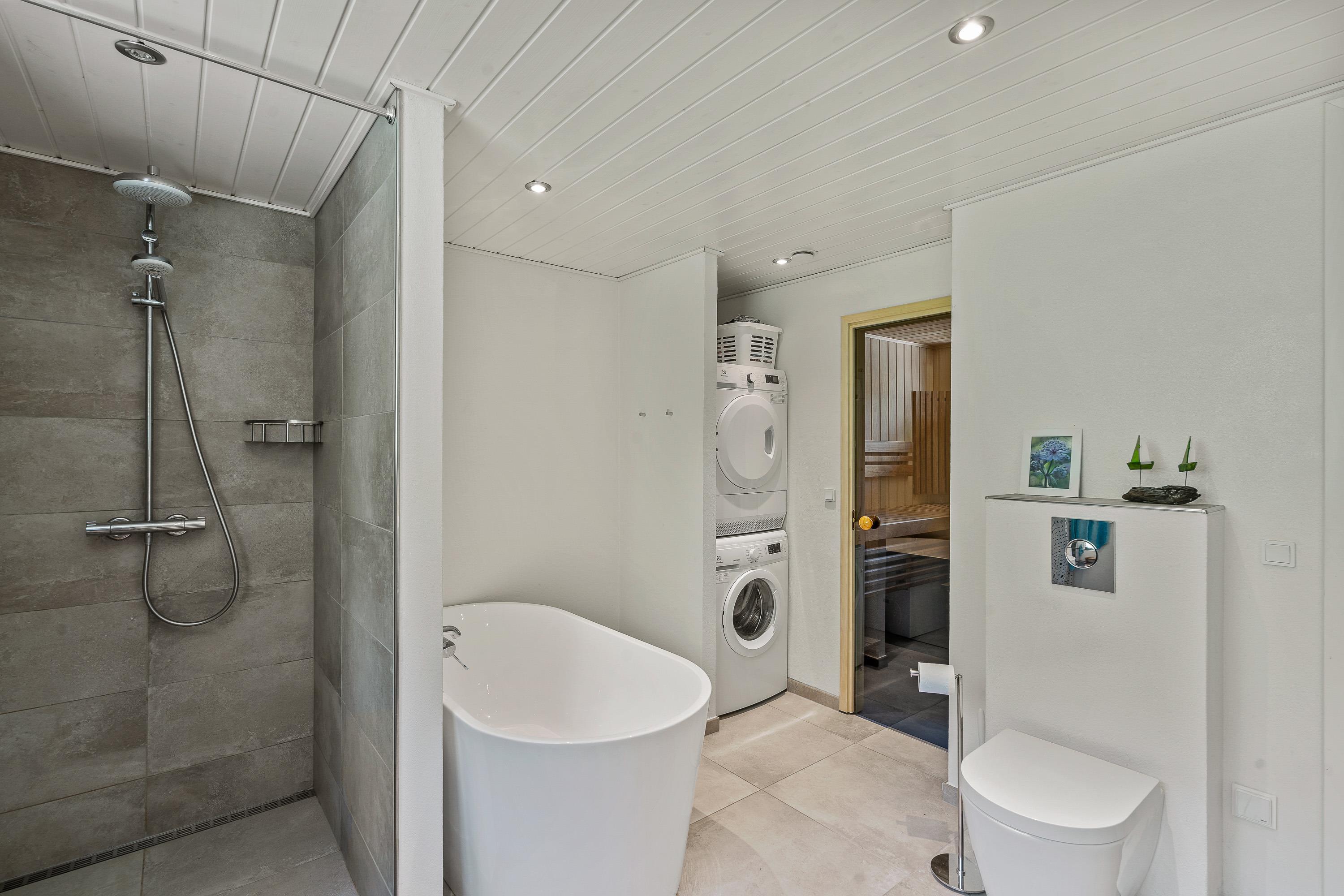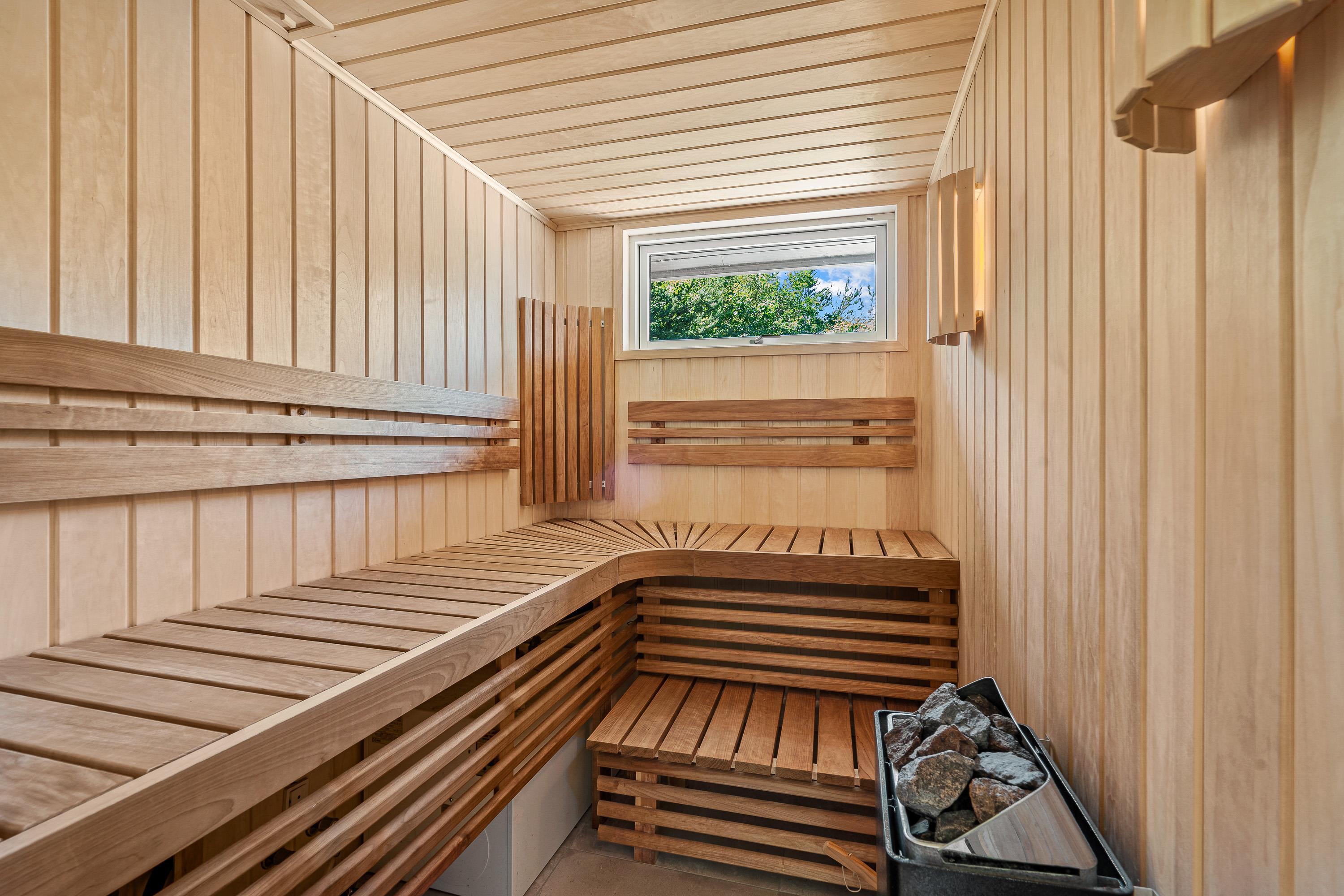 På sommerhusets badeværelse venter jer et højdepunkt: saunaen! I saunaen kan I nyde mange afslappende stunder, hvor I får slappet fuldstændig af i den dejlige varme. Her vil I helt sikkert kunne komme helt ned i gear.