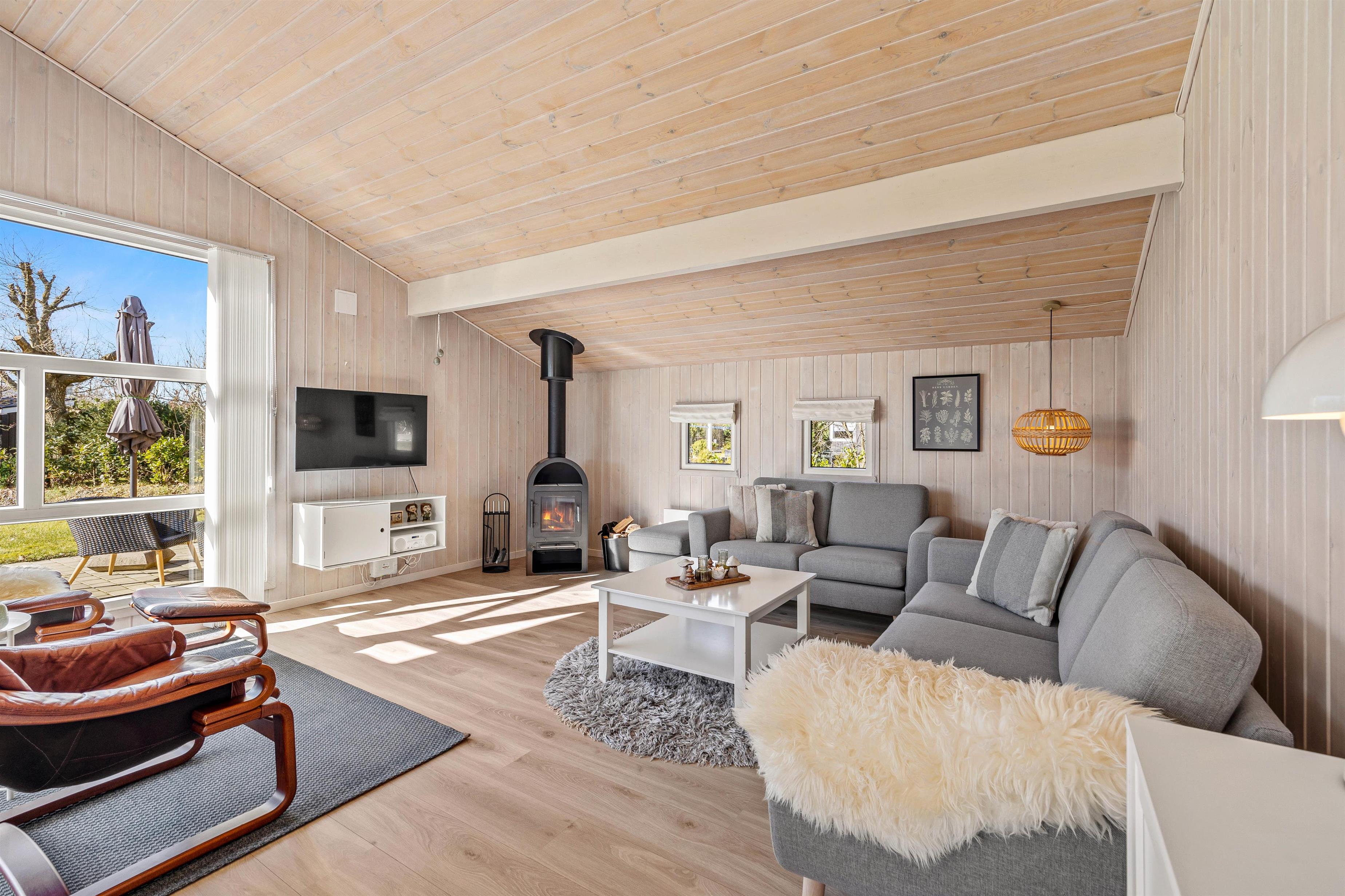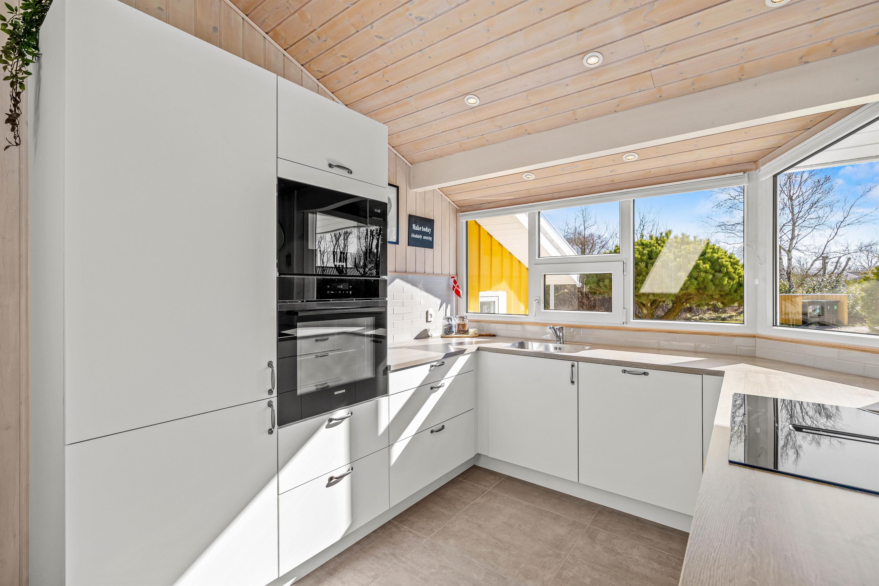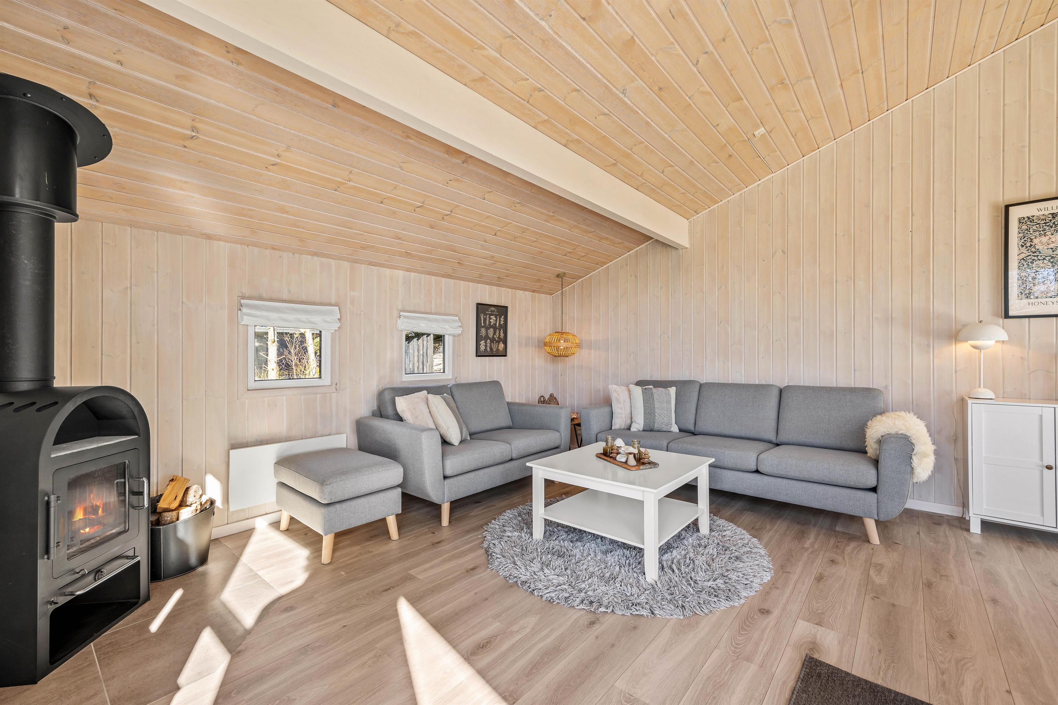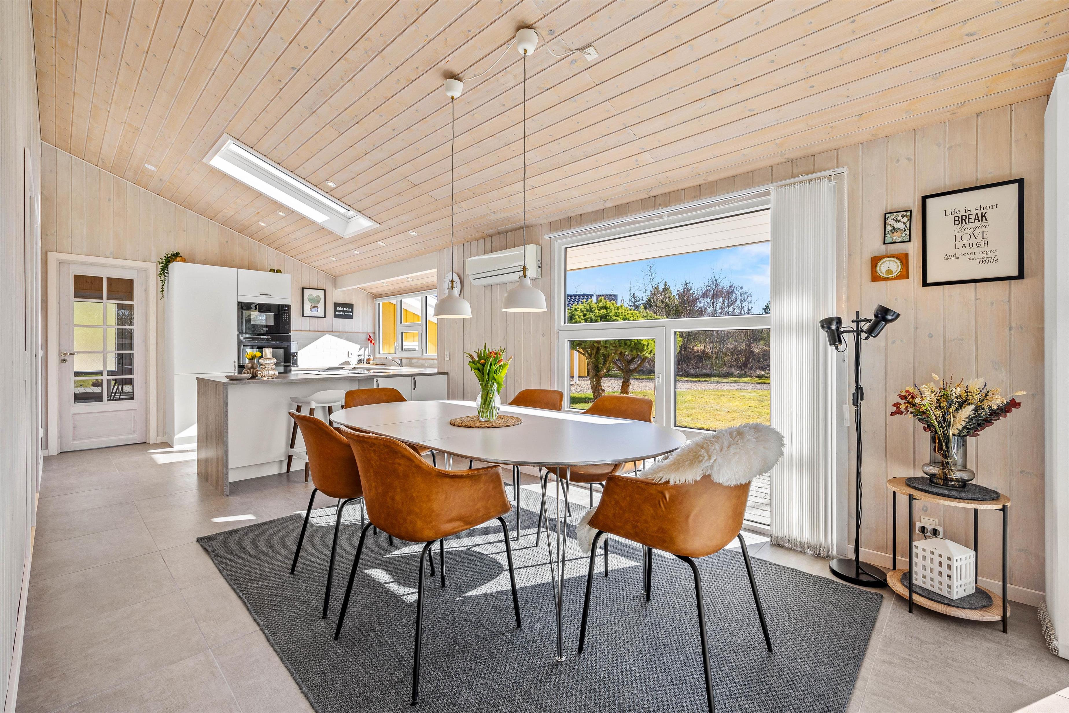 Dette feriehus er indrettet med stil og personlighed og med alle vigtige elementer til en skøn ferie, og bliver I straks mødt af en lys og moderne indretning. I stuen er der masser af gode siddemuligheder – her er både lækre lænestole, placeret optimalt for lysindfald og med læselamper for bogormene eller strikketanterne, samt bekvemme sofaer med fodstøtte. Her kan I efter en lang dag med masser af frisk vesterhavsluft samles til snak og hygge foran brændeovnen eller bare slænge ud foran fjernsynet. Det åbne køkken med spisebord og bekvemme stole indbyder til hyggelige stunder med fælles madlavning og samvær omkring spisebordet.