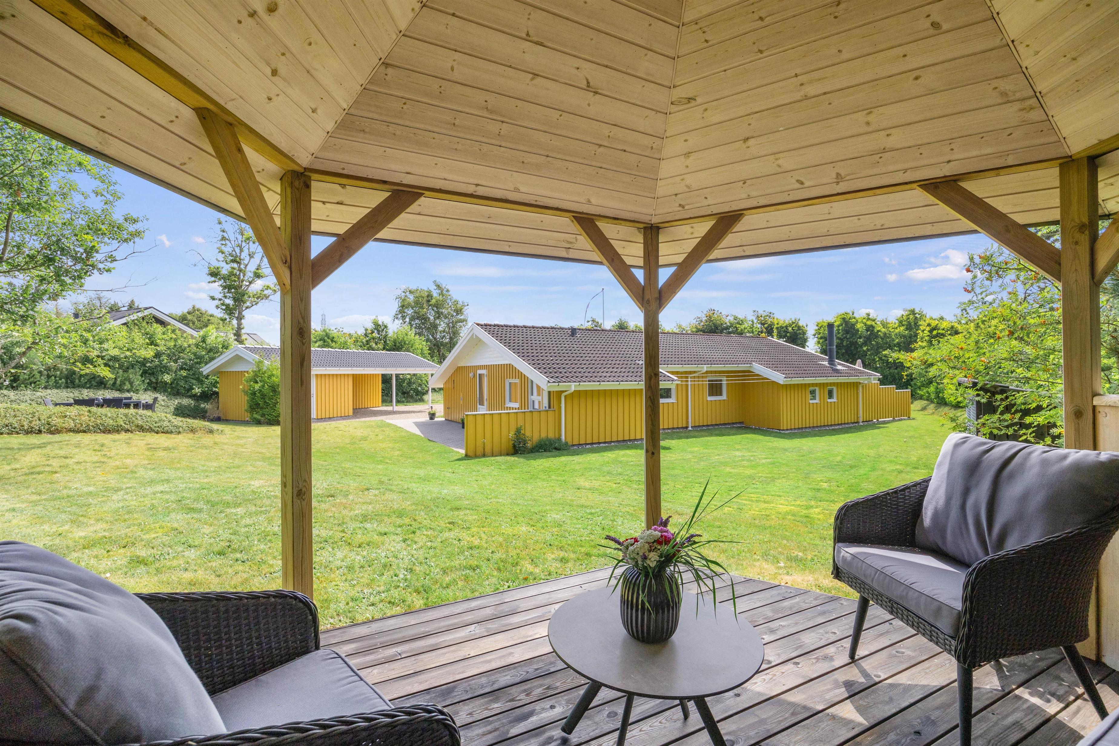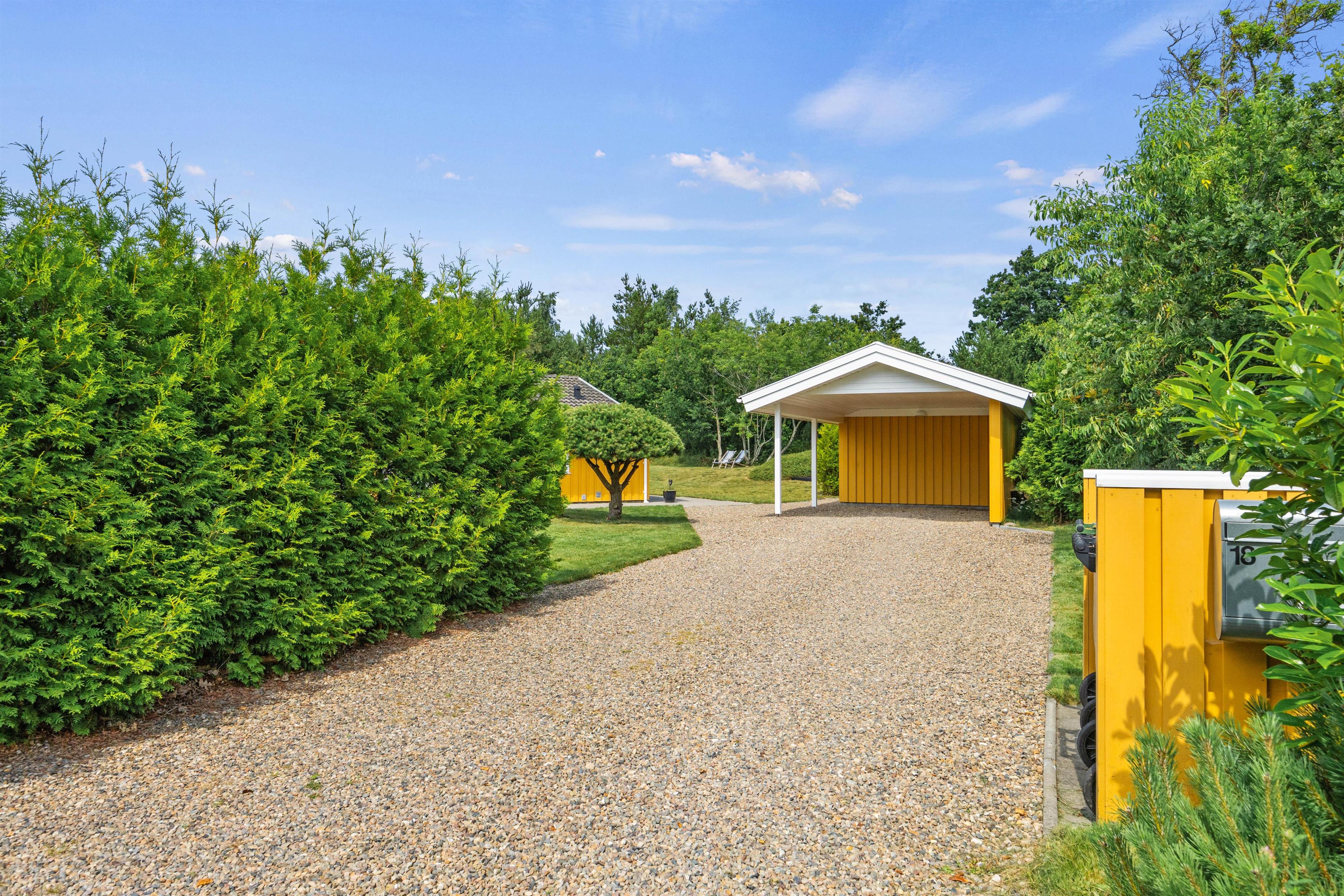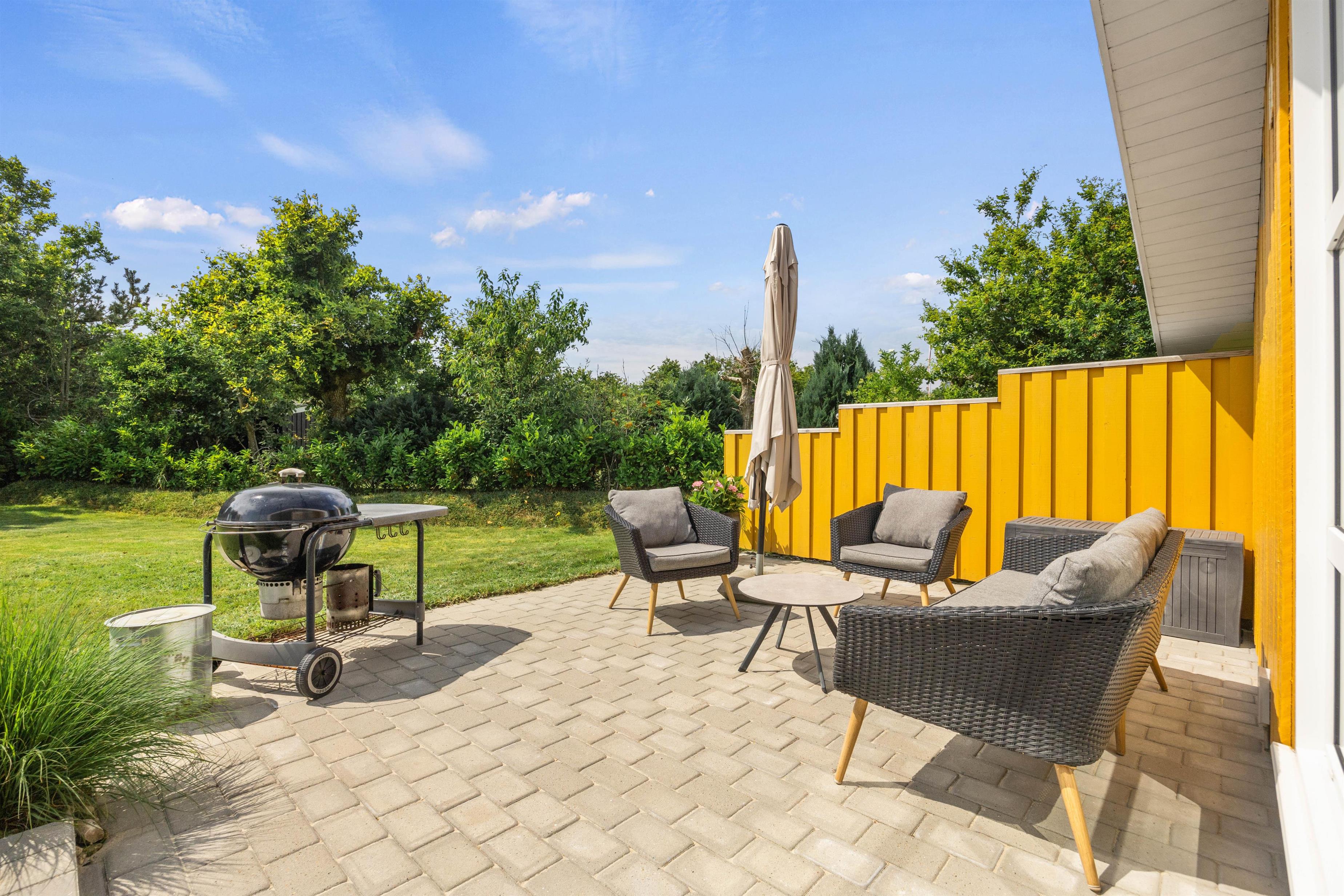 Feriehuset ligger på en stor og velplejet naturgrund. På den store afskærmede terrasse er der masser af plads og mulighed for at tanke sol, imens de små boltrer sig på græsplanen. Det overdækkede terrasseareal holder på varmen, når dagen går på hæld, beskytter for regnbyger eller for megen sol og er derfor det optimale sted for lange grillaftener.