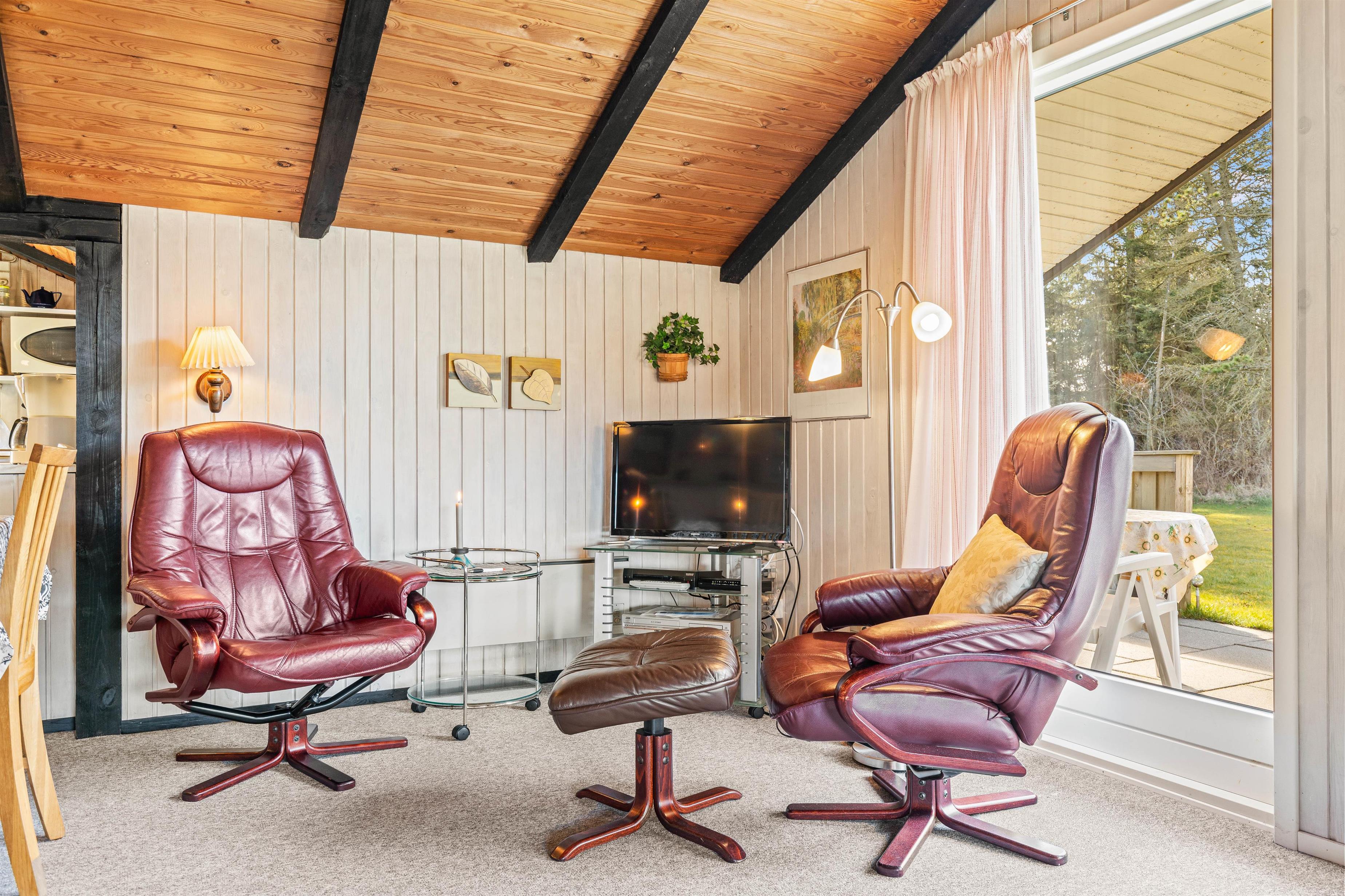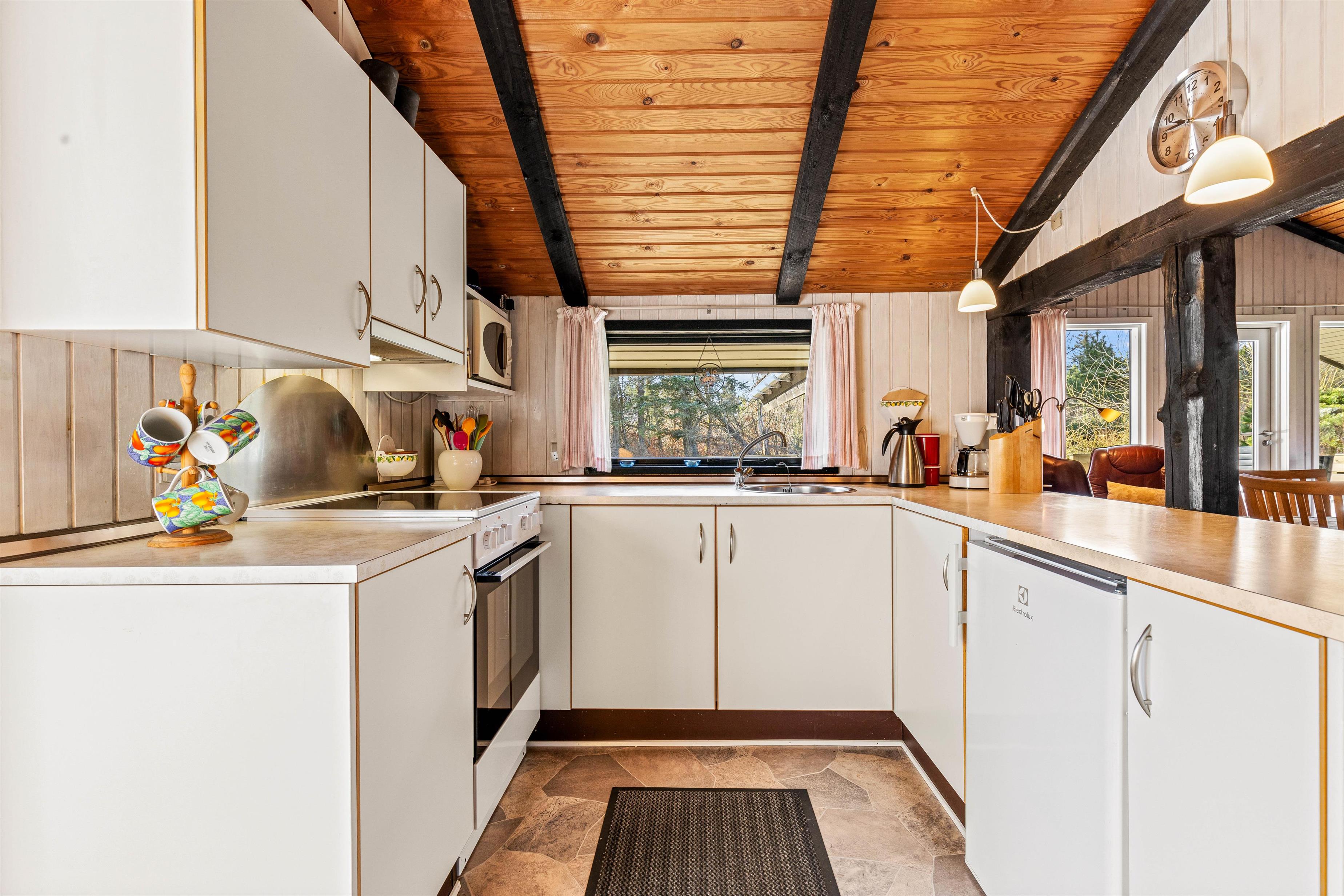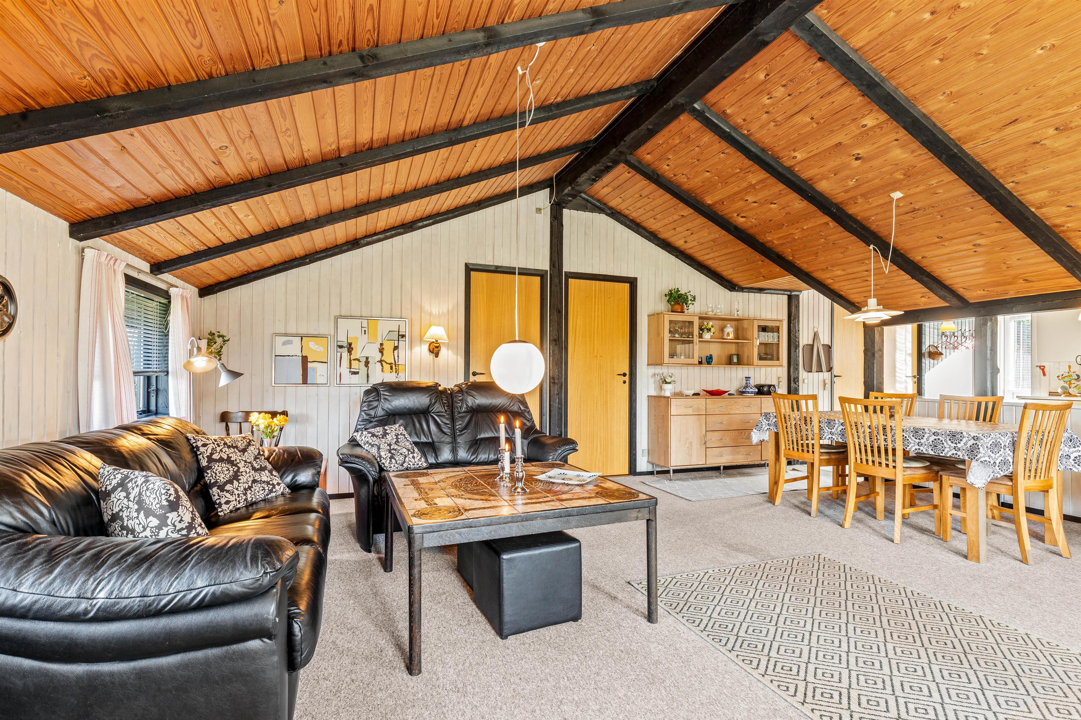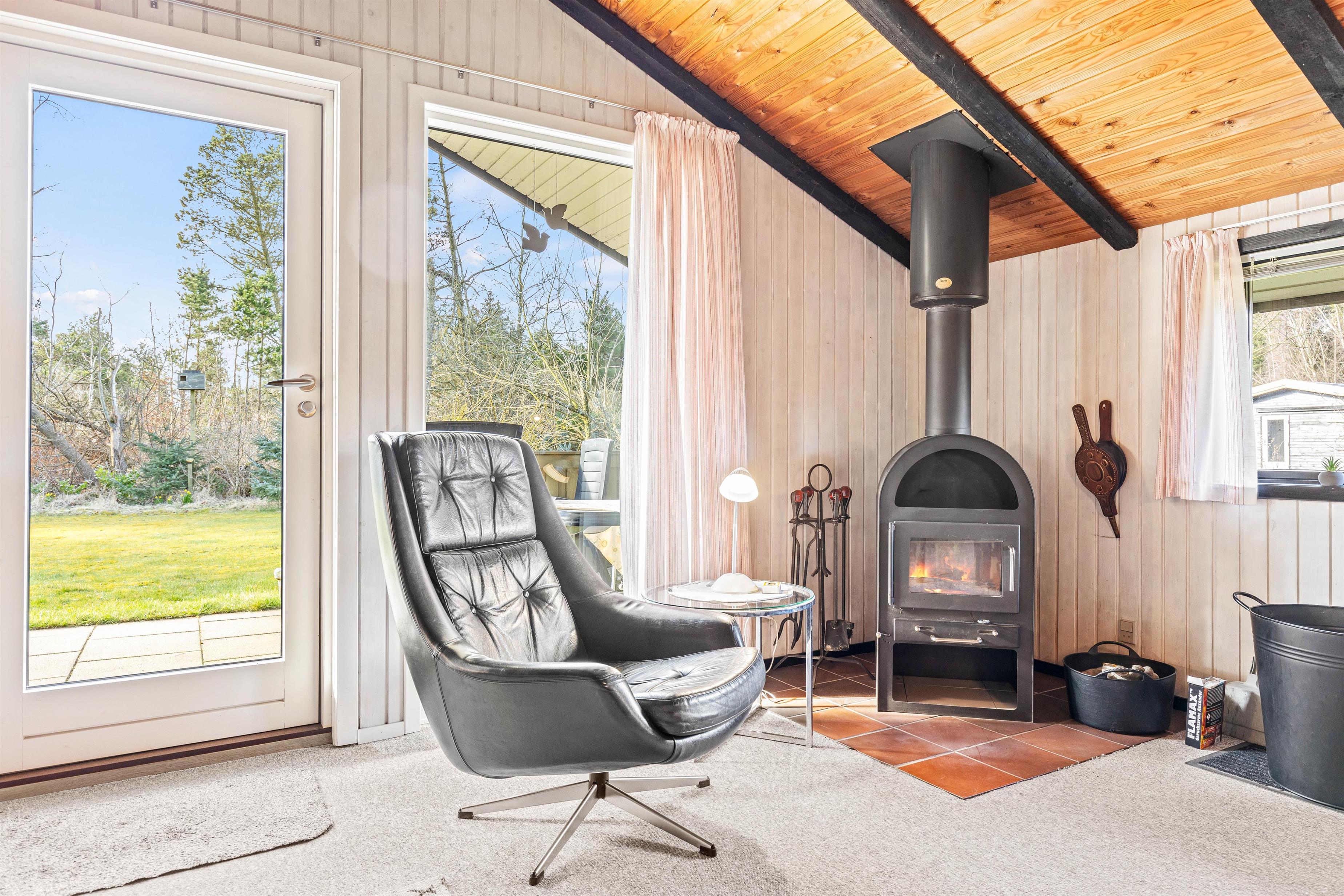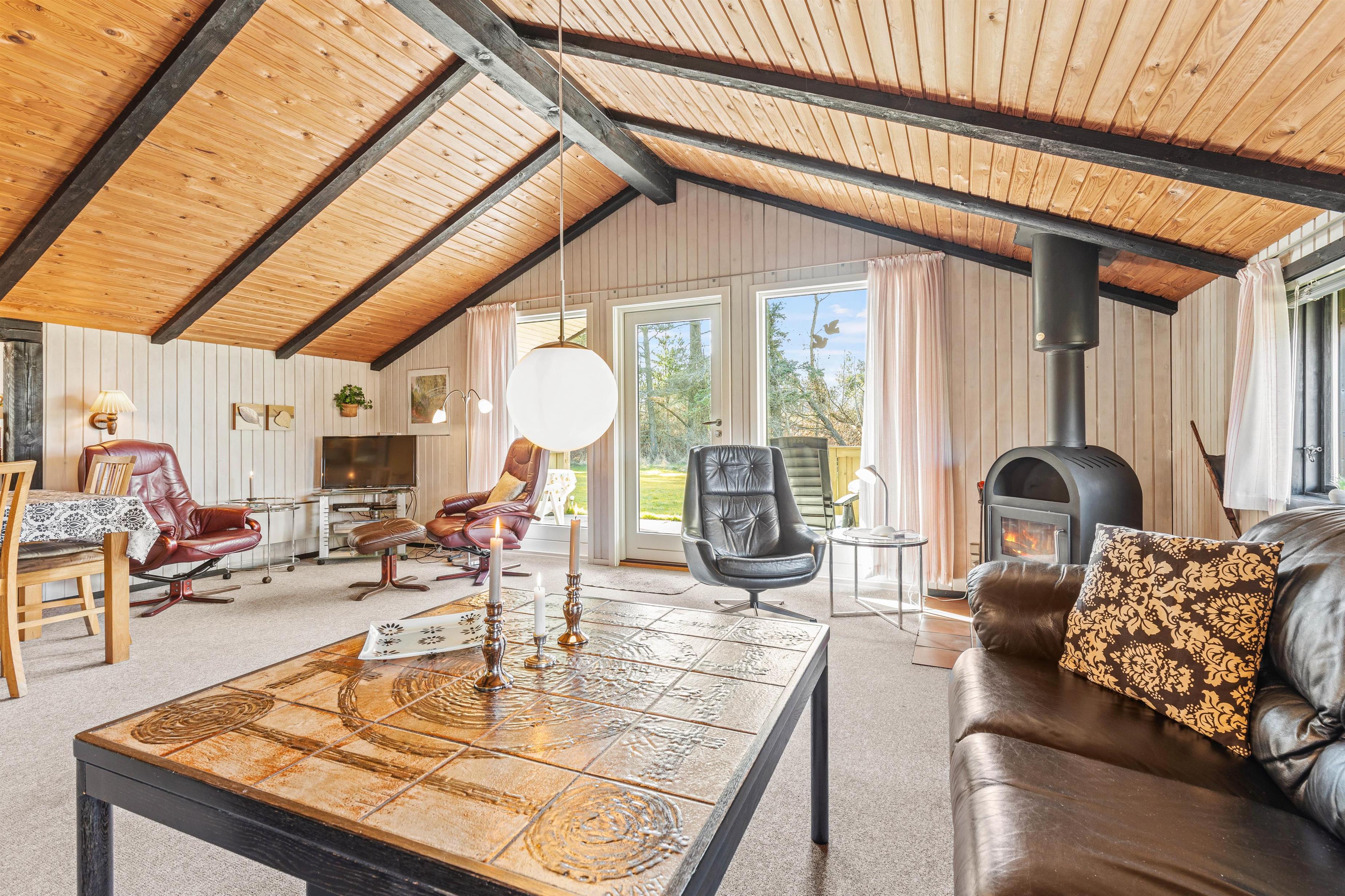 Den hyggelige stue, som ligger i forbindelse med det halvåbne køkken, fungerer som husets midtpunkt. Her kan familien samles foran den knitrende brændeovn og nyde den behagelige varme. De mørke træbjælker tilfører en helt speciel charme og den klassiske sommerhusstemning.