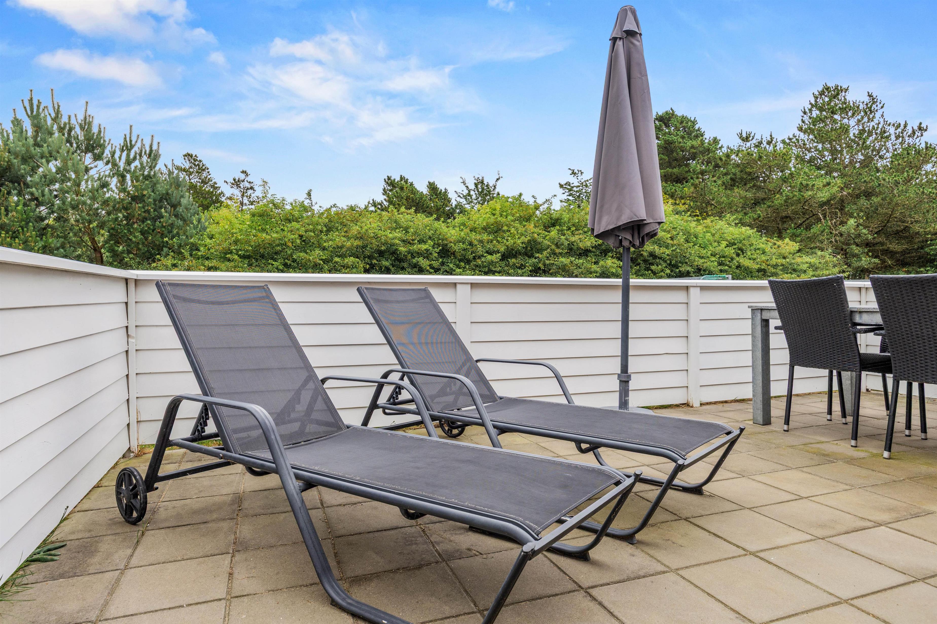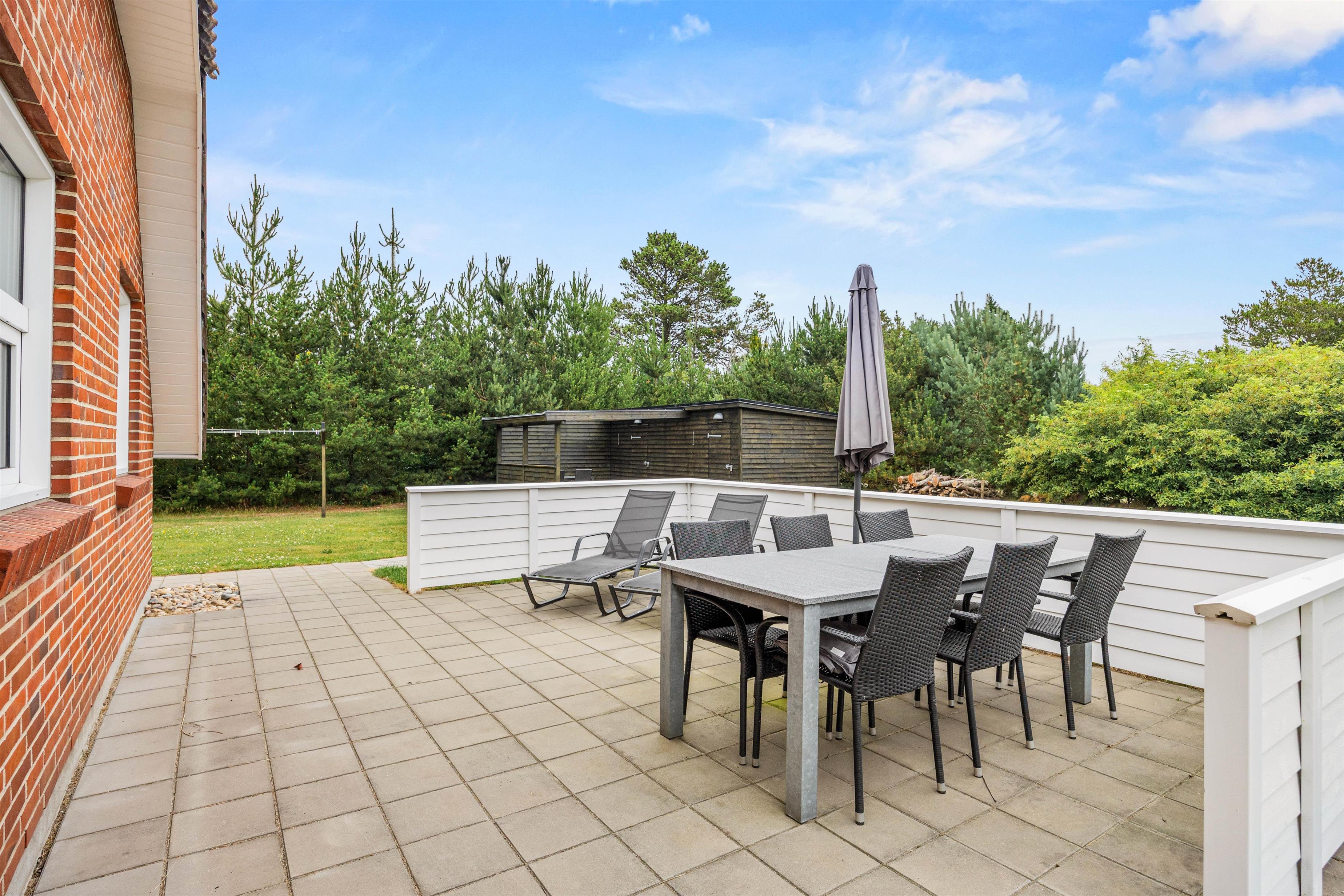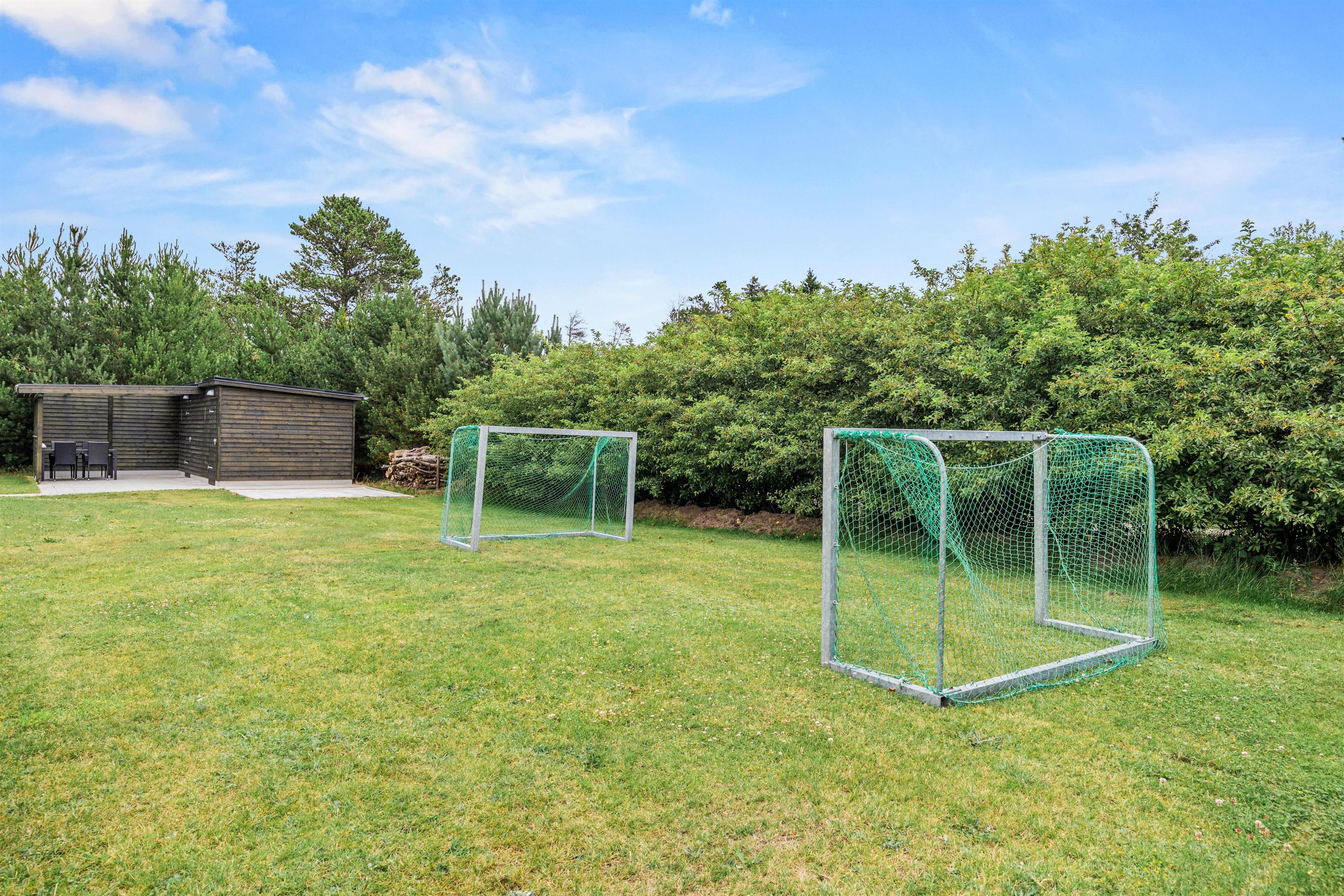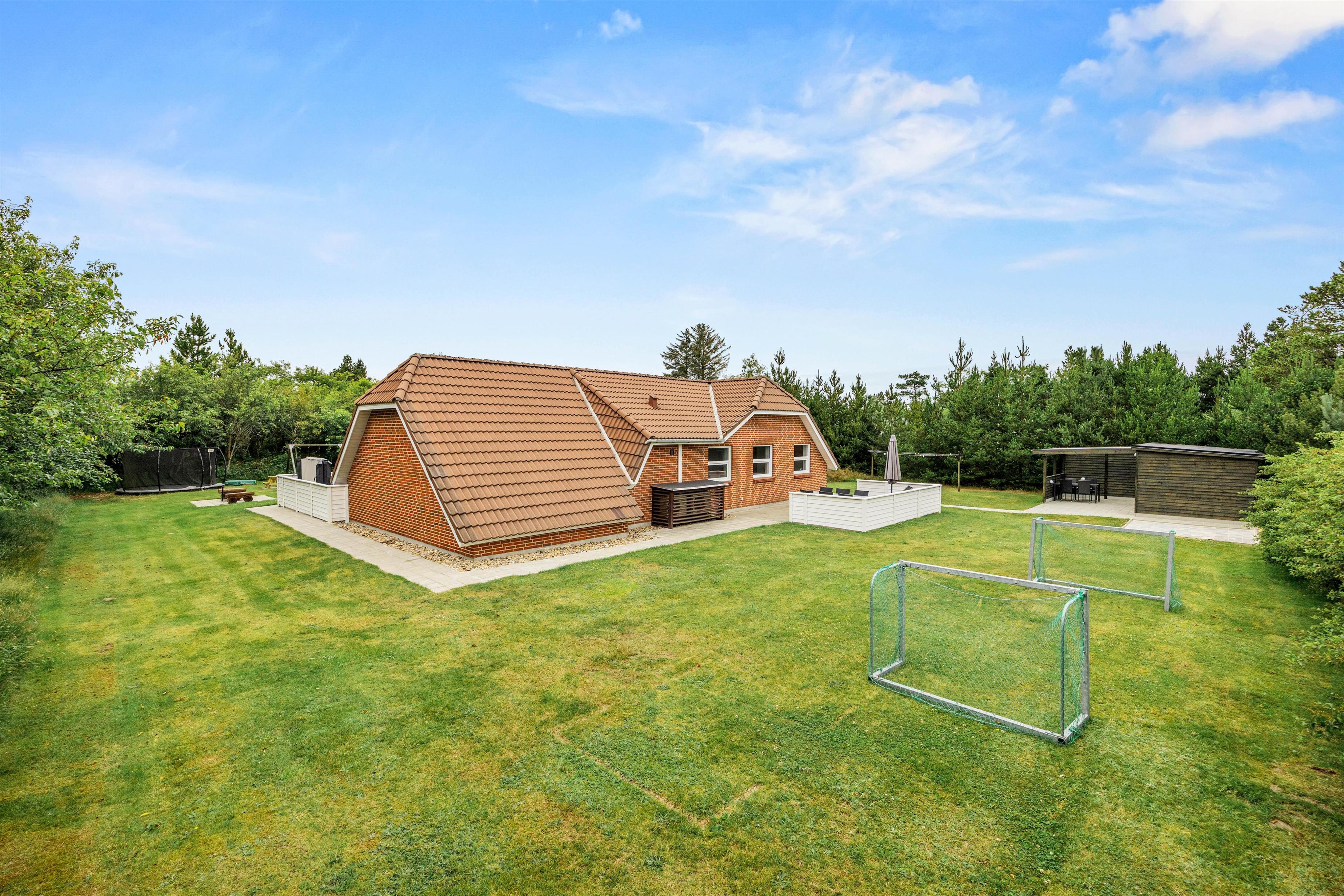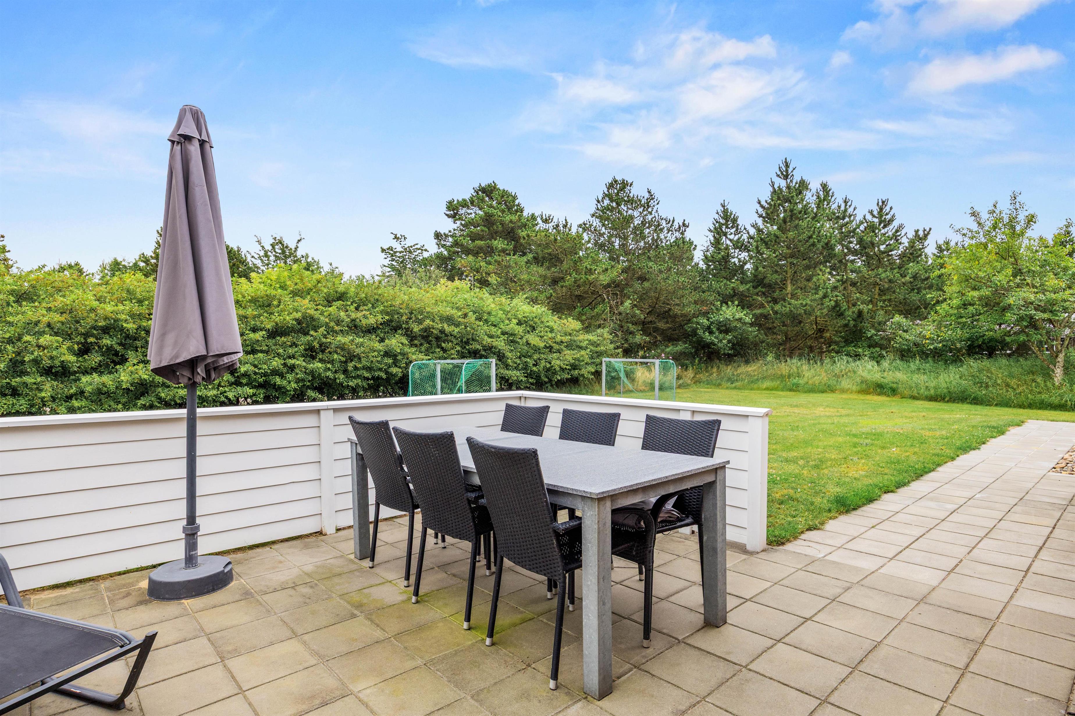 Gennem stuen kommer I ud på den hyggelige terrasse, hvor havemøblerne og grillen er sat frem til at skabe den rette feriestemning. Sommerhuset er omgivet af en stor grøn græsplæne, hvor børnene kan slå sig løs ved at gynge, sandkasse og fodboldmål, mens I slapper af i solen.