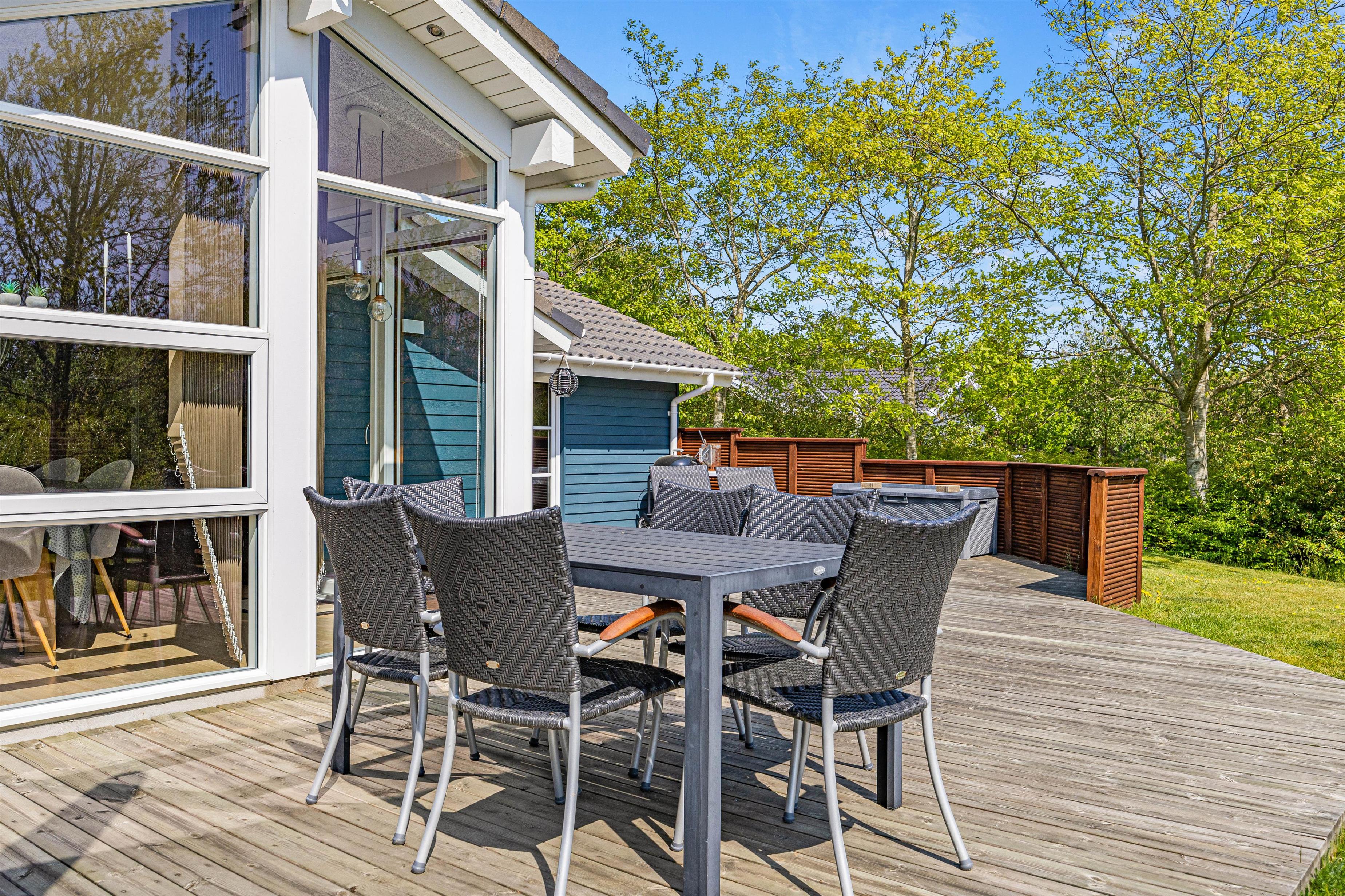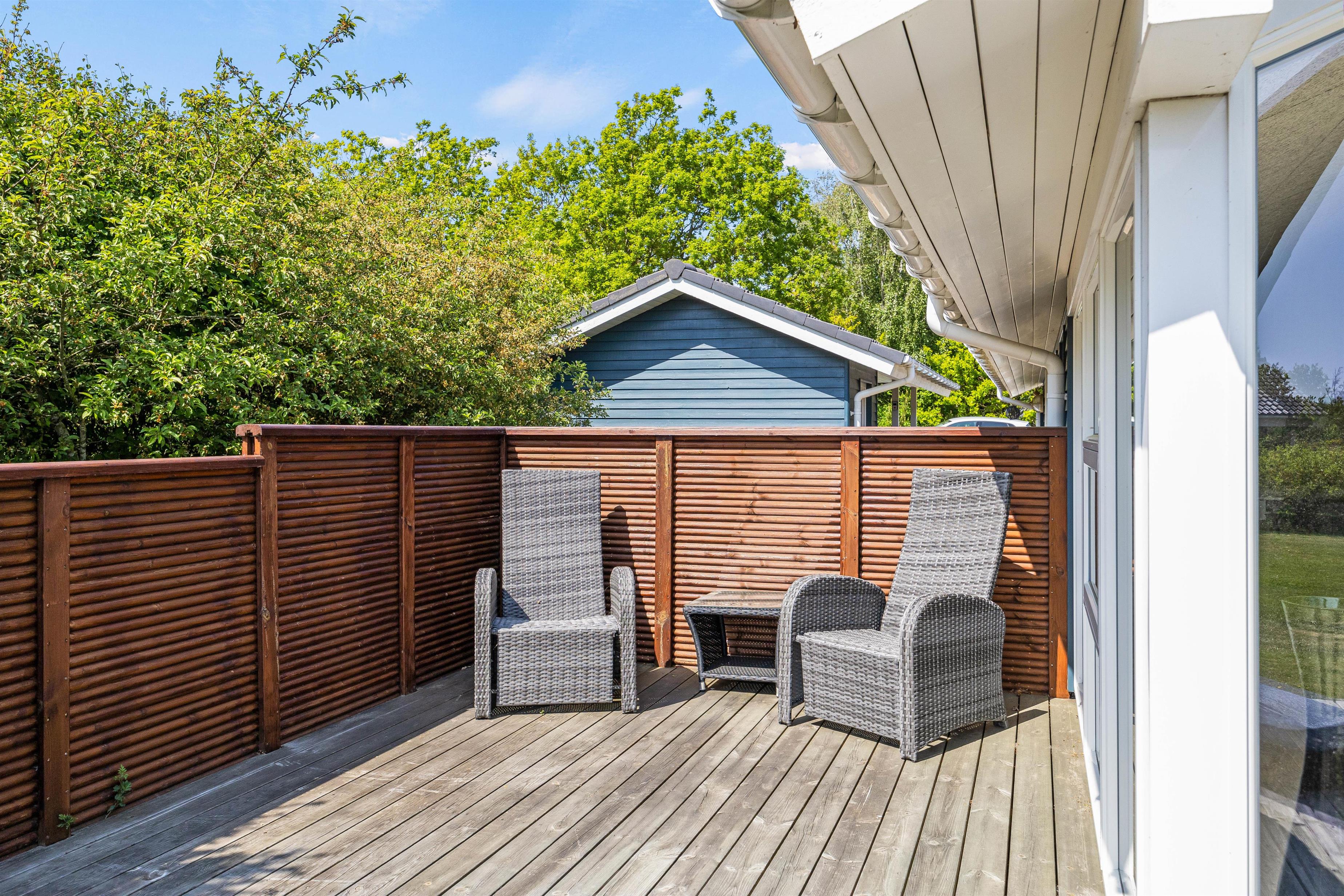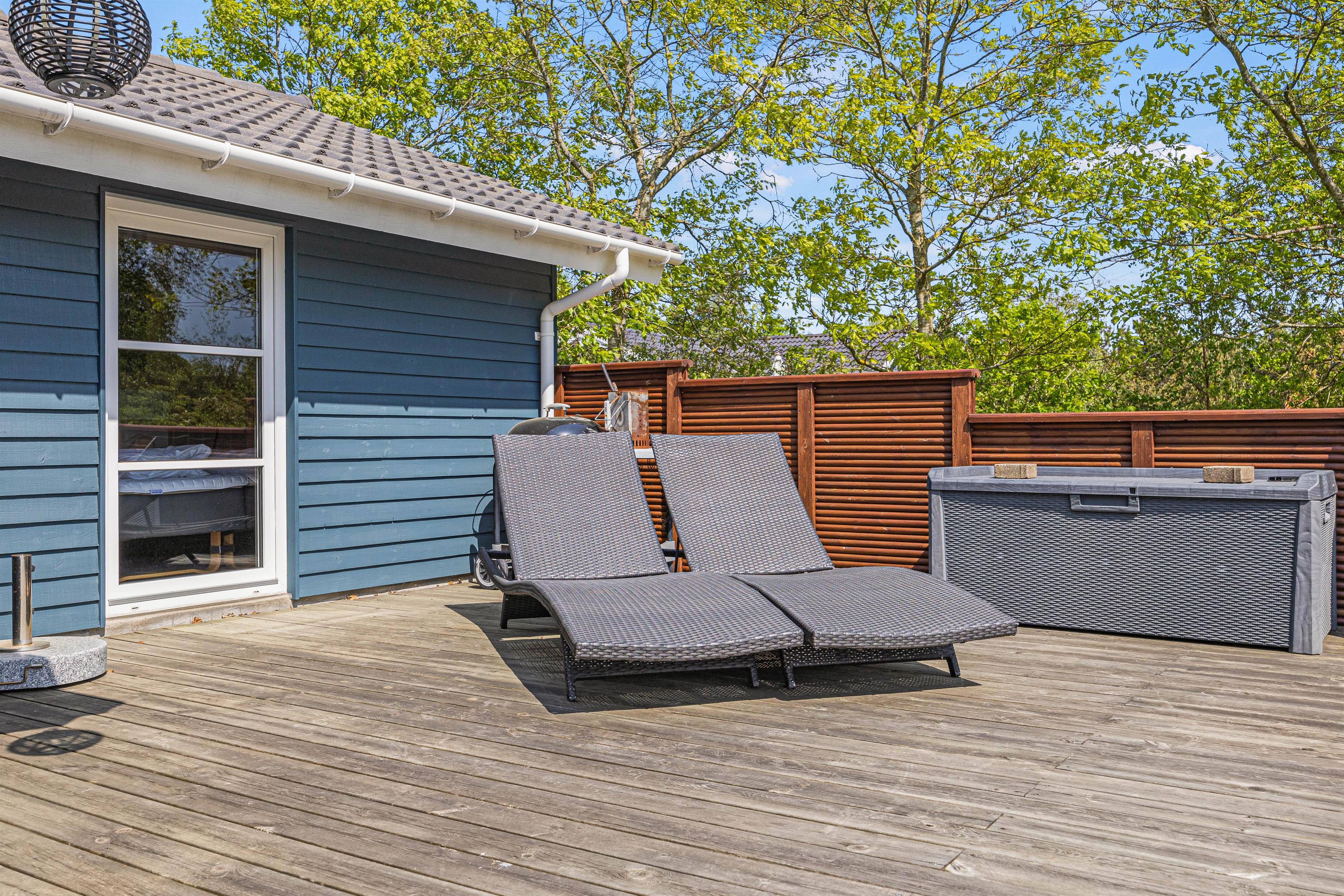 Terrassen har både en åben og en overdækket del, så her kan I opholde jer i al slags vejr. Nyd solen i havemøblerne eller på de komfortable solvogne. Sæt parasollen op eller kryb ind i skyggen, hvis solen bliver for stærk. Det er hurtigt at tænde op i gasgrillen, hvis I ønsker at spise et lækkert grillmåltid sammen til aften. Bagefter kan I eventuelt spille et vikingespil på plænen. Der er carport til rådighed for jeres bil.