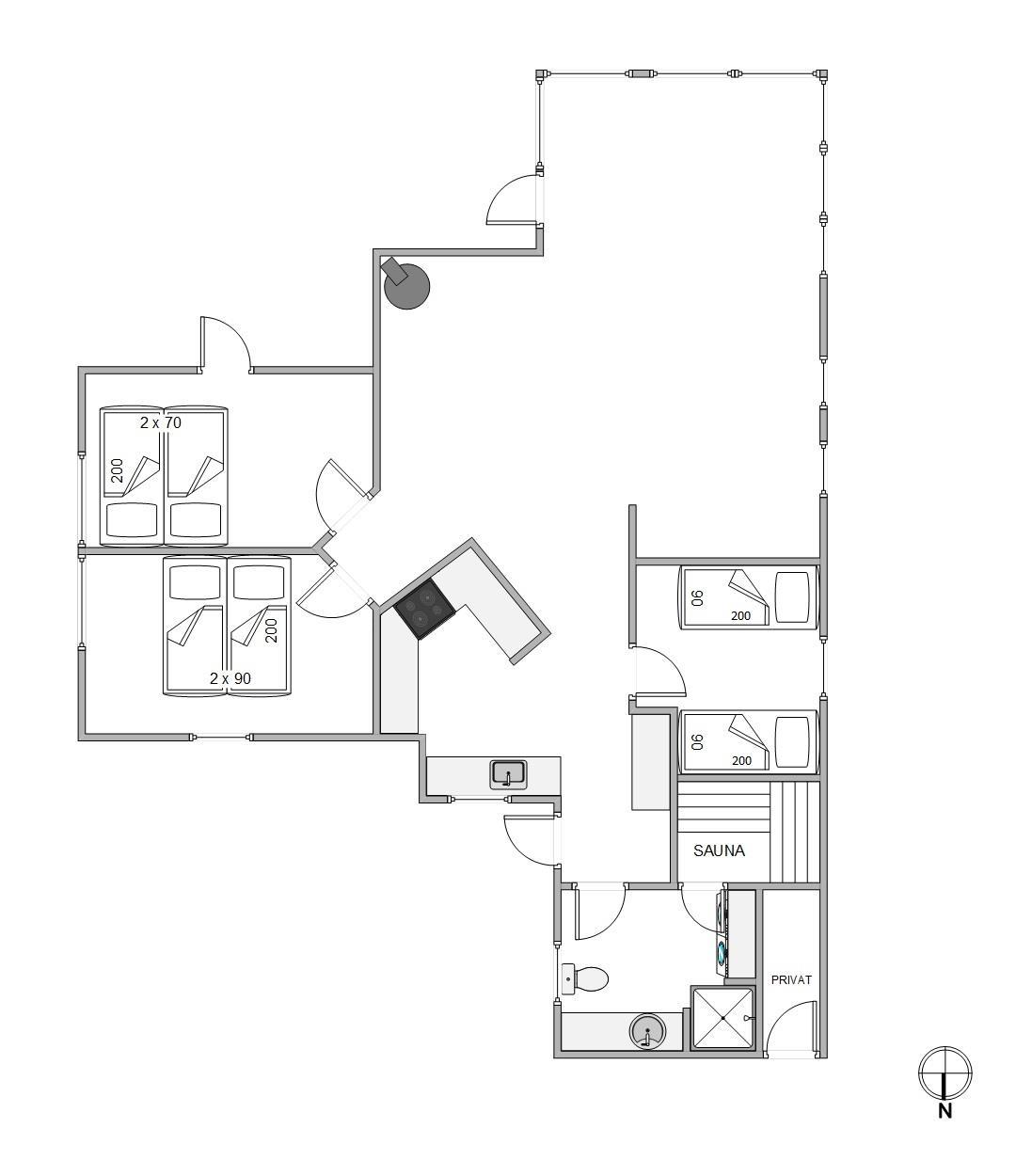 I de 3 soveværelser kan I blive rigtig godt udhvilede i henholdsvis 2 værelser med dobbeltseng og 1 værelse med 2 enkeltsenge. I forbindelse med badeværelset er der både sauna samt vaskemaskine og tørretumbler. En energibesparende varmepumpe forefindes også i sommerhuset, så I er sikret en konstant og behagelig temperatur under opholdet.