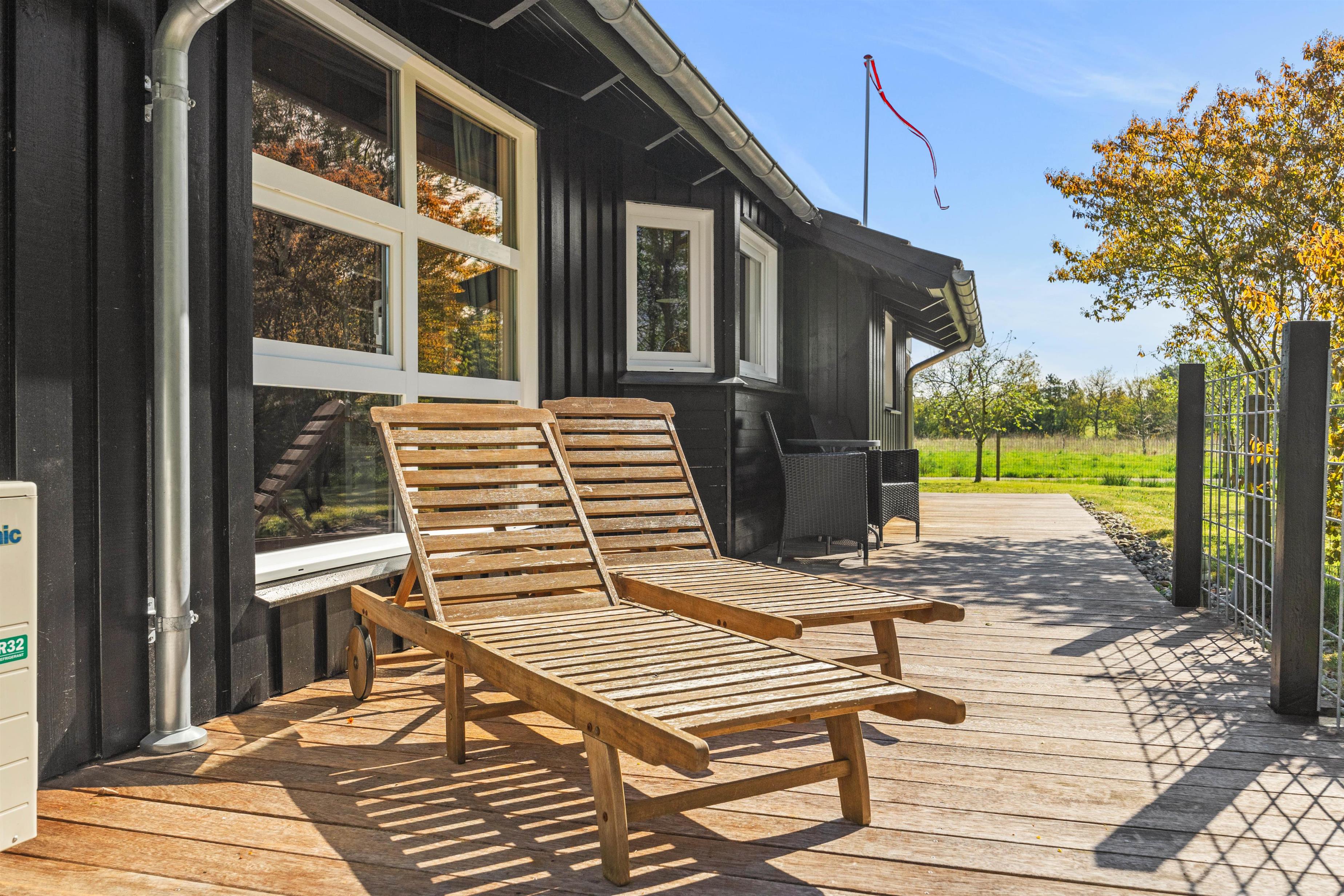 Solvogne og havemøbler står klar til at I kan nyde de mange dejlige hjørner og hyggelige terrasser, der findes omkring dette feriehus. Fra østterrassen er der den flotteste udsigt over Hennebys populære og velbesøgte golfbane.