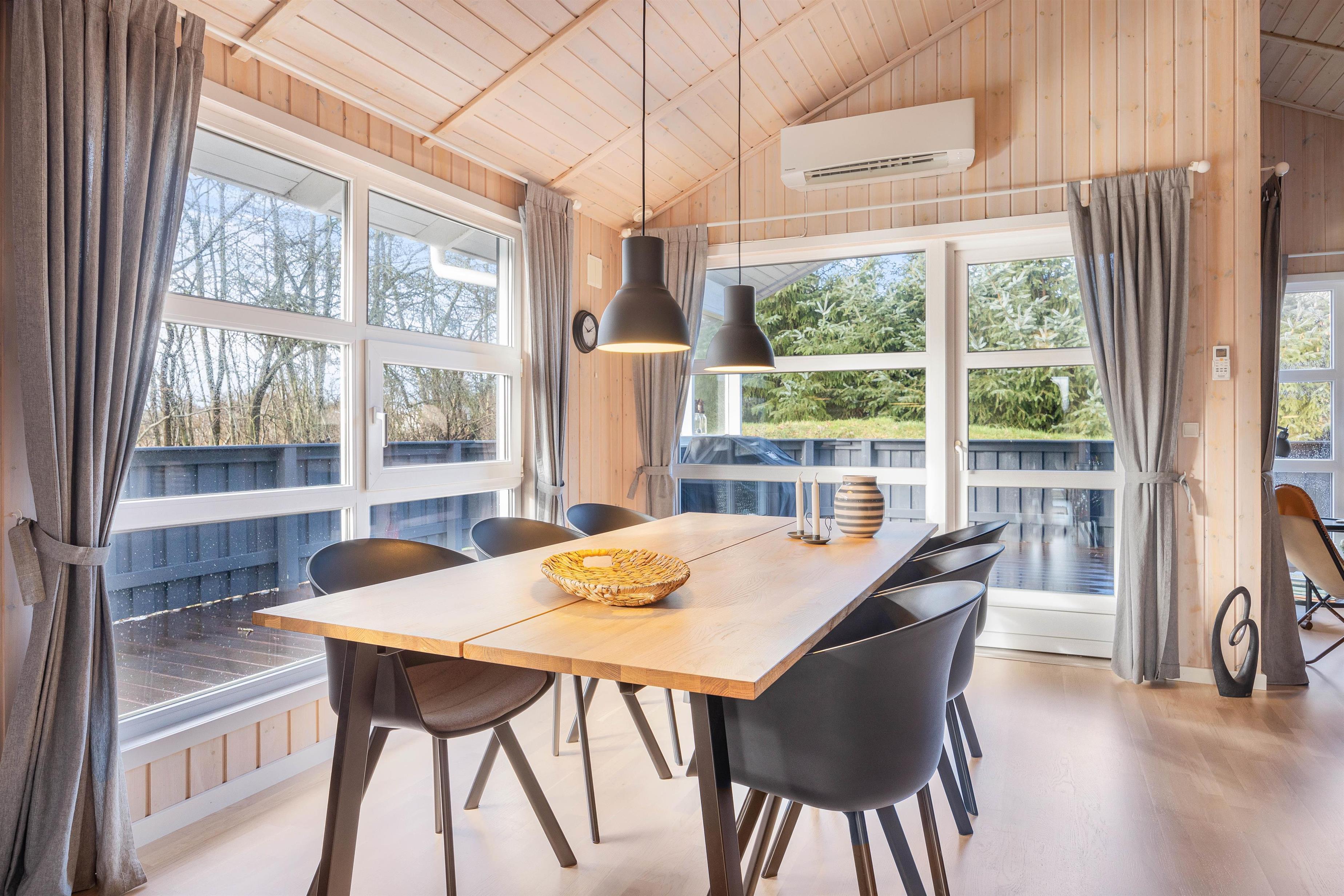 Feriehusets rum varmes op med elvarme, men både brændeovnen og den energivenlige varmepumpe vil være behjælpelige med at holde en behagelig temperatur til lave omkostninger.
