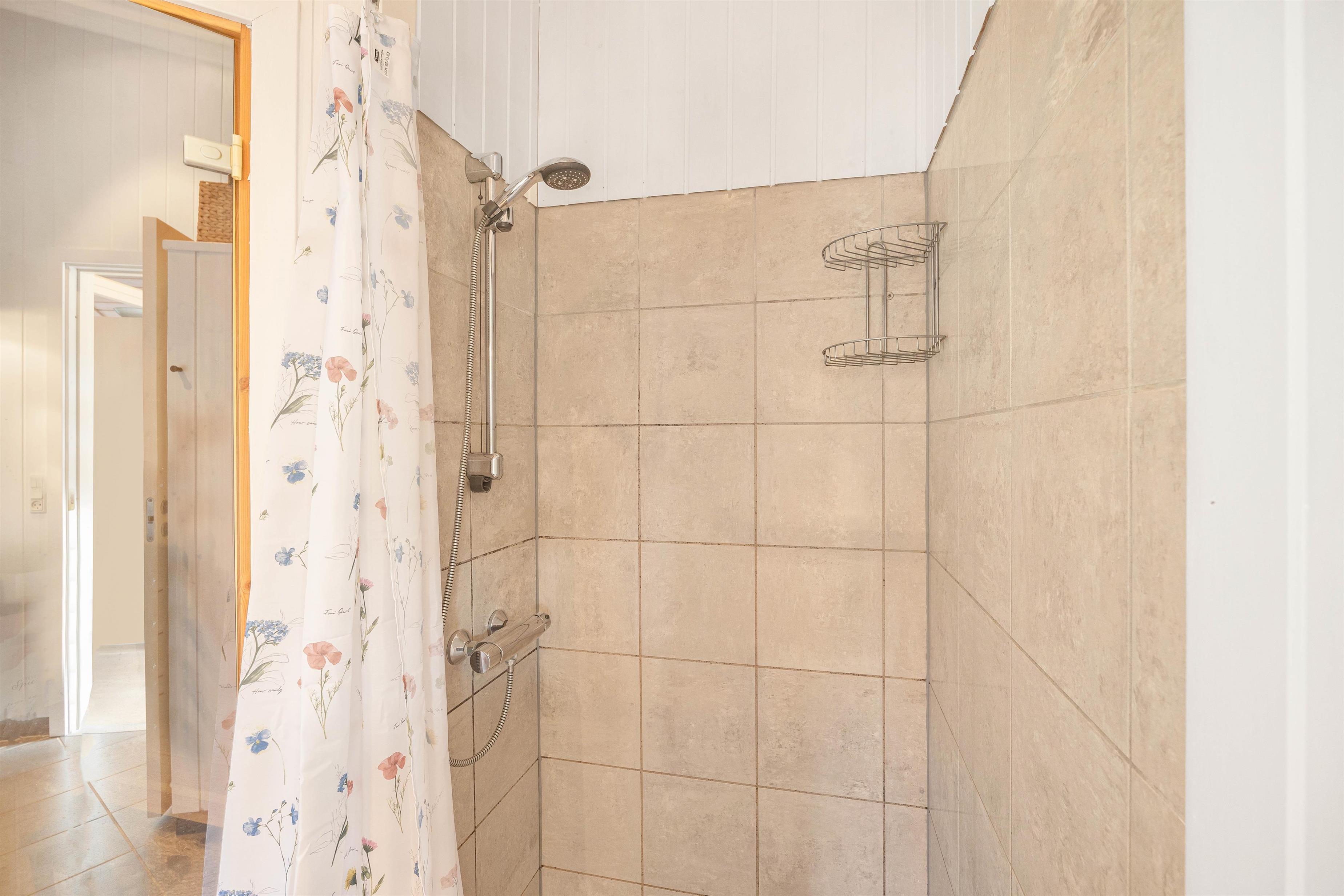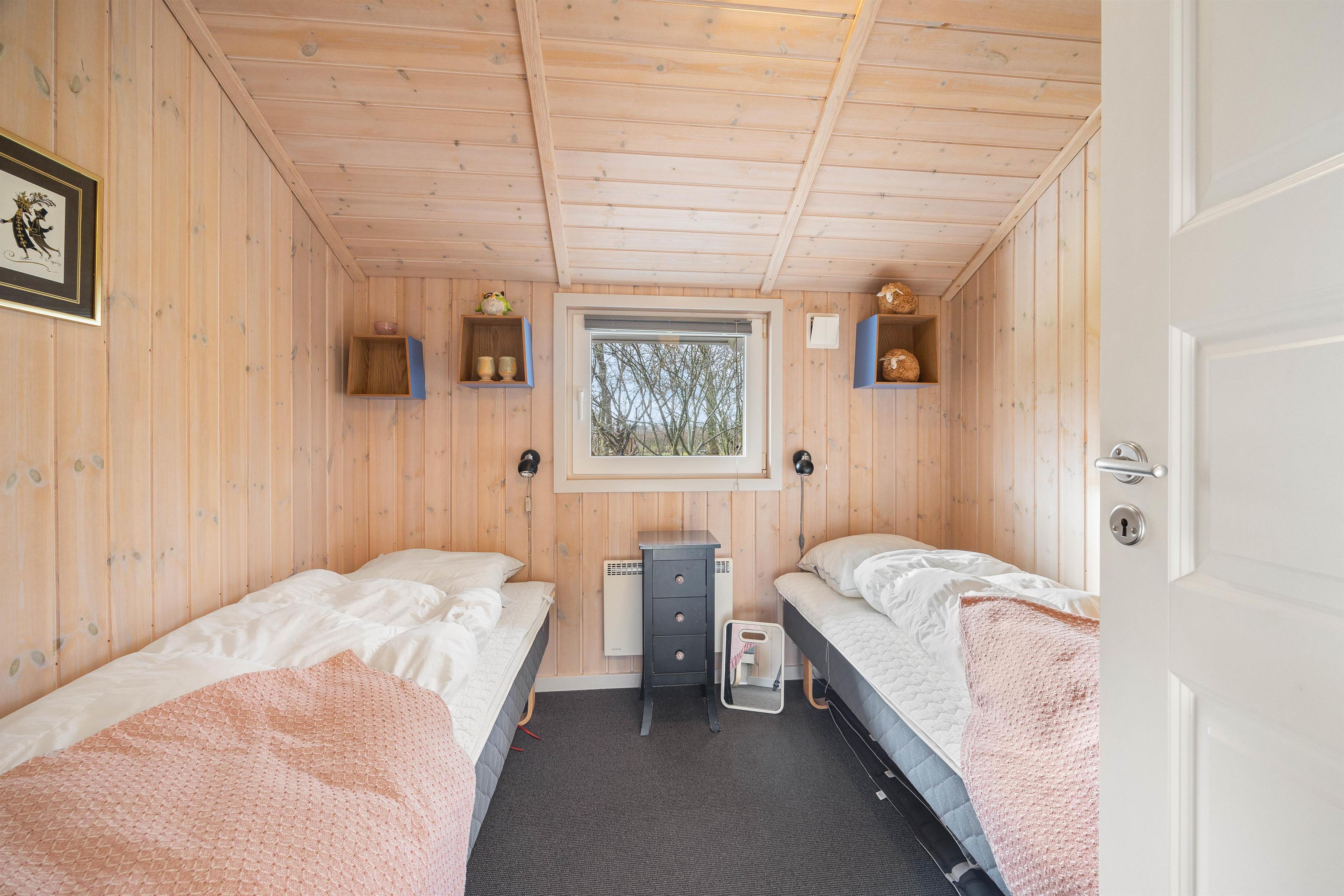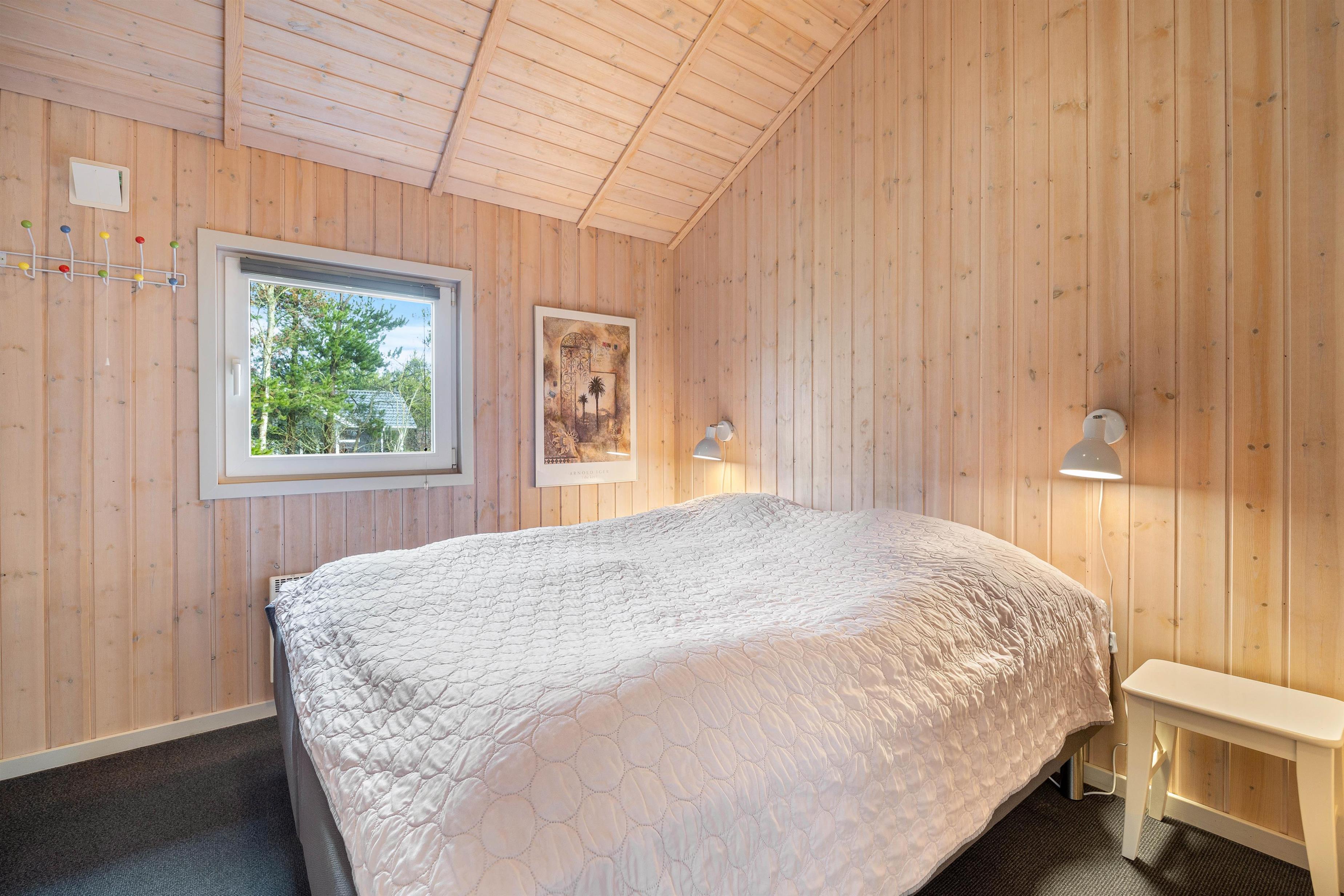 Dette 84 m² store feriehus har 1 badeværelse samt 2 gode soveværelser. Et af soveværelserne er indrettet med 1 dobbeltseng og indbyggede skabe, det andet soveværelse har 2 enkeltsenge og faste skabe. Det flotte og rummelige badeværelse med gulvvarme rummer vaskesøjle, bruseniche, en dejlig spa til 2 personer samt sauna.