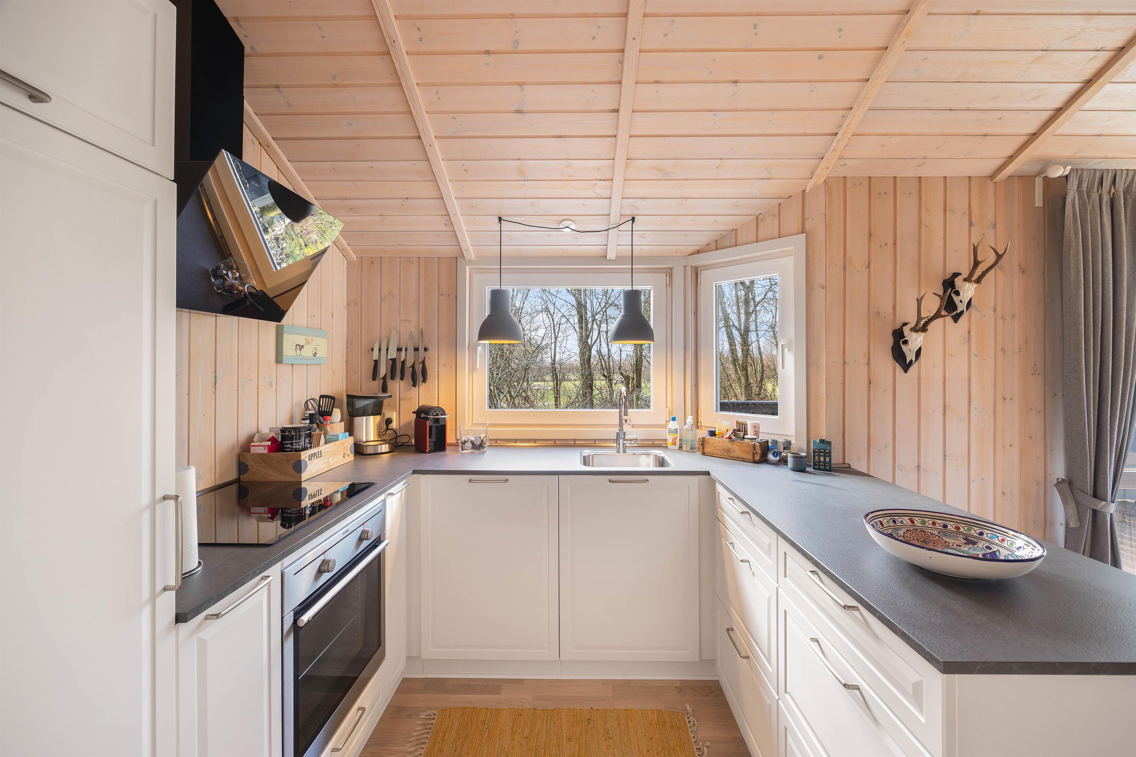 Dette ikke-rygerhus på Hennebysvej 42i i Henneby er indrettet med et kombineret køkken og opholdsstue med spiseplads, som er et oplagt samlingssted for familiehyggetid, hvor I kan se film, spille spil og lave mad, imens I alle er samlet. Rummet fremtræder lyst og indbydende med lofter til kip og fra det store vinduesparti mod vest strømmer der et pænt og naturligt lys ind i rummet. Køkkenet er veludstyret og indeholder både opvaskemaskine og mikroovn.