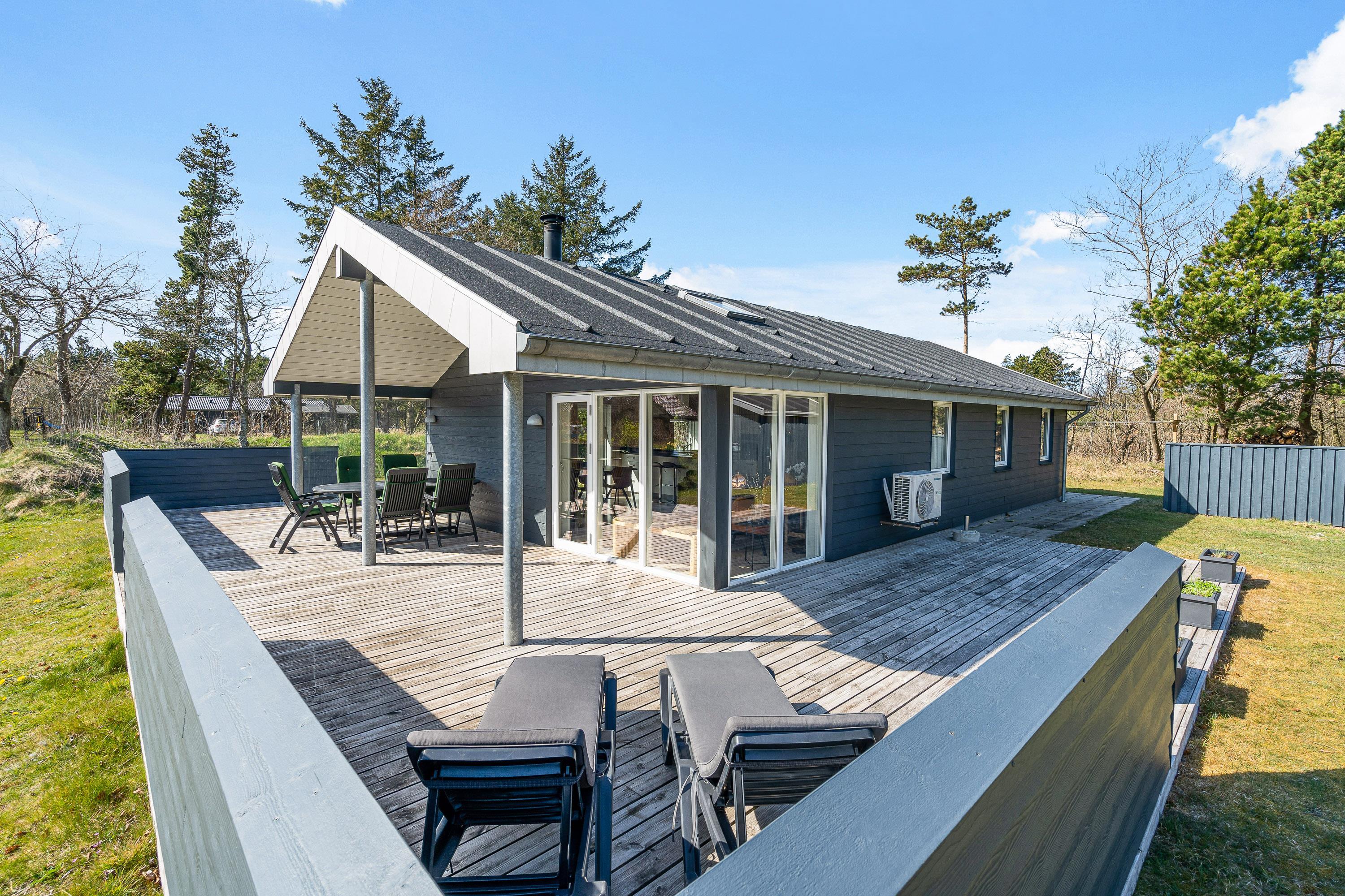 På sommerhusets udeområde venter jer blandt andet en delvist overdækket og afskærmet terrasse, som I kan finde jer til rette på i havemøblerne og liggestolene. Find jer en god plads i solen og læn jer tilbage, mens I nyder ferien til fulde.