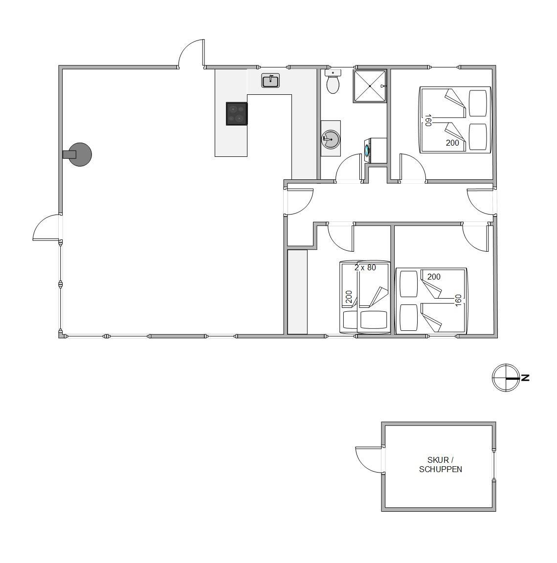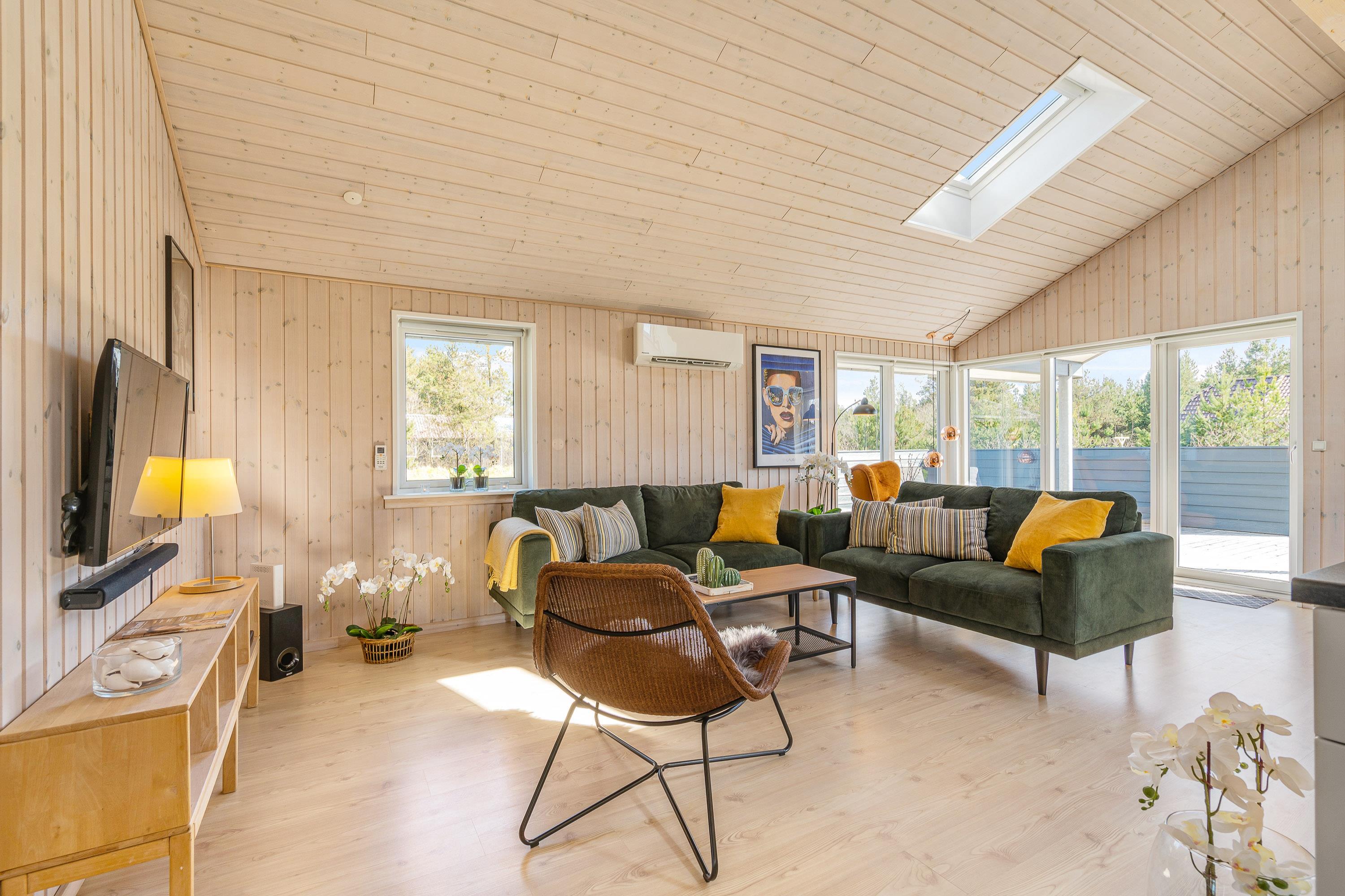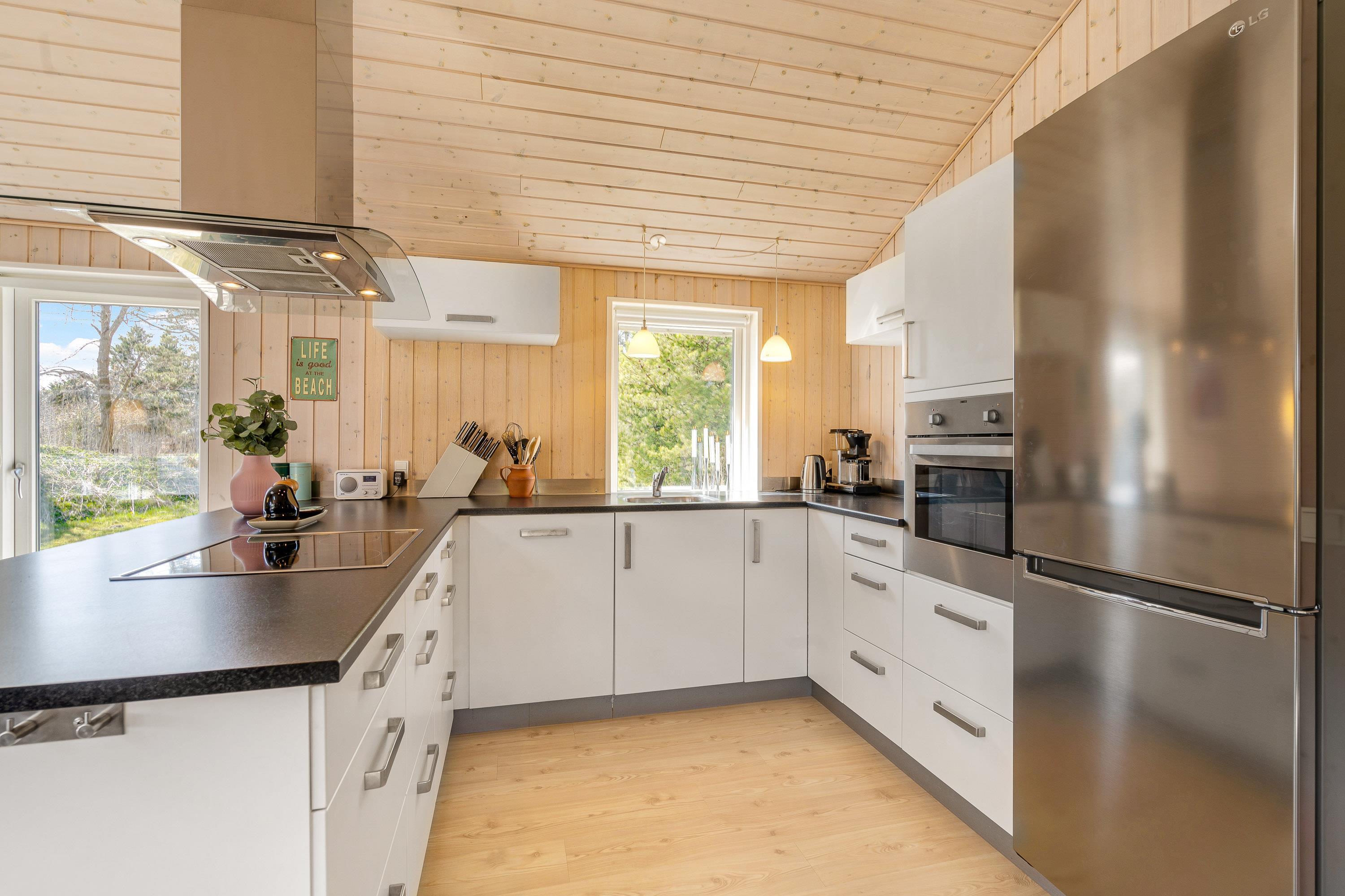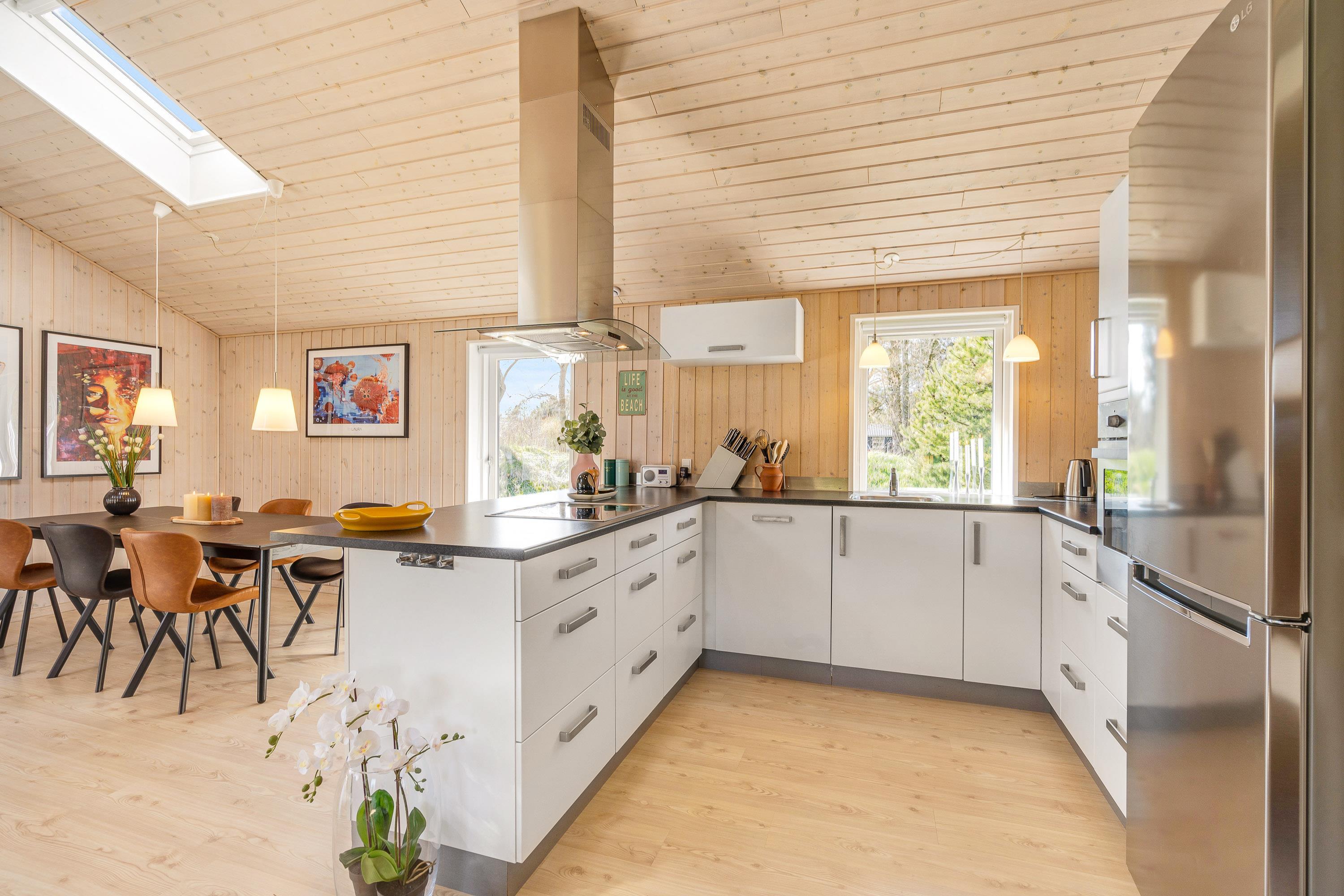 Hjertet i sommerhuset er alrummet, der samler køkken, stue og spiseplads i ét, hvor rammerne er sat for hyggelige stunder med hele ferieflokken. Her kan I lave god mad i køkkenet, spille et sjovt spil ved bordet eller streame jeres yndlingsfilm i tv’et via Chromecasten. Alt sammen akkompagneres af brændeovnens knitrende flammer i baggrunden, der fuldender feriestemningen.