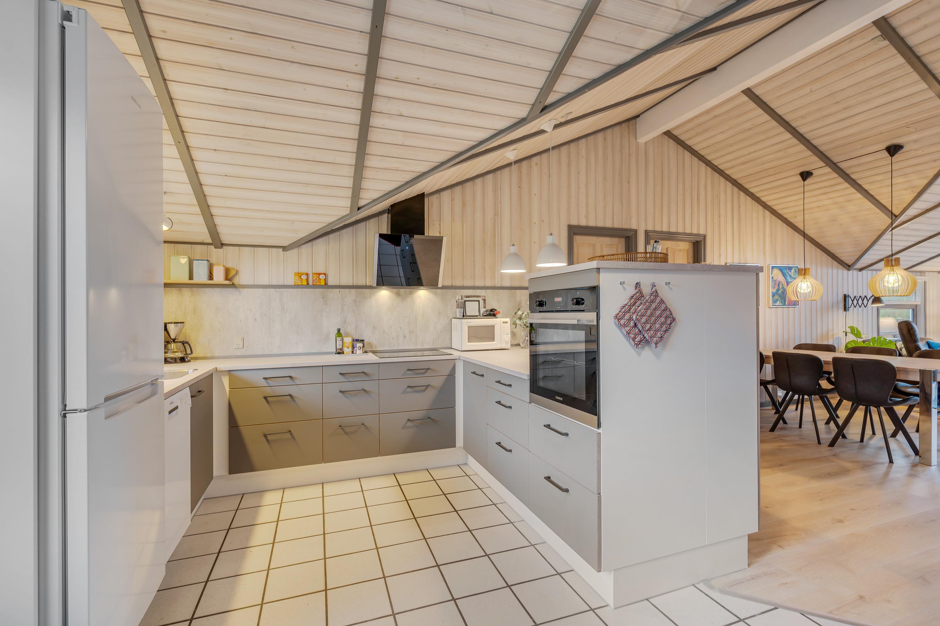 Det åbne køkken, som er renoveret i januar 2022, er veludstyret med opvaskemaskine, stort køle/fryseskab, ovn mv., og er ideelt til hygge omkring fælles madlavning. Køkken og stue befinder sig i det samme åbne rum, og det er med til at skabe en åben atmosfære, hvor hele familien kan samles ét sted, og hvor der er god plads til alle.