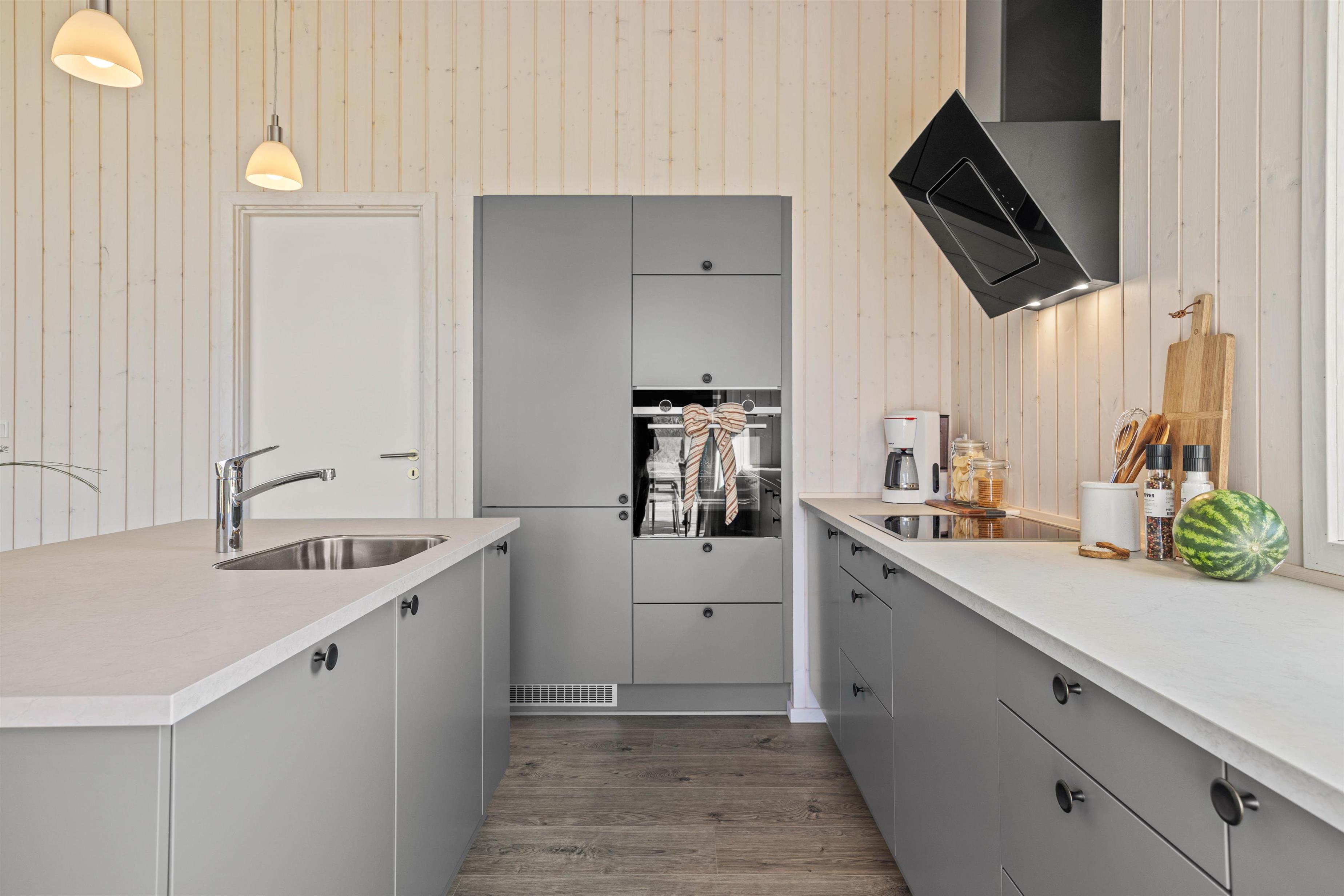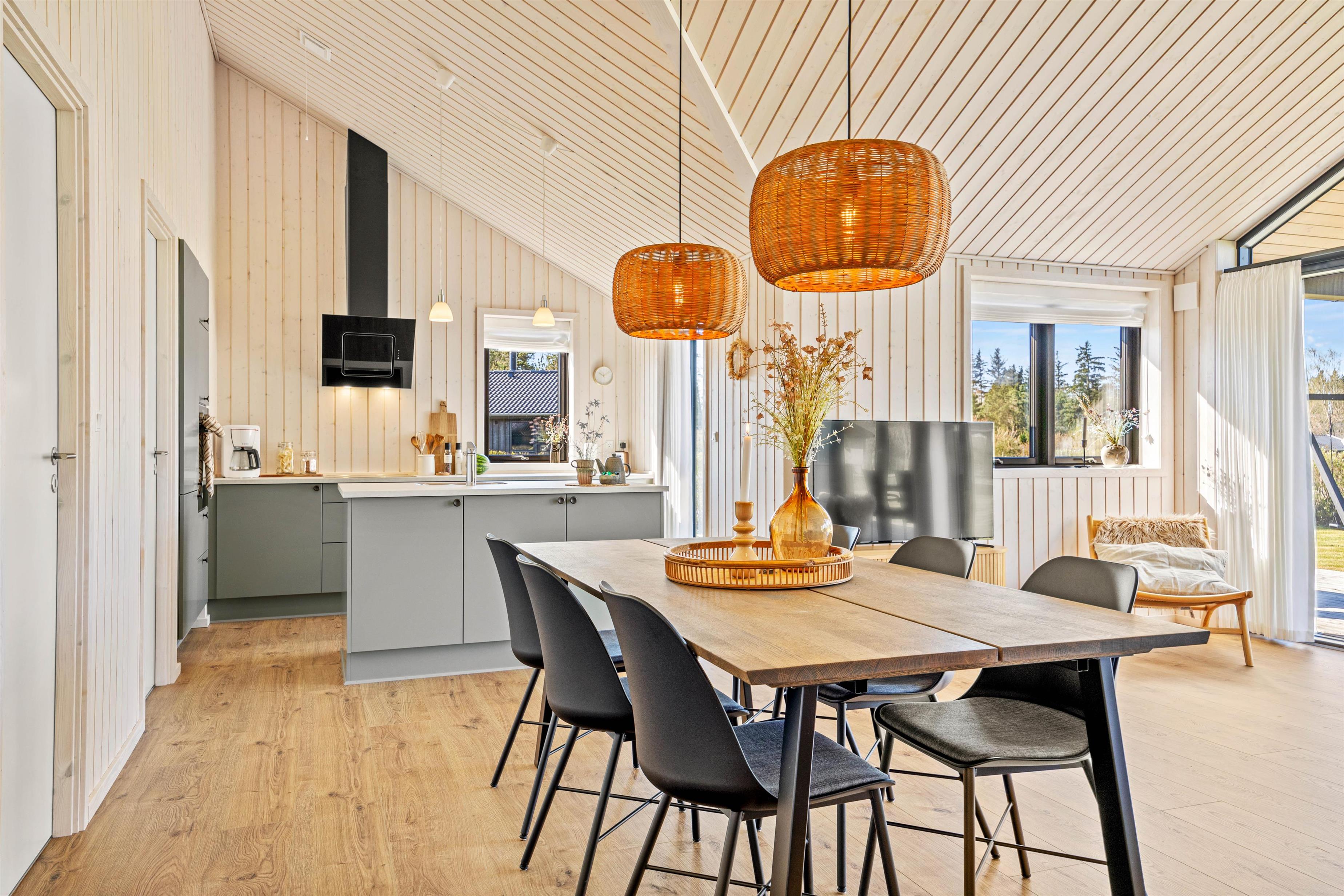 Det lyse og åbne alrum danner rammen om jeres ferie – her er køkken, spiseplads og opholdsområde samlet i ét indbydende rum, hvor I kan nyde feriedagene sammen. I stuen kan I slappe af i komfortable møbler, mens de store vinduespartier lader dagslyset strømme ind og skaber en behagelig atmosfære. Varmepumpen sørger for et stabilt og behageligt indeklima året rundt.