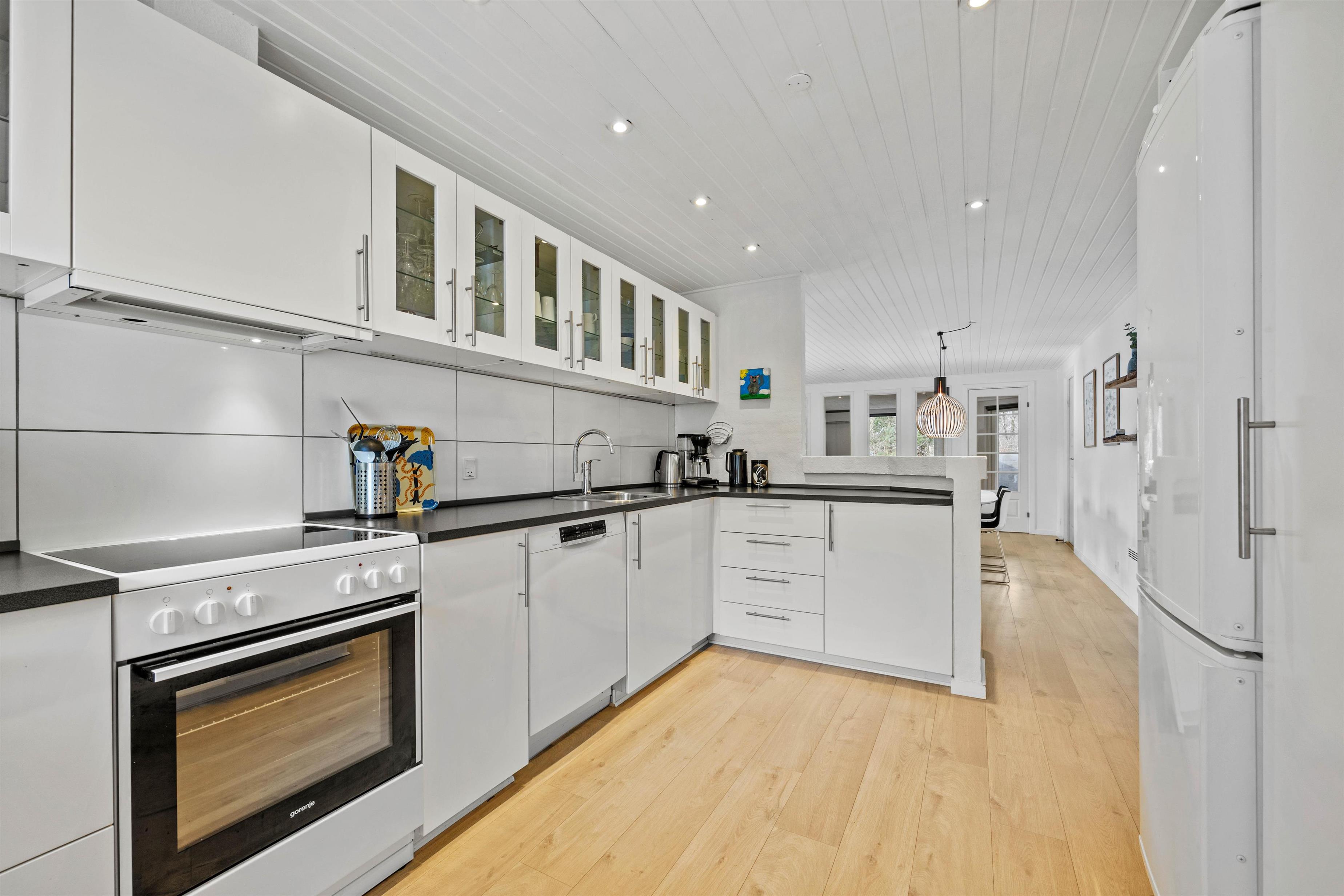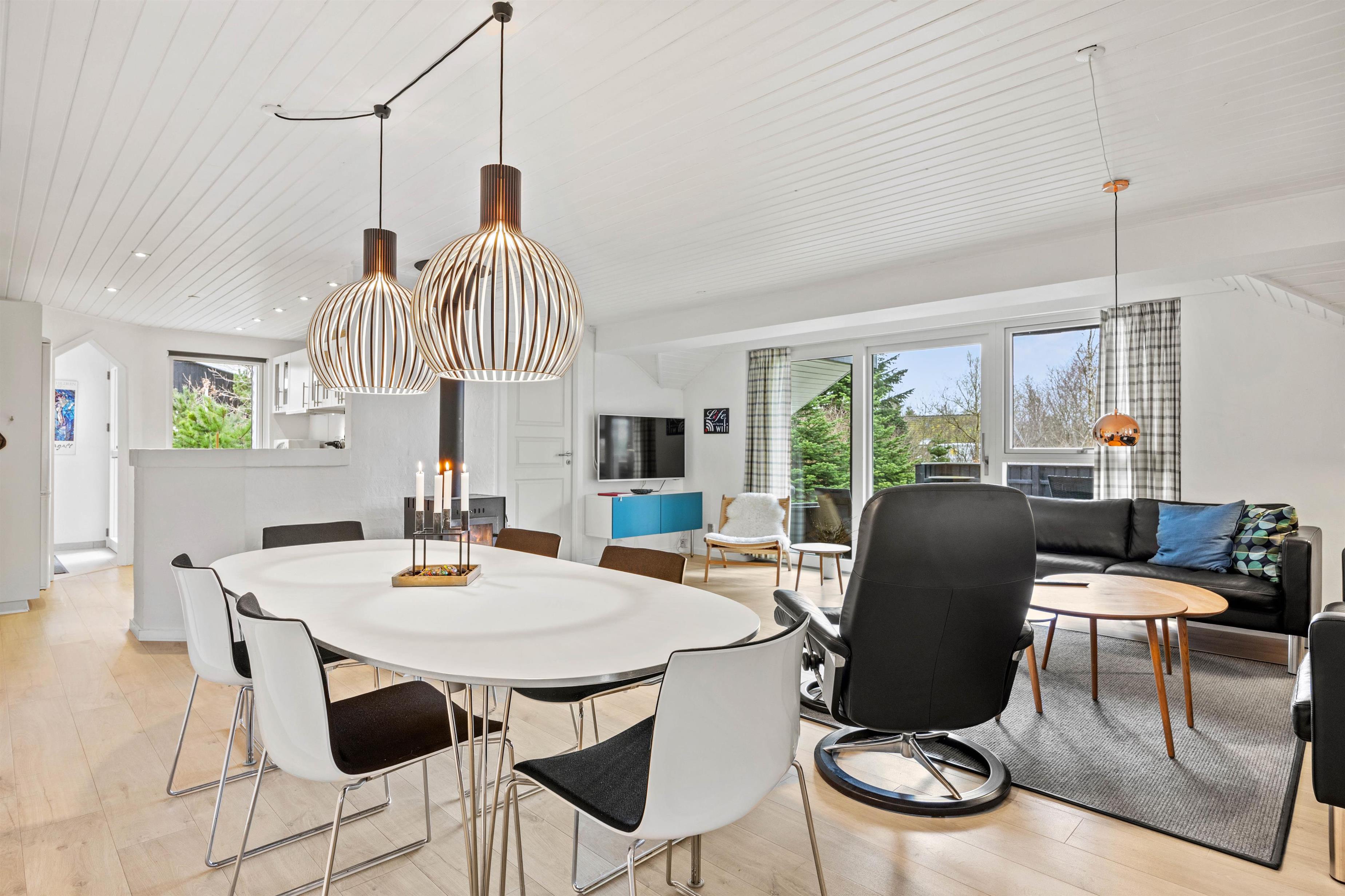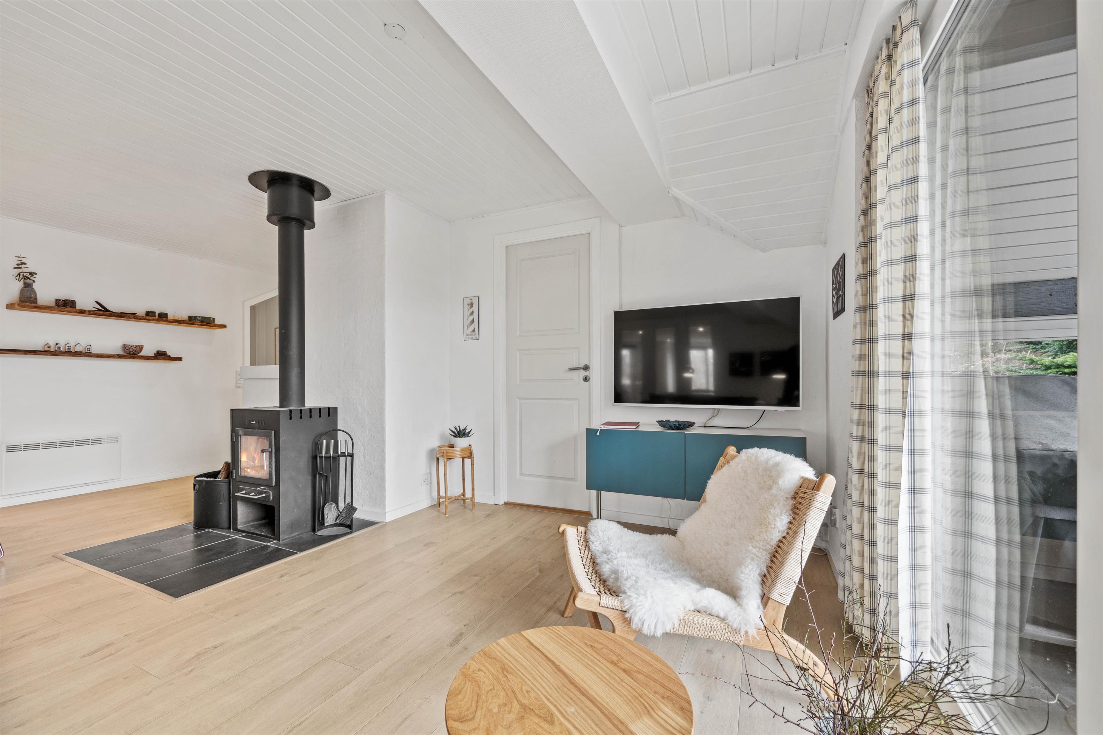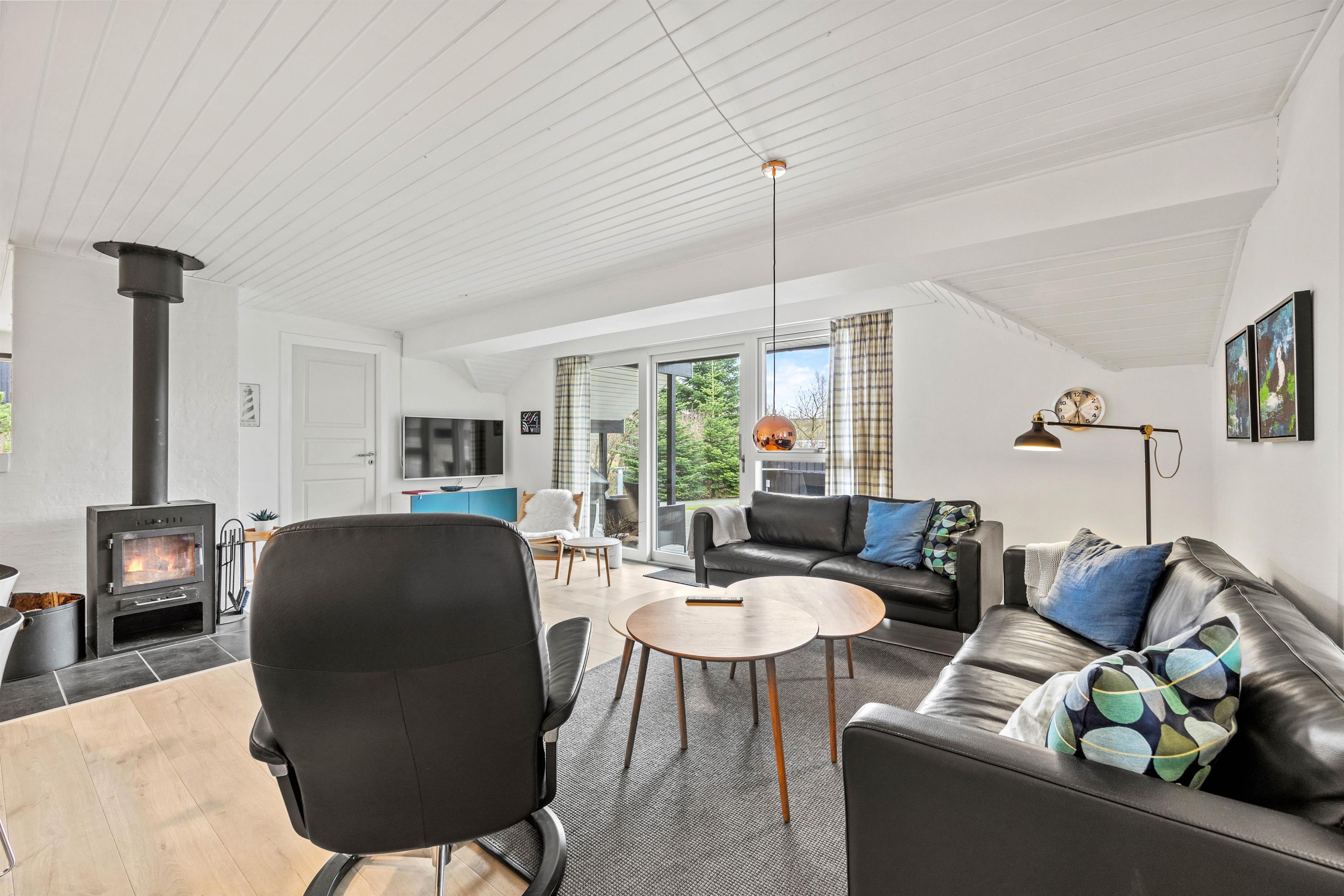 Dette 150 m2 store sommerhus er indrettet med 4 gode soverum og 2 badeværelser. Det store køkken er lyst og veludstyret. I stuen er der rigelig plads til hygge med spil, en god bog eller en god film, brændeovnen sørger for en ekstra hyggefaktor.