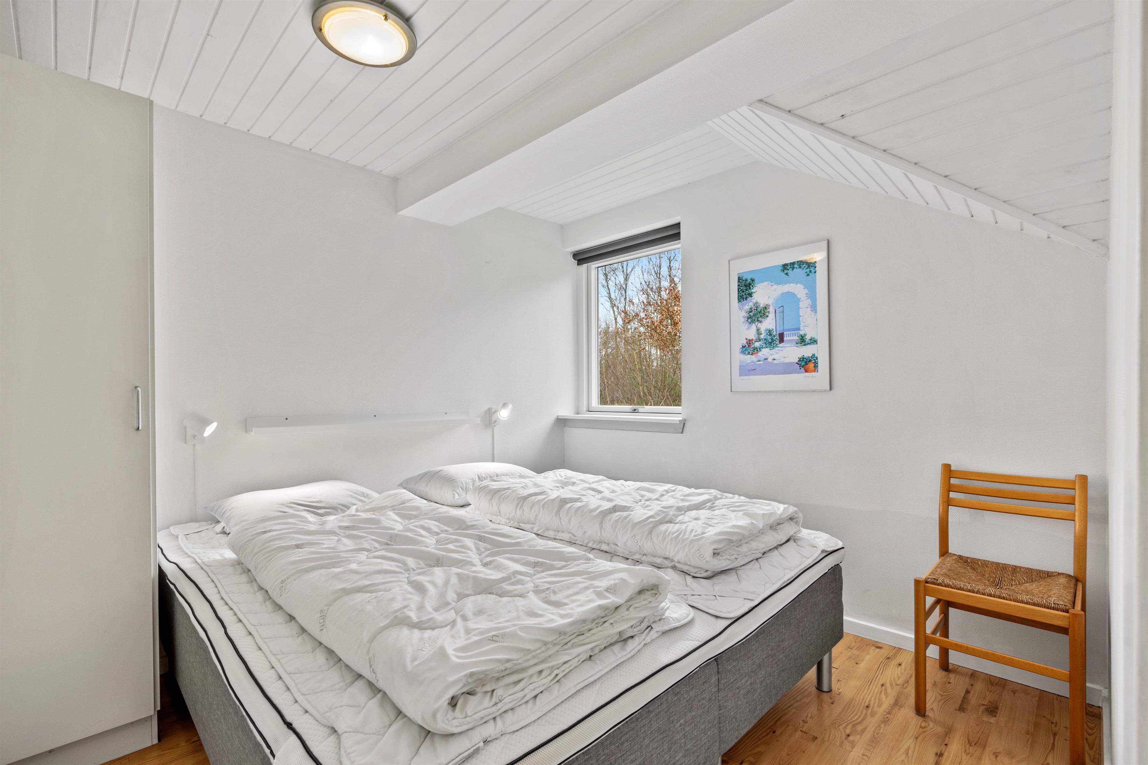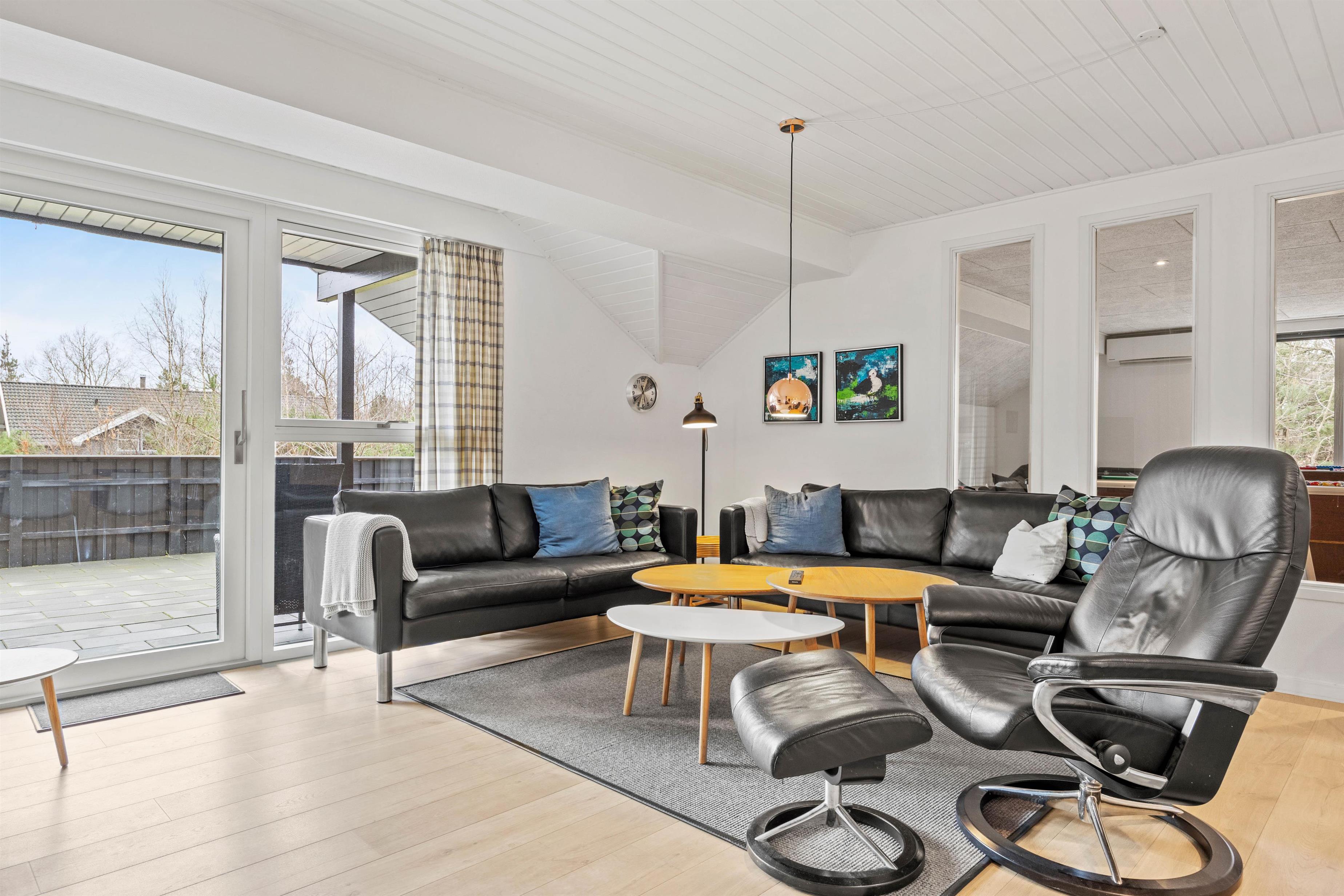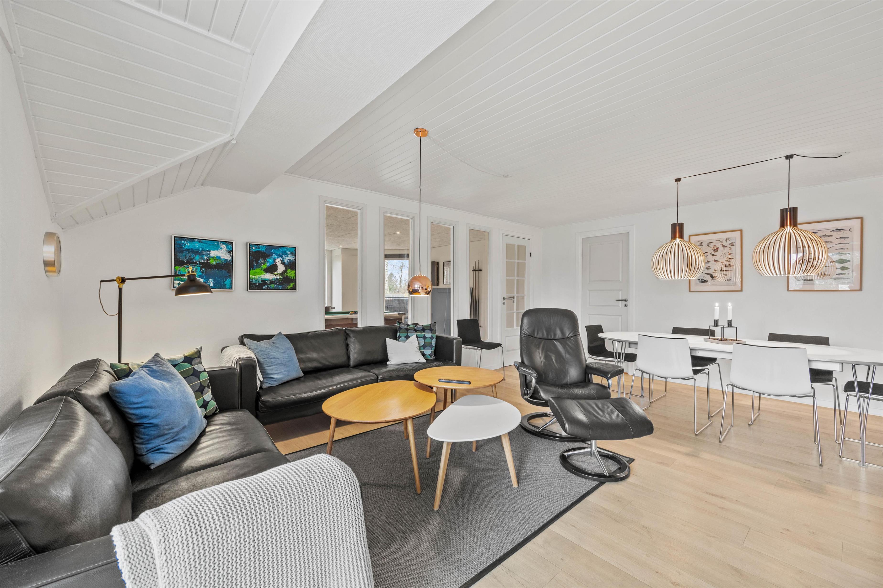 Dette 150 m2 store sommerhus er indrettet med 4 gode soverum og 2 badeværelser. Det store køkken er lyst og veludstyret. I stuen er der rigelig plads til hygge med spil, en god bog eller en god film, brændeovnen sørger for en ekstra hyggefaktor.