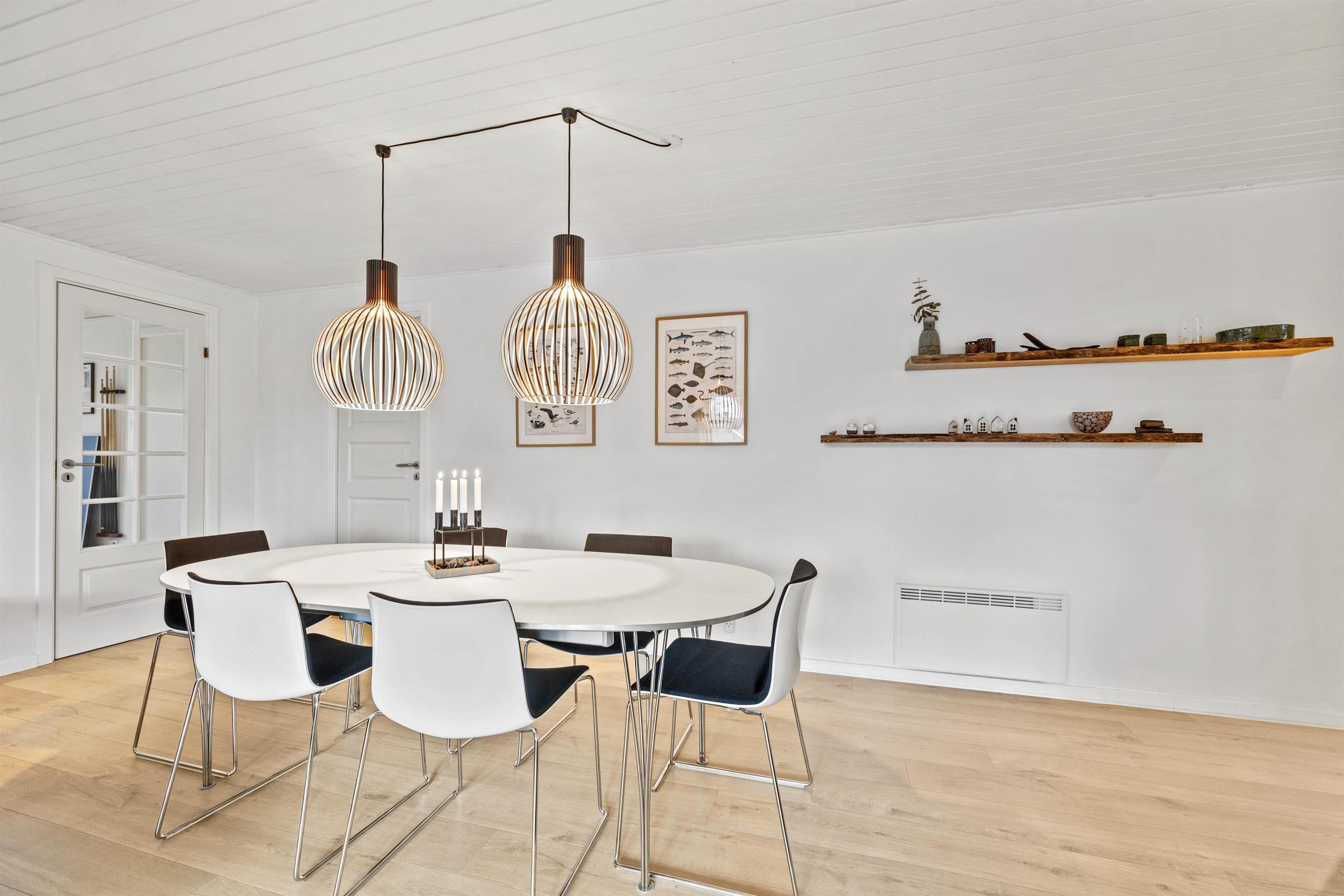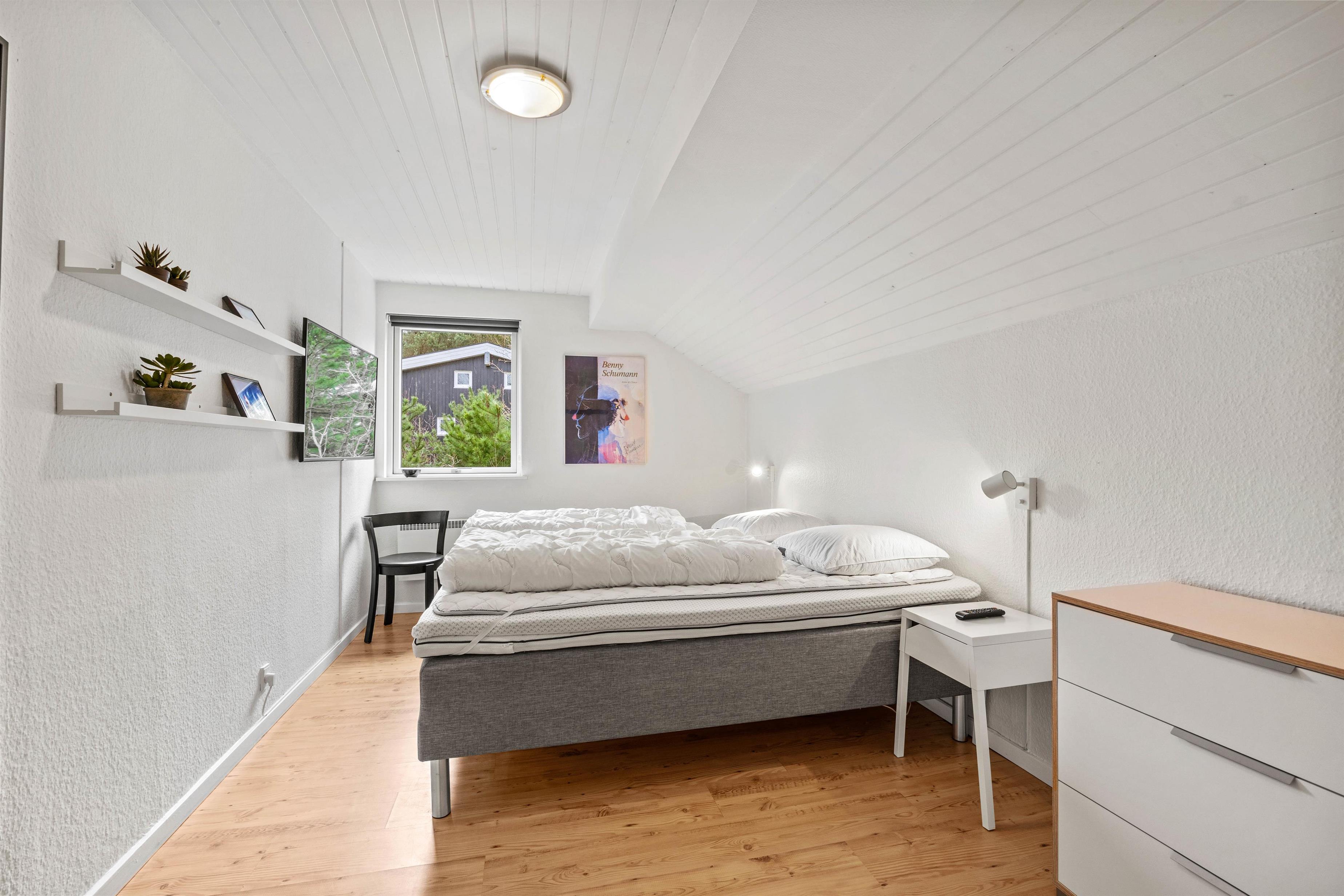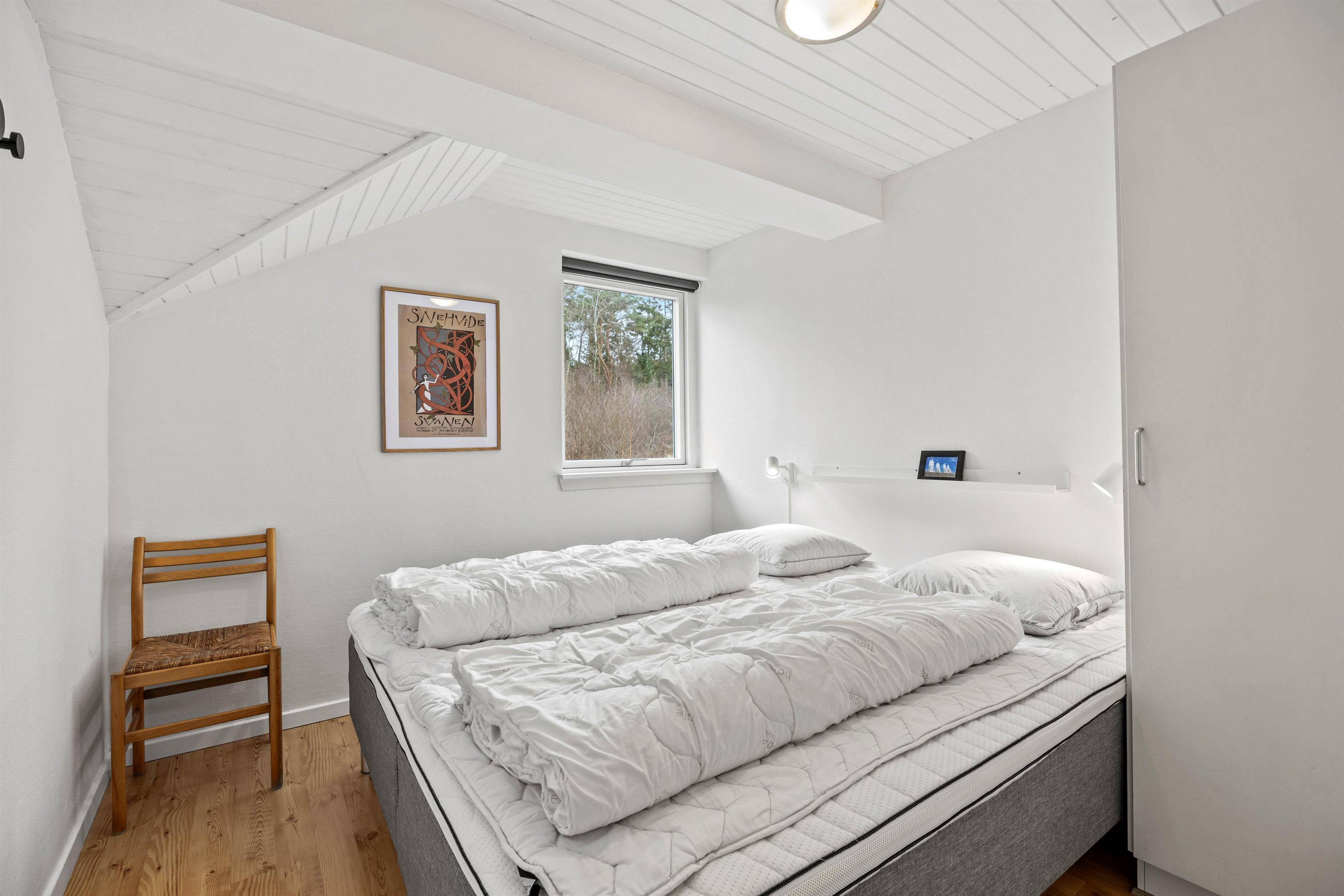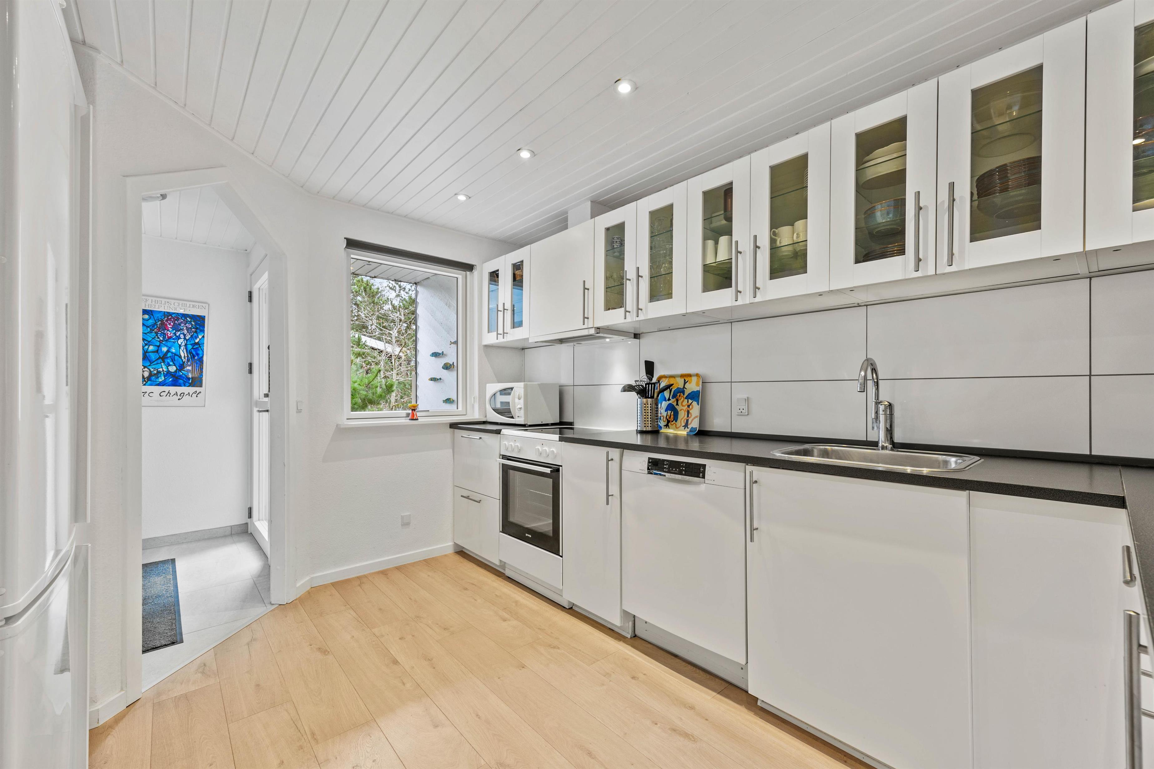 Dette 150 m2 store sommerhus er indrettet med 4 gode soverum og 2 badeværelser. Det store køkken er lyst og veludstyret. I stuen er der rigelig plads til hygge med spil, en god bog eller en god film, brændeovnen sørger for en ekstra hyggefaktor.