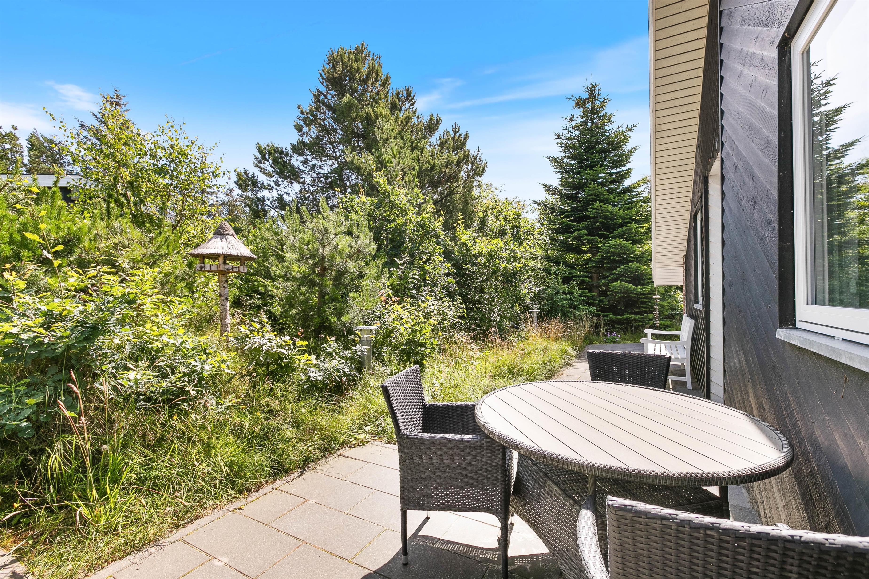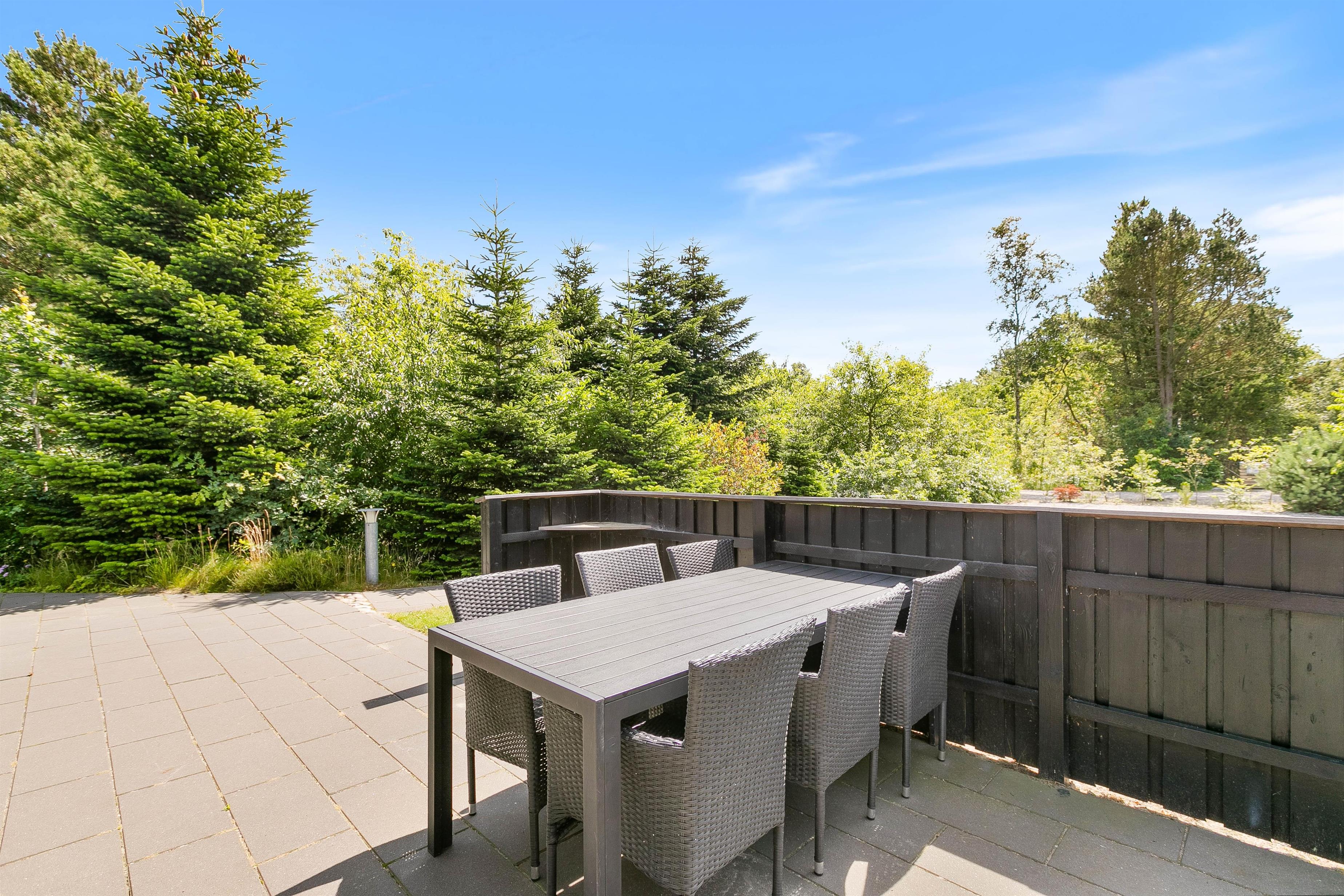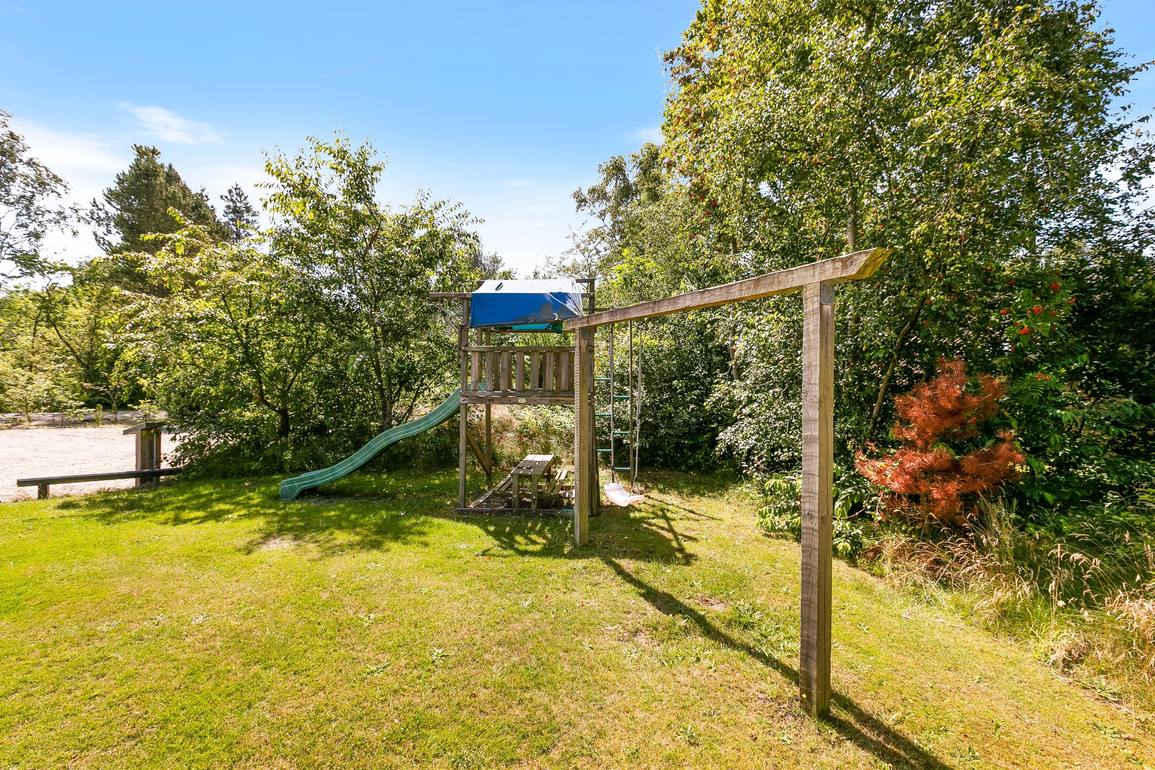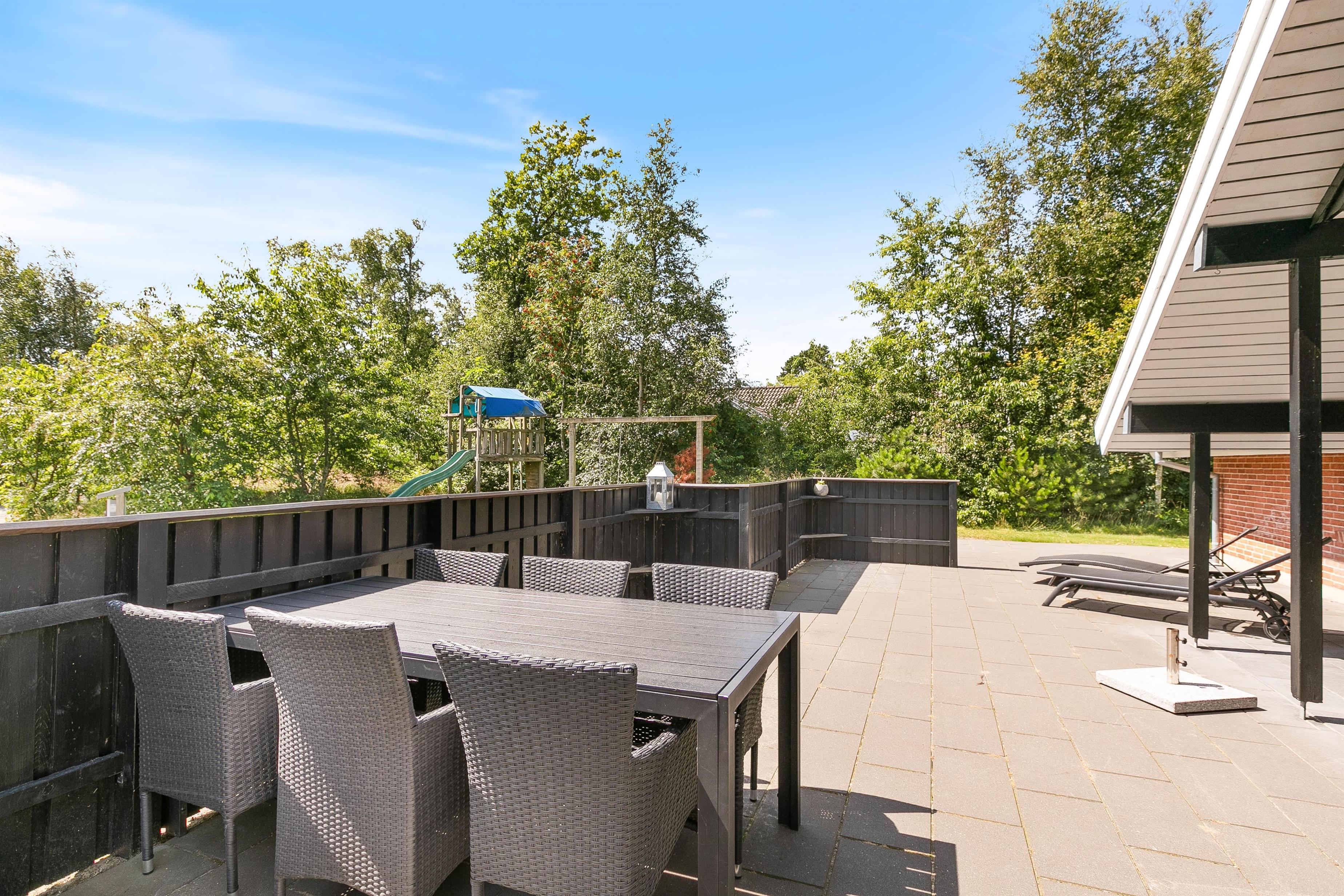 Drik morgenkaffen på morgenterrassen, nyd solen midt på dagen i de dejlige havemøbler på den store delvist aflukkede og ugenerere terrasse med direkte udgang fra huset og afslut dagen på den flotte træterasse med aftenssol. Den dejlige naturgrund med træbevoksningen giver ro og læ, så I kan nyde terrassetiden, imens børnene gynger eller klatrer og leger i legtårnet med rutchebane.