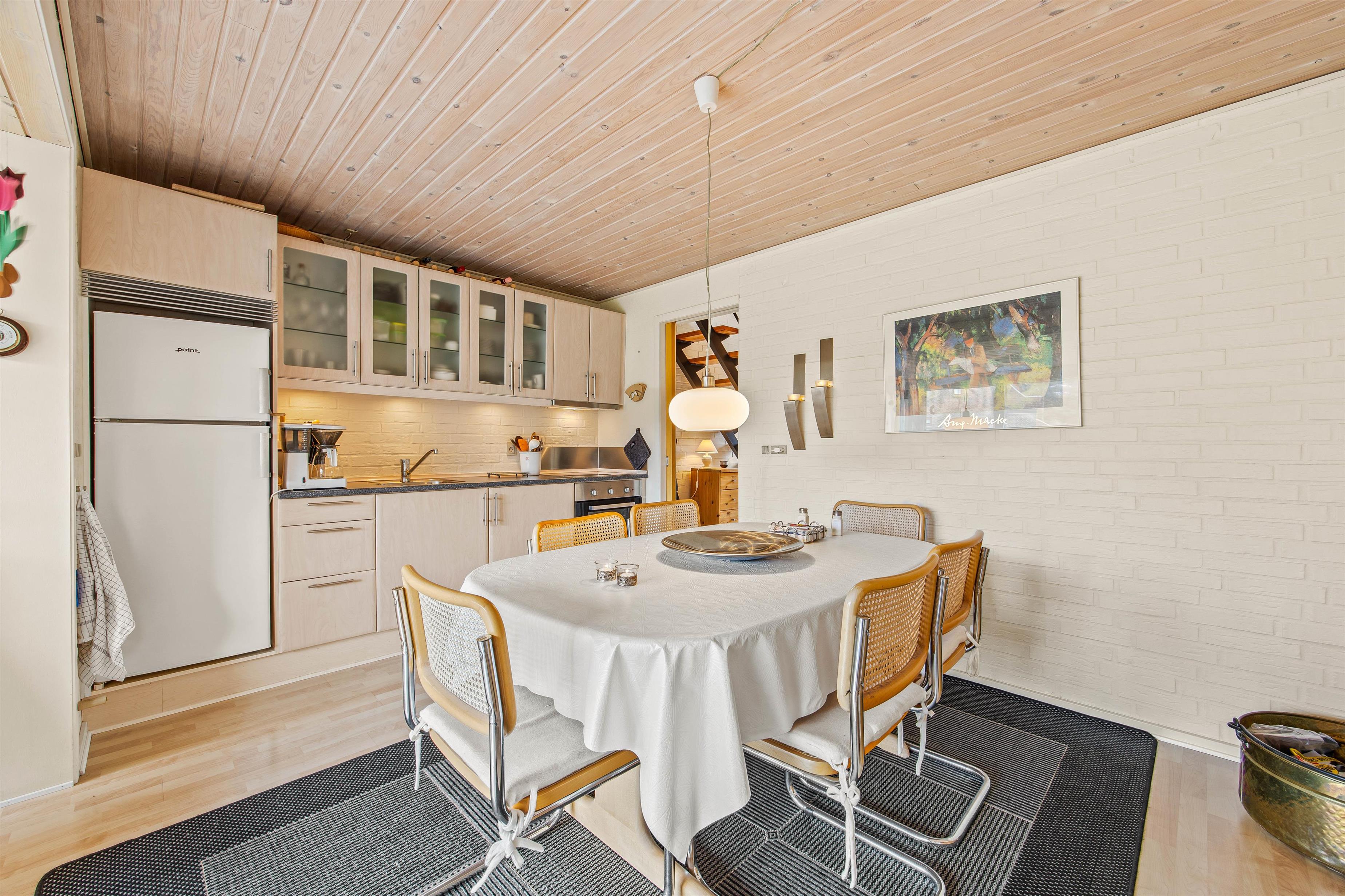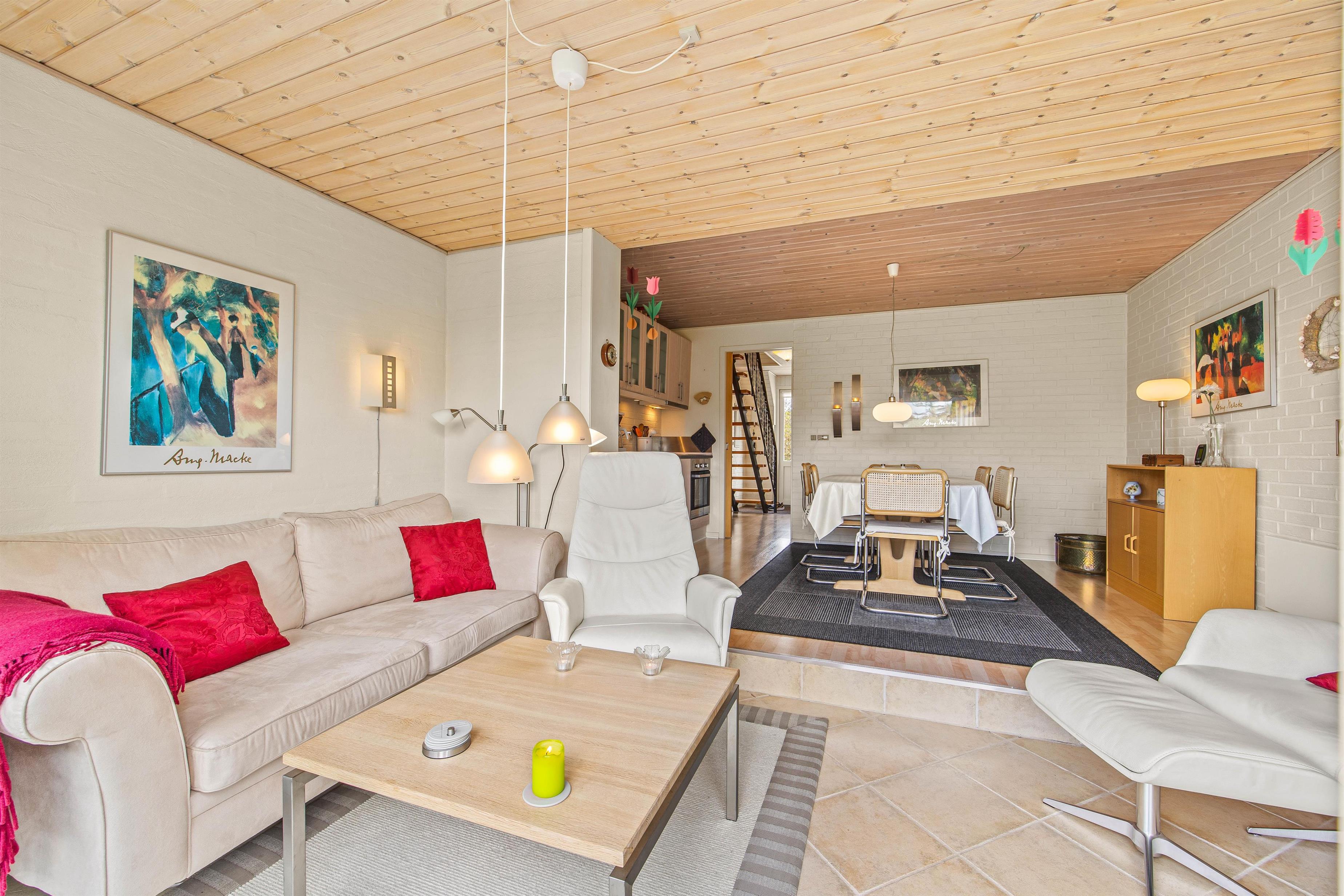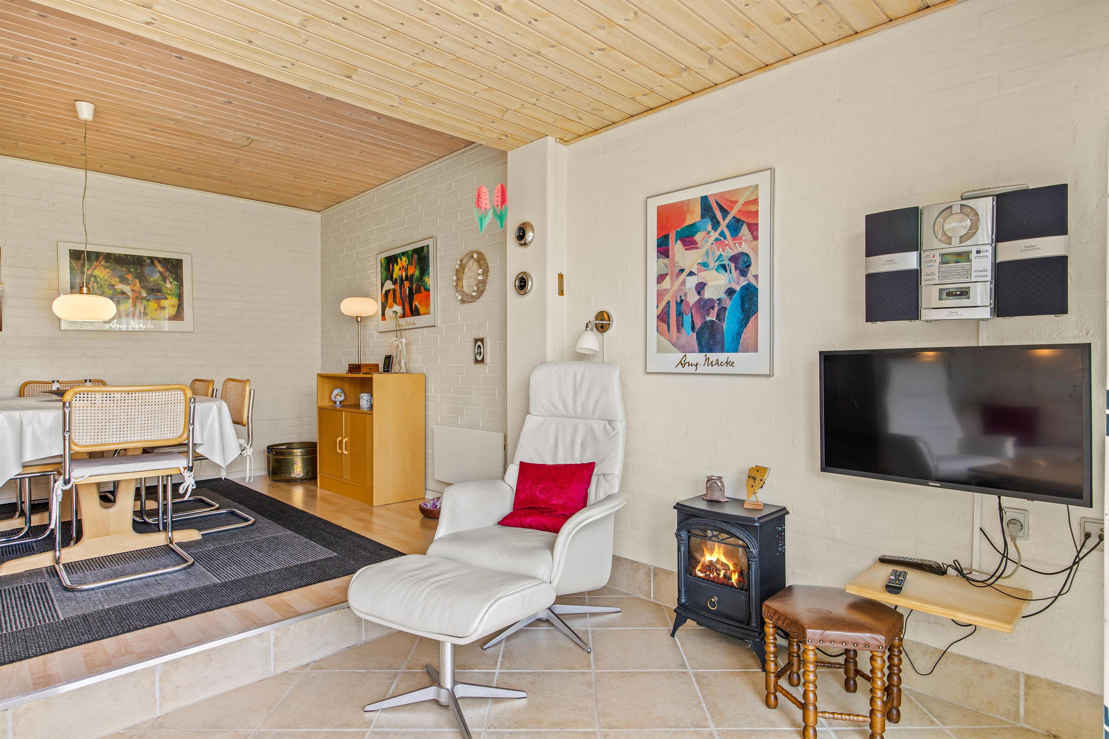 Ferielejlighedens 60m2 er fordelt over 2 etager. I stueplan finder I det veludstyrede køkken i forlængelse af den flotte stue, hvor den elektriske pejs er med til at sprede den helt rigtige feriestemning.