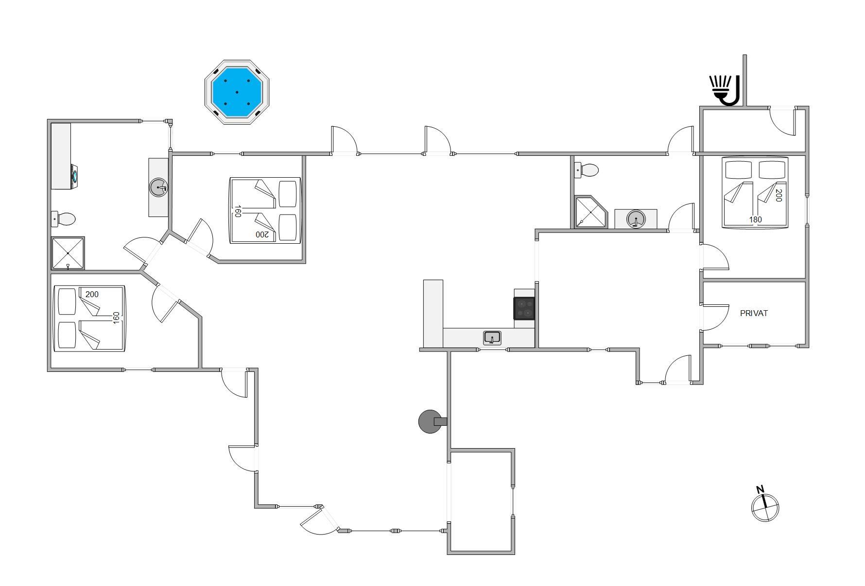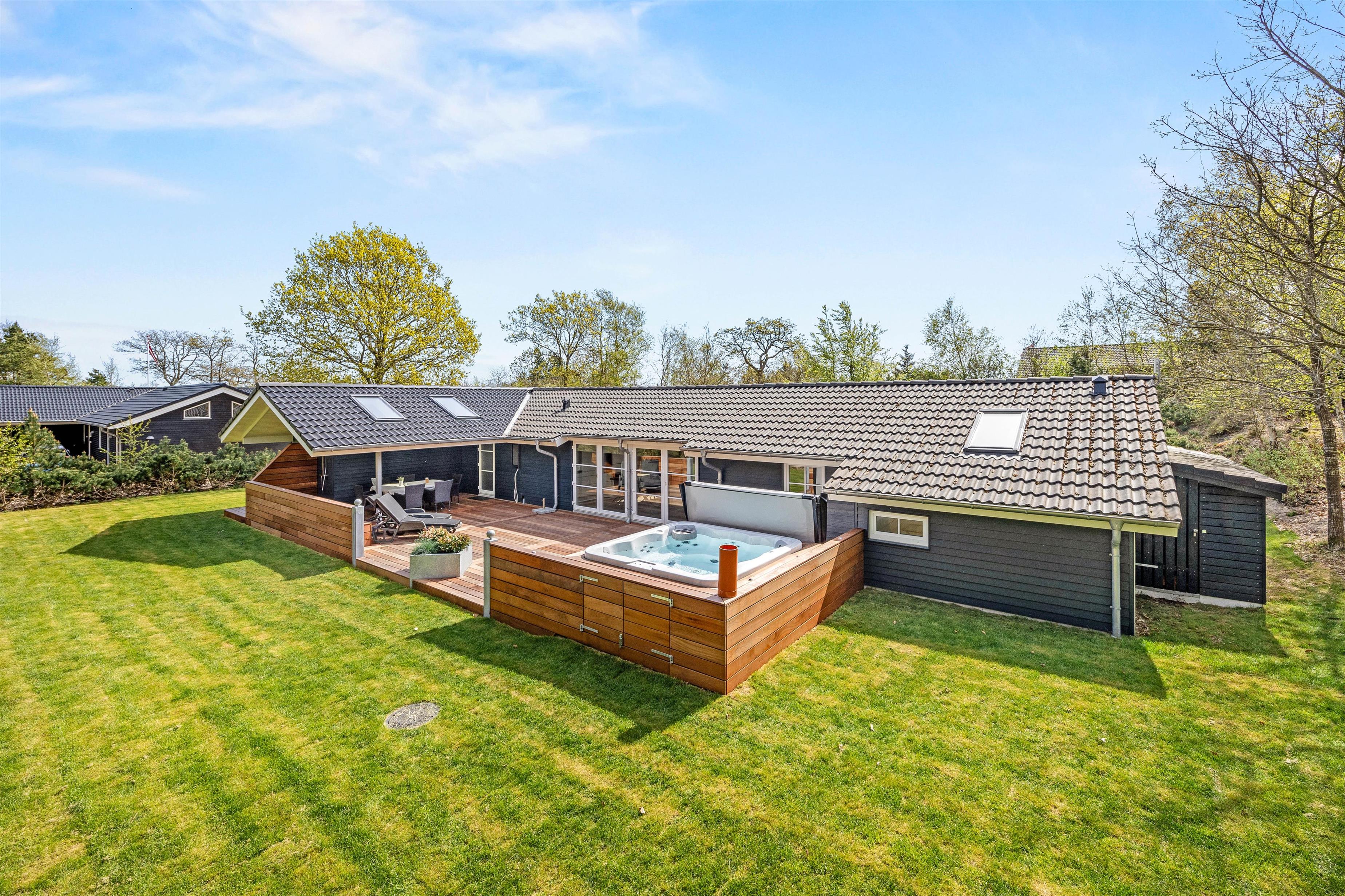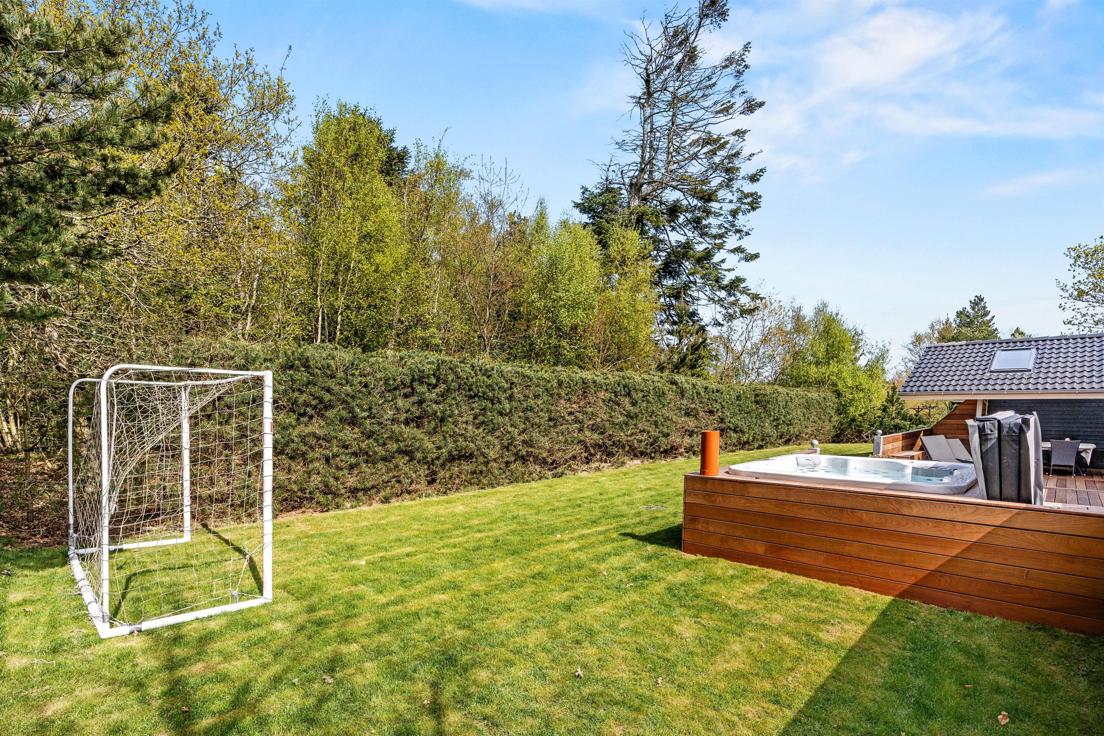 Når I virkelig vil forkæle jer selv, kan I tage en tur i den varme udendørs spa og lade skuldrene falde helt ned. Som en ekstra detalje finder I også en udendørs bruser – oplagt til en forfriskende skyller efter en tur ved stranden eller blot som et lille strejf af wellness under åben himmel. Udebruseren kan benyttes fra april til november.