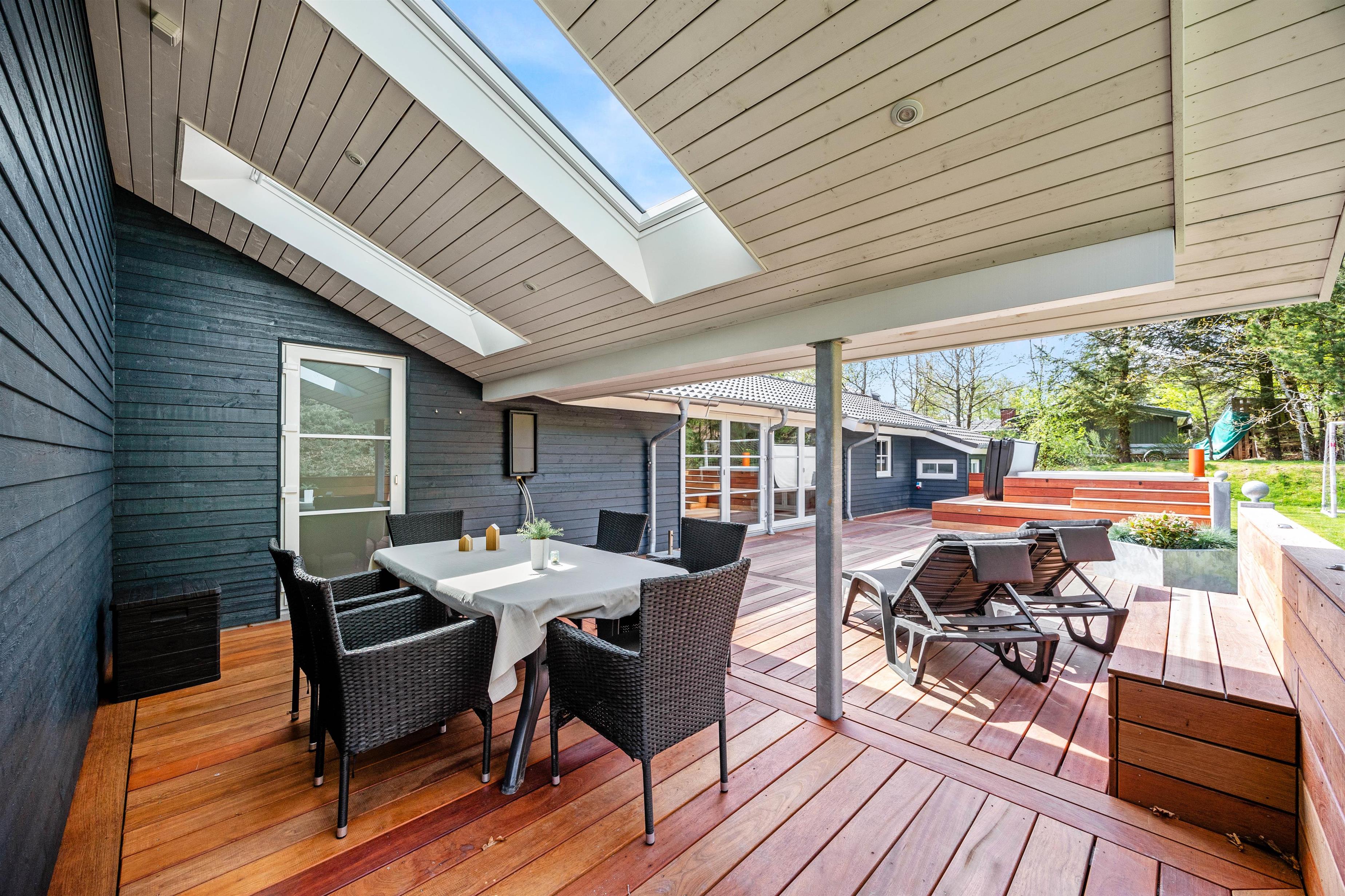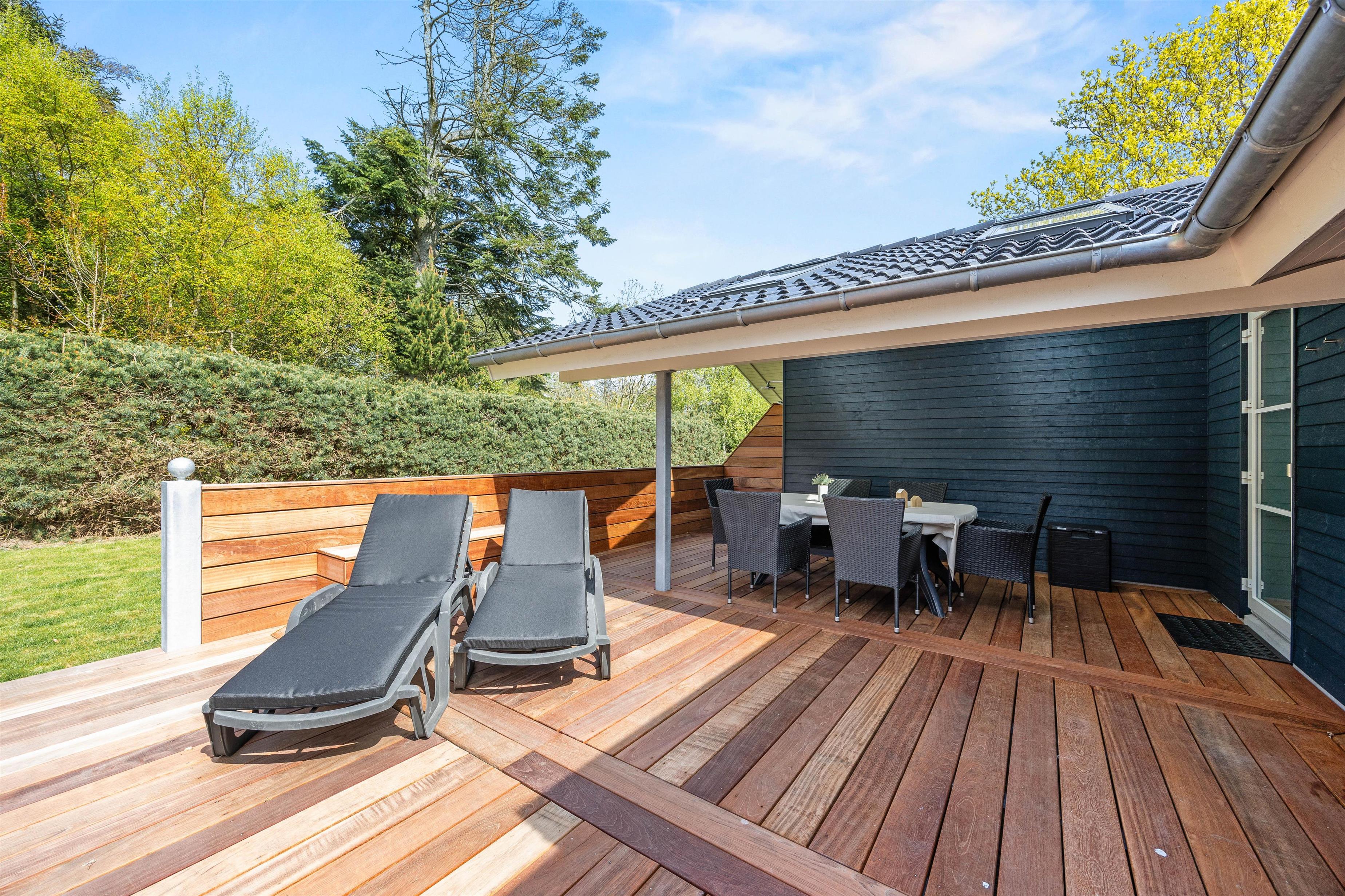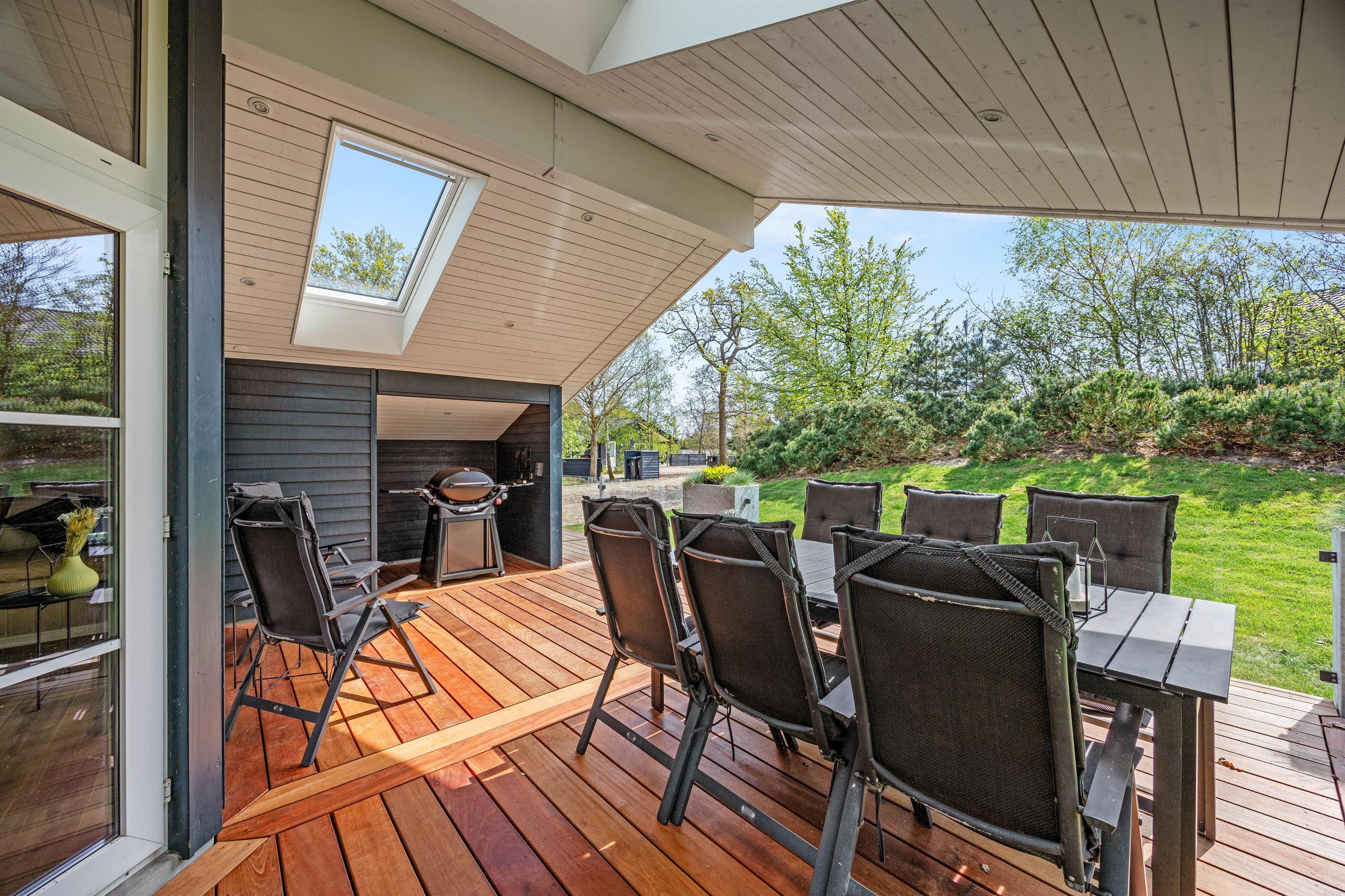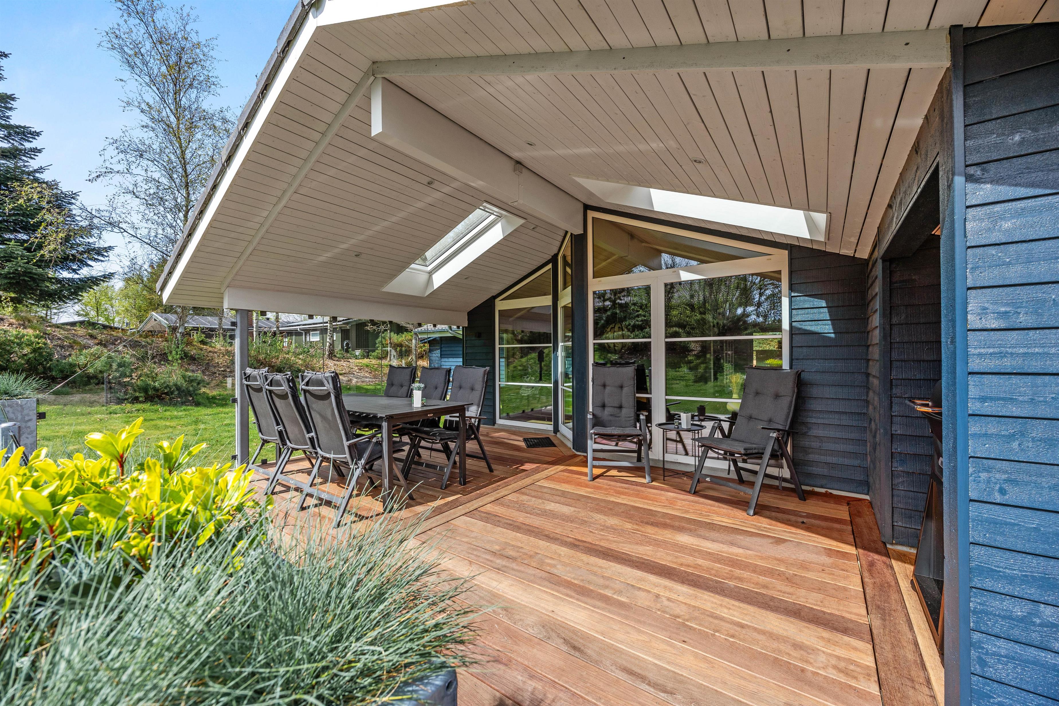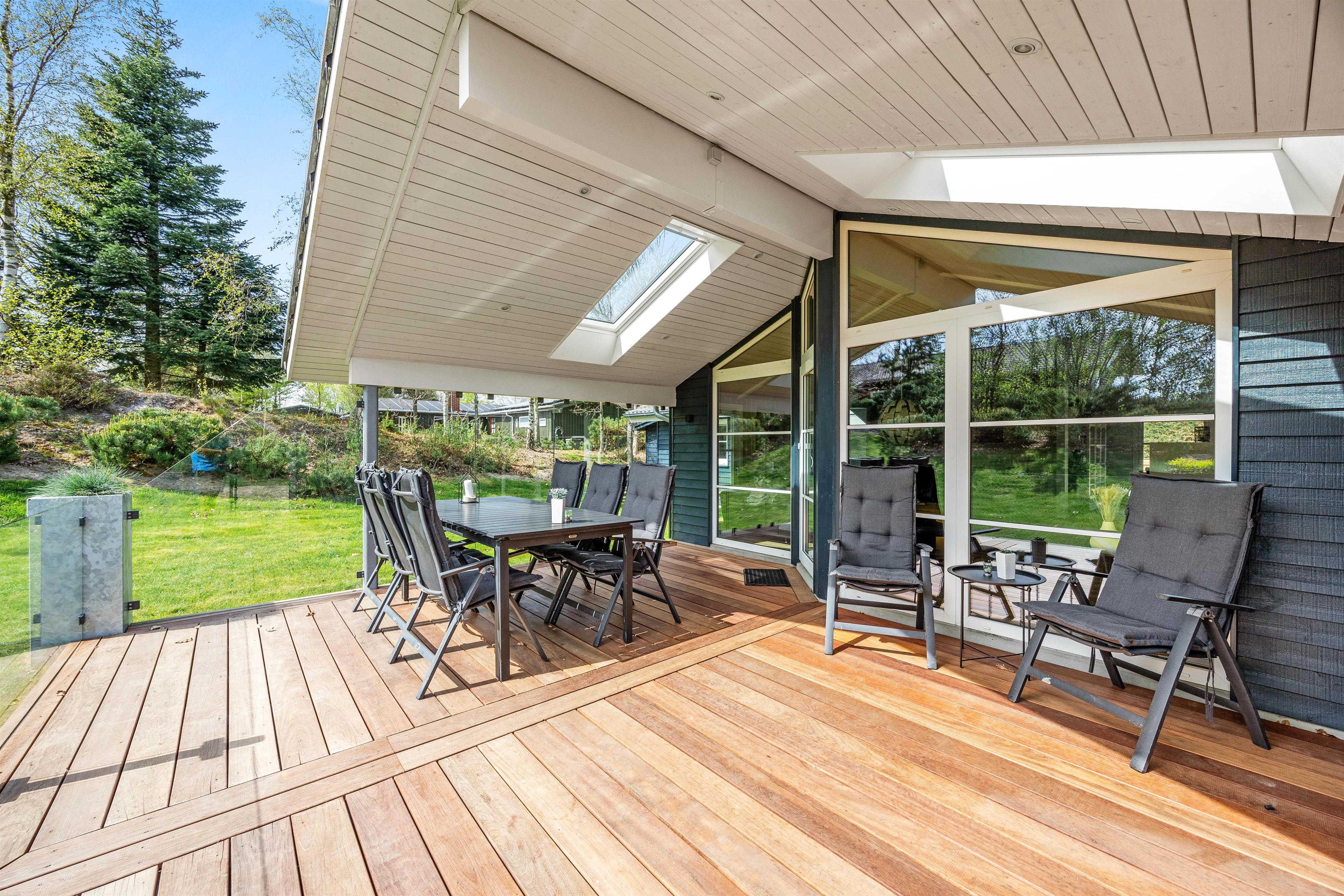 Sommerhuset ligger på en dejlig plæne- og naturgrund. Der er masser af plads til leg, boldspil og afslapning i det fri. Sommerhuset terrasse er både lukket og delvist overdækket, og her kan I nyde måltider i det fri eller bare slappe af i den friske luft. Til havemøblerne hører også liggestole, så I kan finde jeres eget lille solspot i løbet af dagen.
