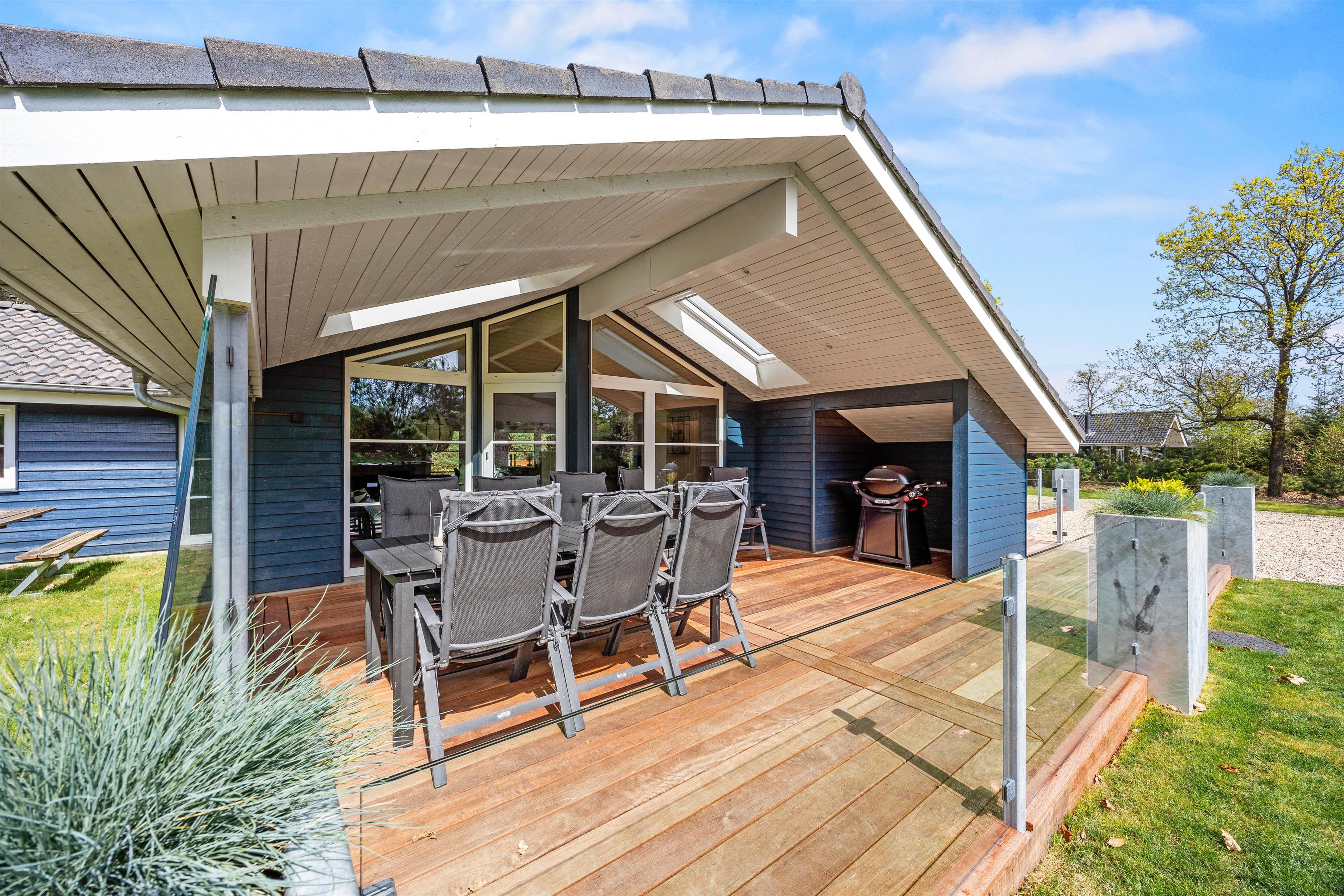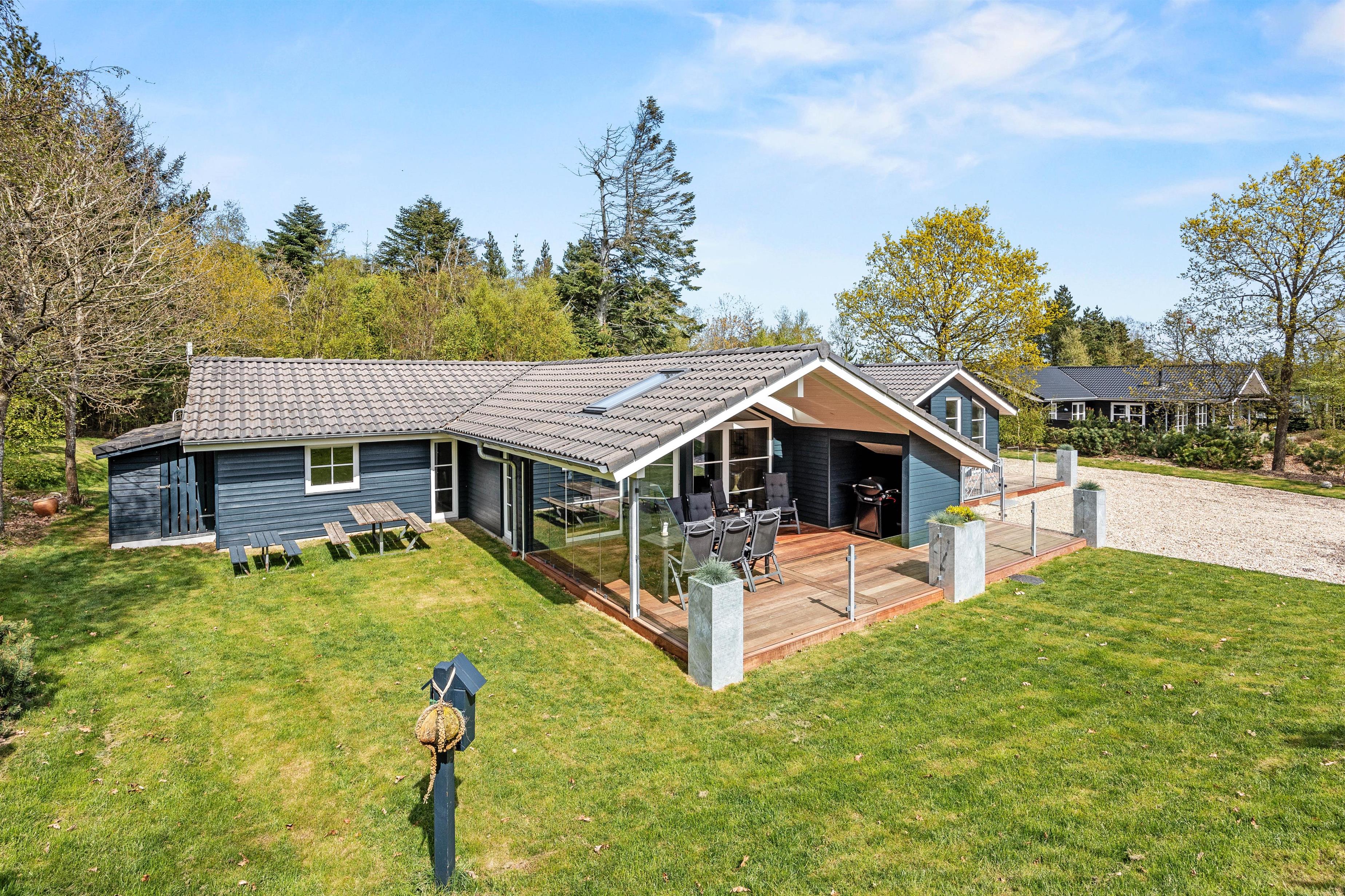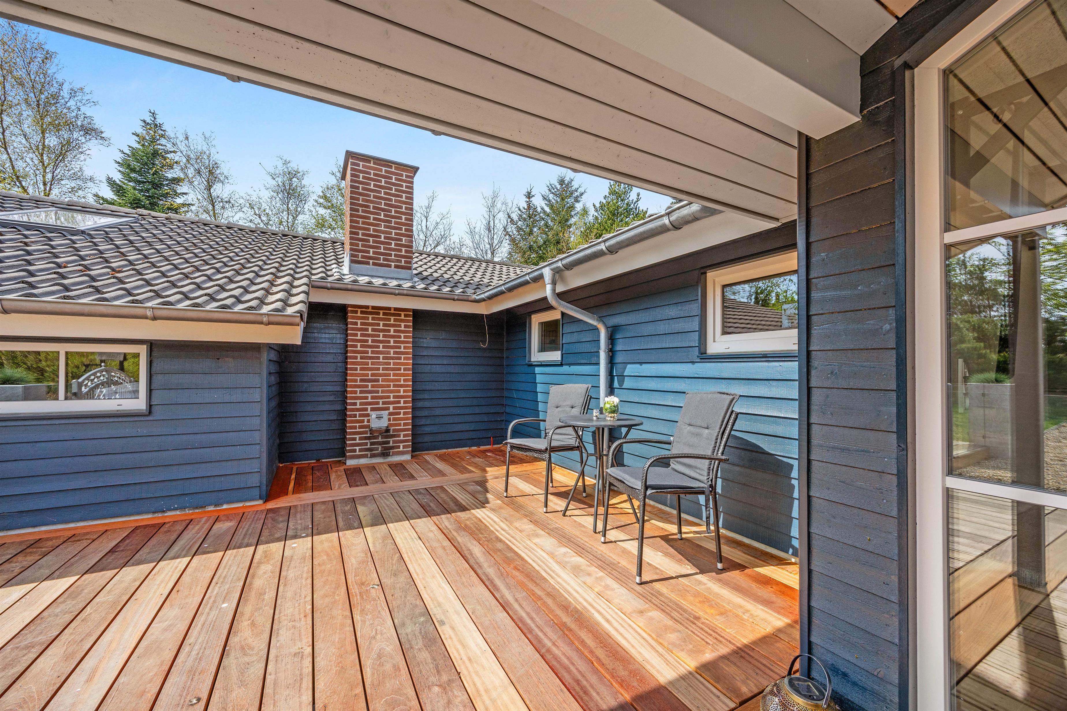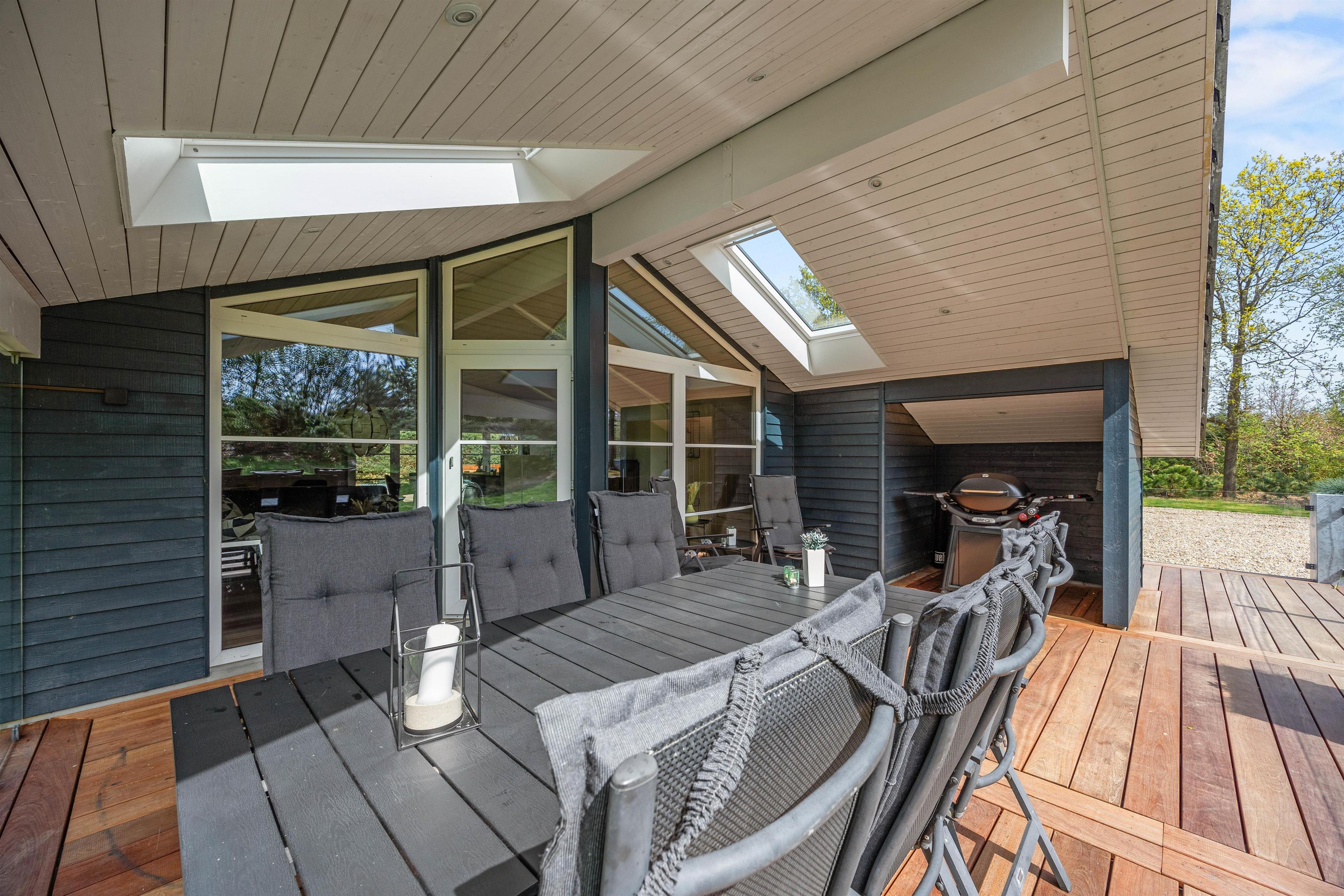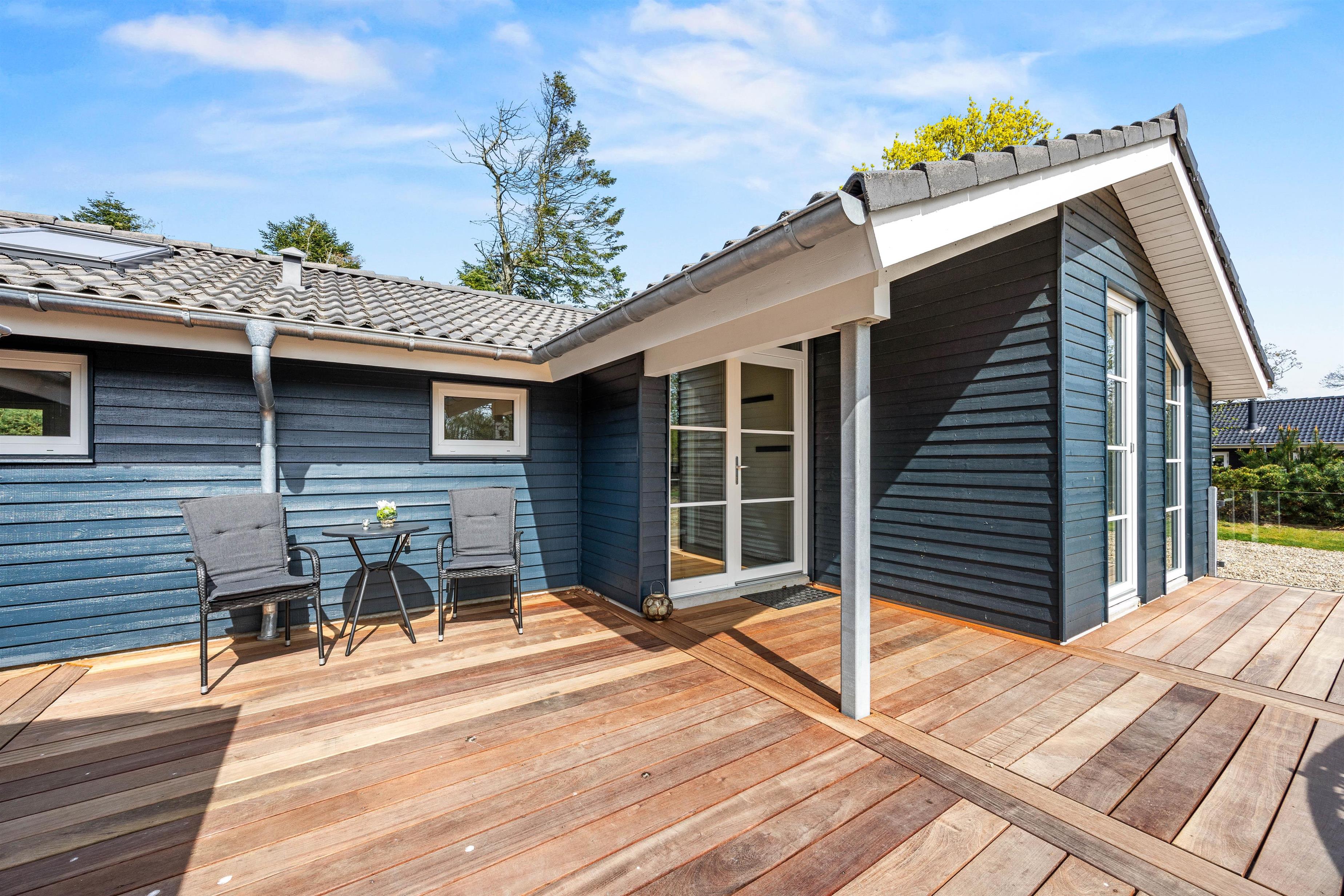 Sommerhuset ligger på en dejlig plæne- og naturgrund. Der er masser af plads til leg, boldspil og afslapning i det fri. Sommerhuset terrasse er både lukket og delvist overdækket, og her kan I nyde måltider i det fri eller bare slappe af i den friske luft. Til havemøblerne hører også liggestole, så I kan finde jeres eget lille solspot i løbet af dagen.
