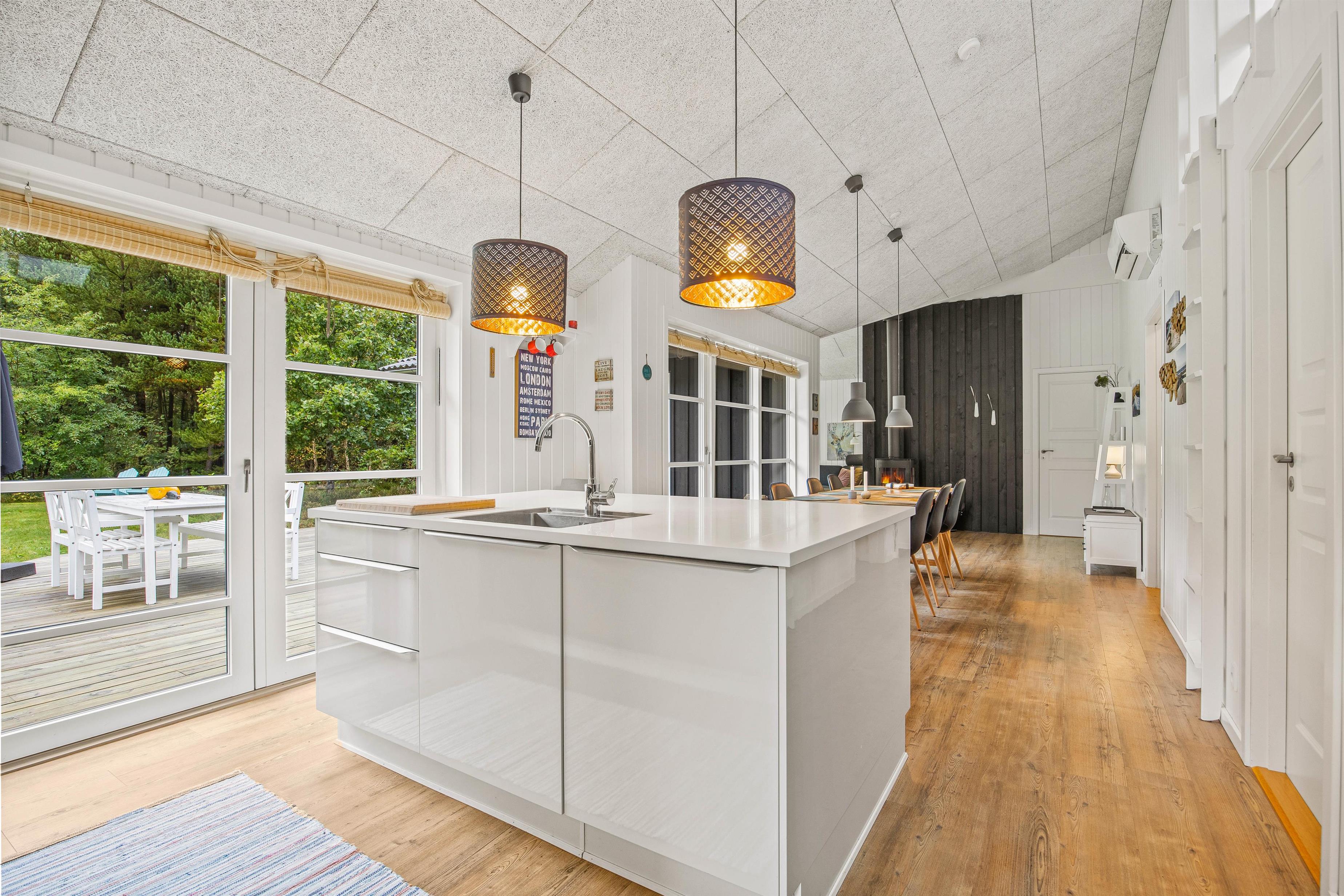 Den hyggelige brændeovn fordeler varmen ud til både stuen, spisestuen og køkkenet. Udover brændeovnen sørger elvarme og en luft-til-luft-varmepumpe for en behagelig temperatur i alle rum i dette sommerhus.