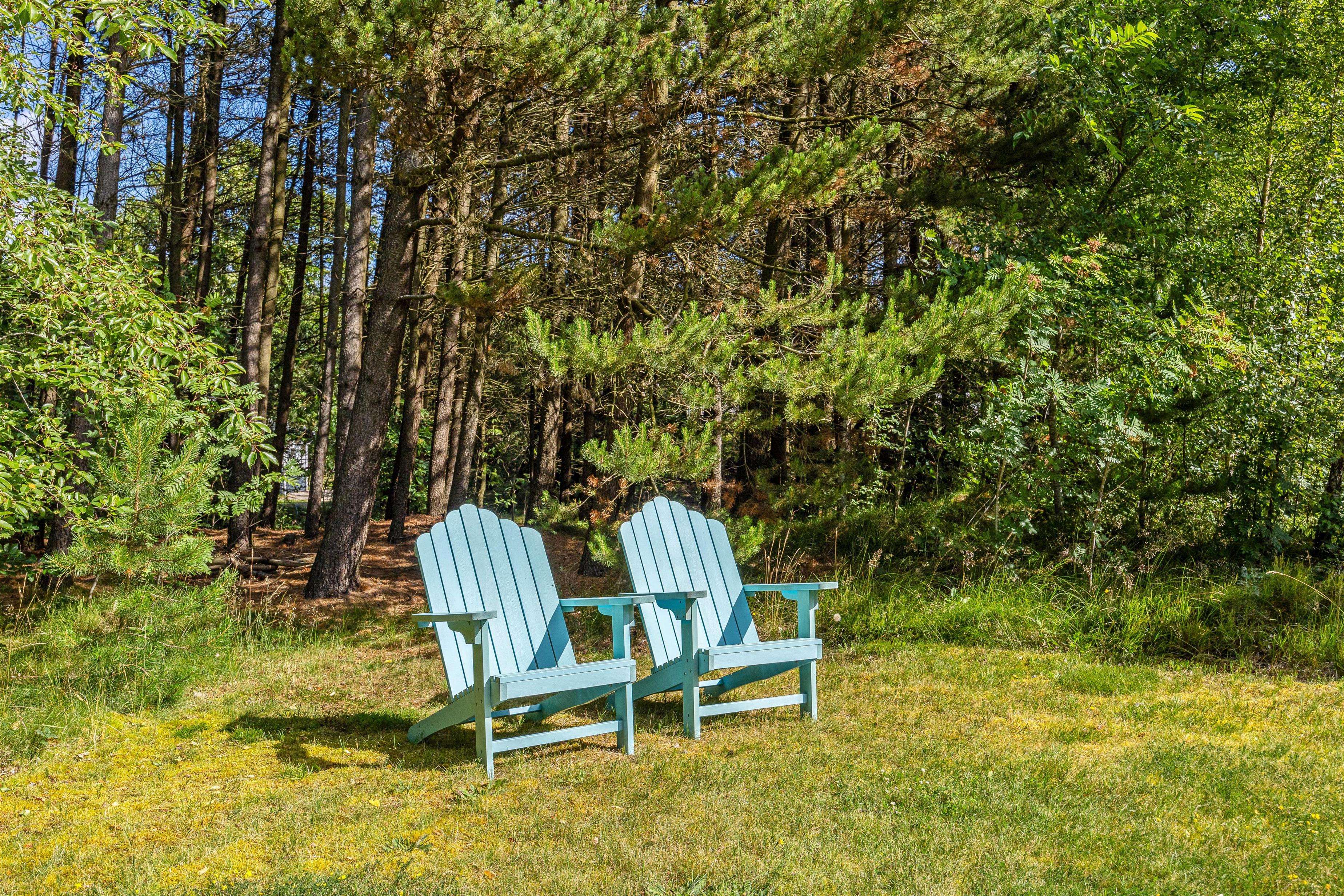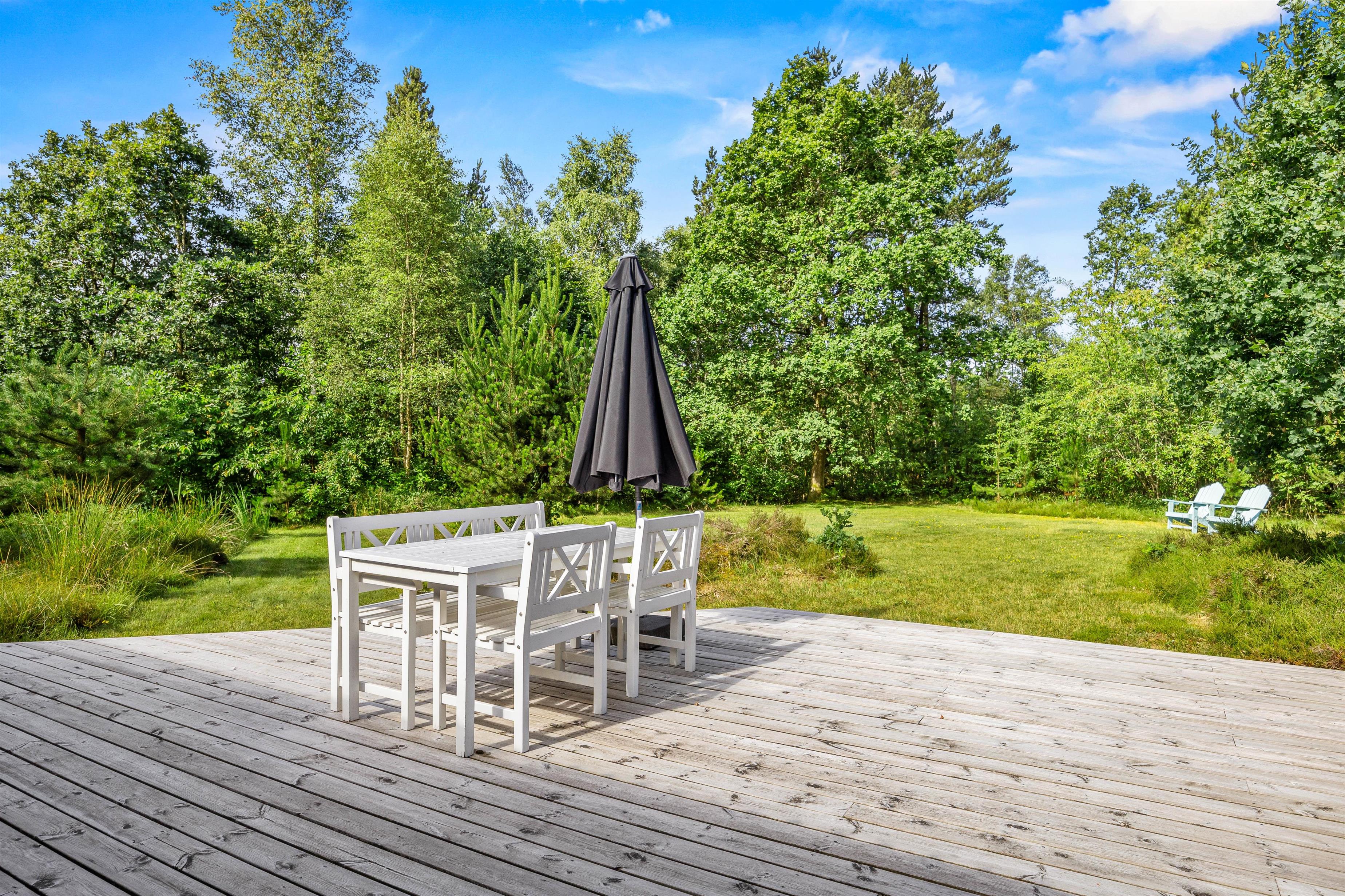 Terrassen strækker sig hele vejen rundt om sommerhuset, og her har I mulighed for at kunne nyde solen dagen lang: komfortable havemøbler og solvogne står klar til, at I blot kan læne jer tilbage, imens I nyder den friske luft, der kommer direkte fra Vestkysten. Skulle I dog få brug skygge eller vil nyde en aftenstund på terrassen, kan I trække jer tilbage på den overdækkede terrasse, hvor I også kan tilberede jeres aftensmad på sommerhusets grill.