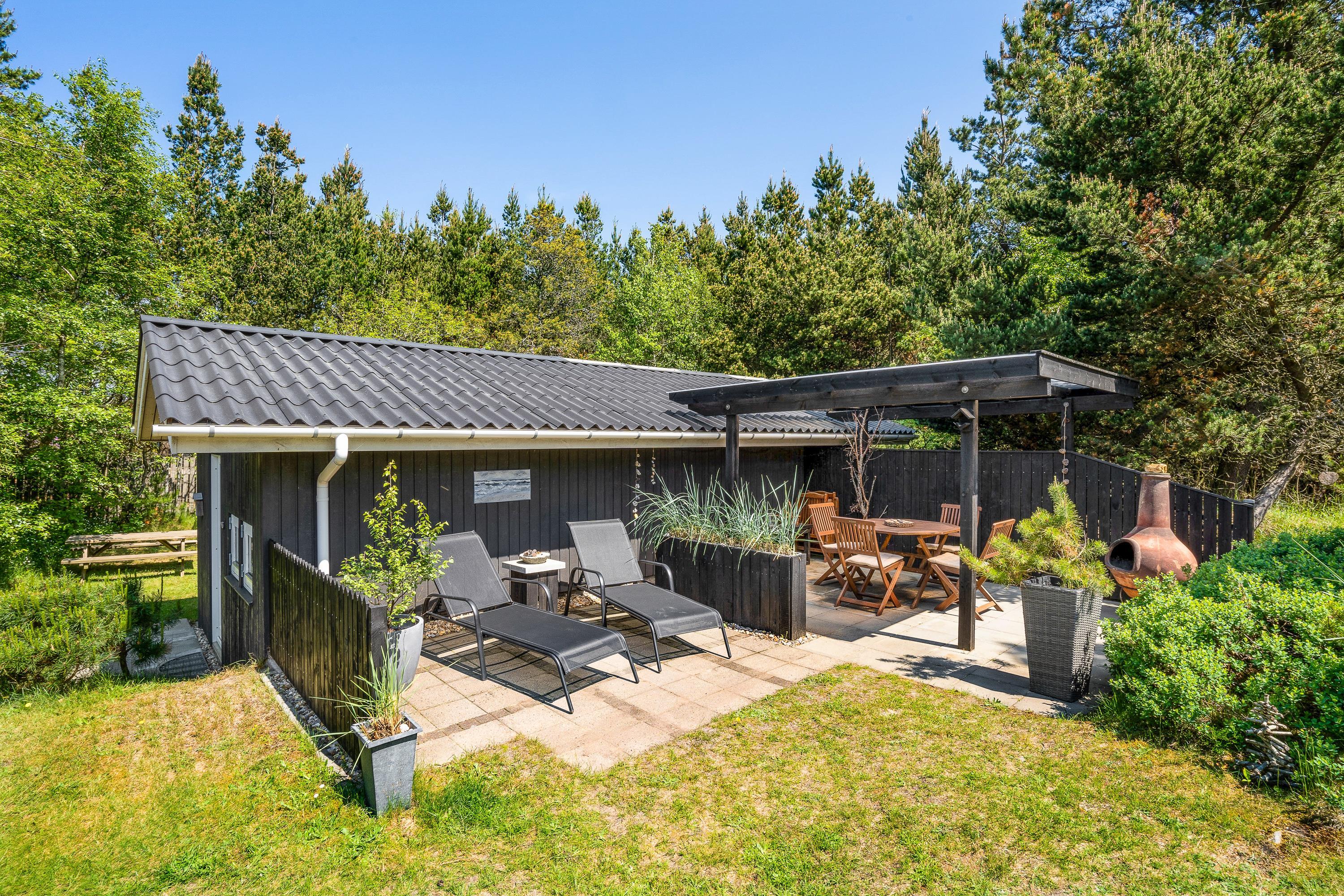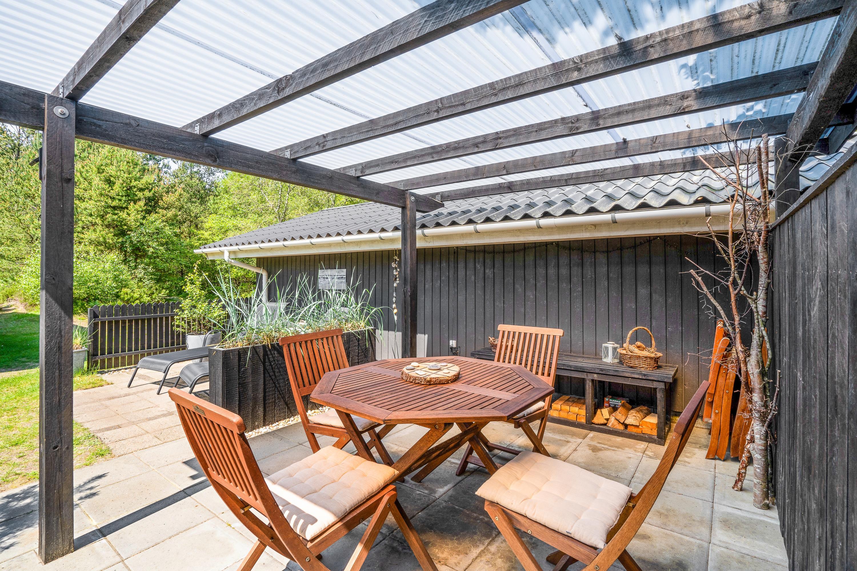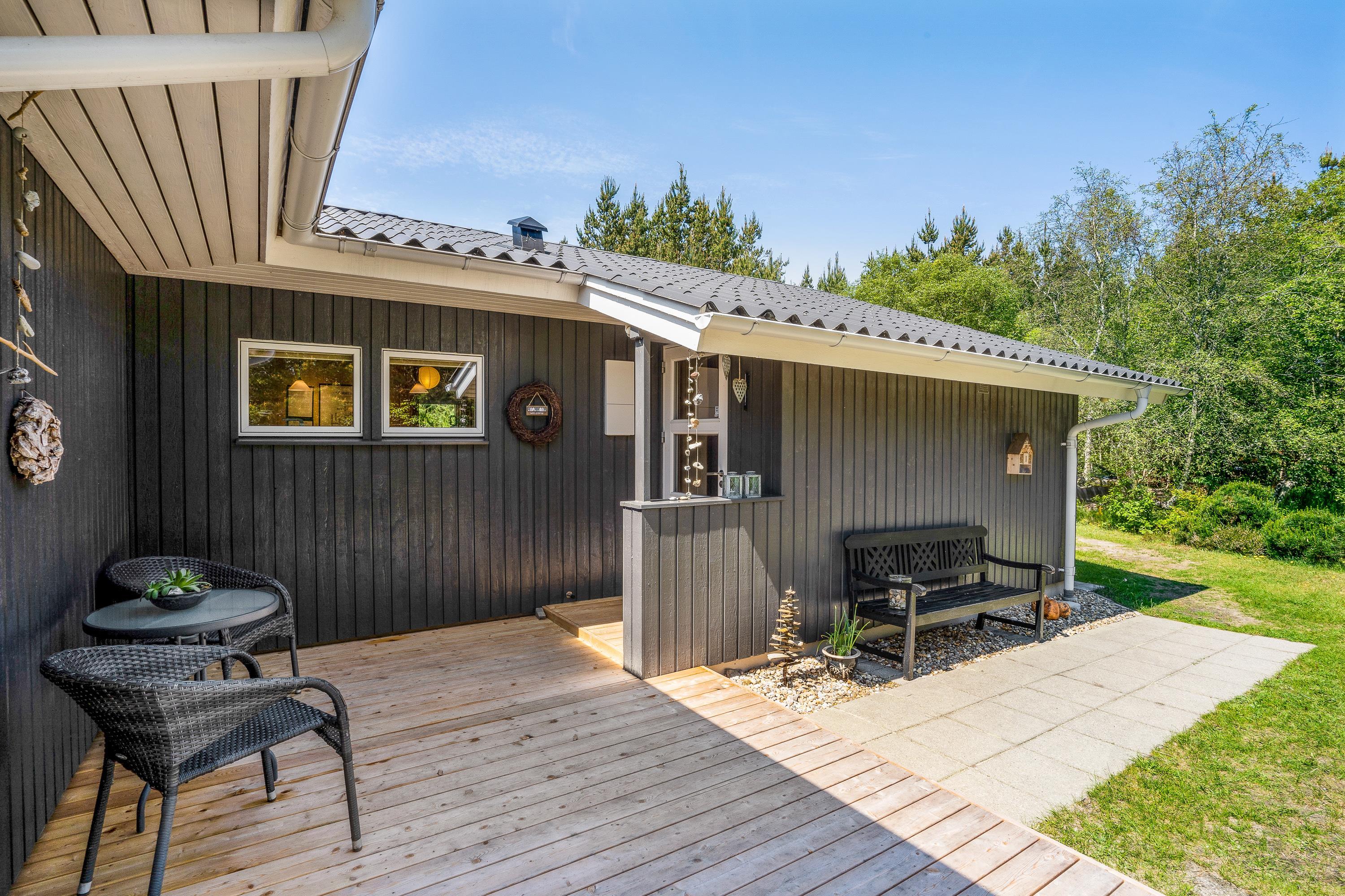 Fra stuen kommer I ud på den skønne terrasse, som er delvist overdækket. Her kan I starte en varm sommerdag ud med nybagte rundstykker og friskbrygget kaffe på terrassen, og mens dagen går, kan I dase i liggestolene, mens stilheden kun bliver brudt af fuglenes sang i trætoppene.