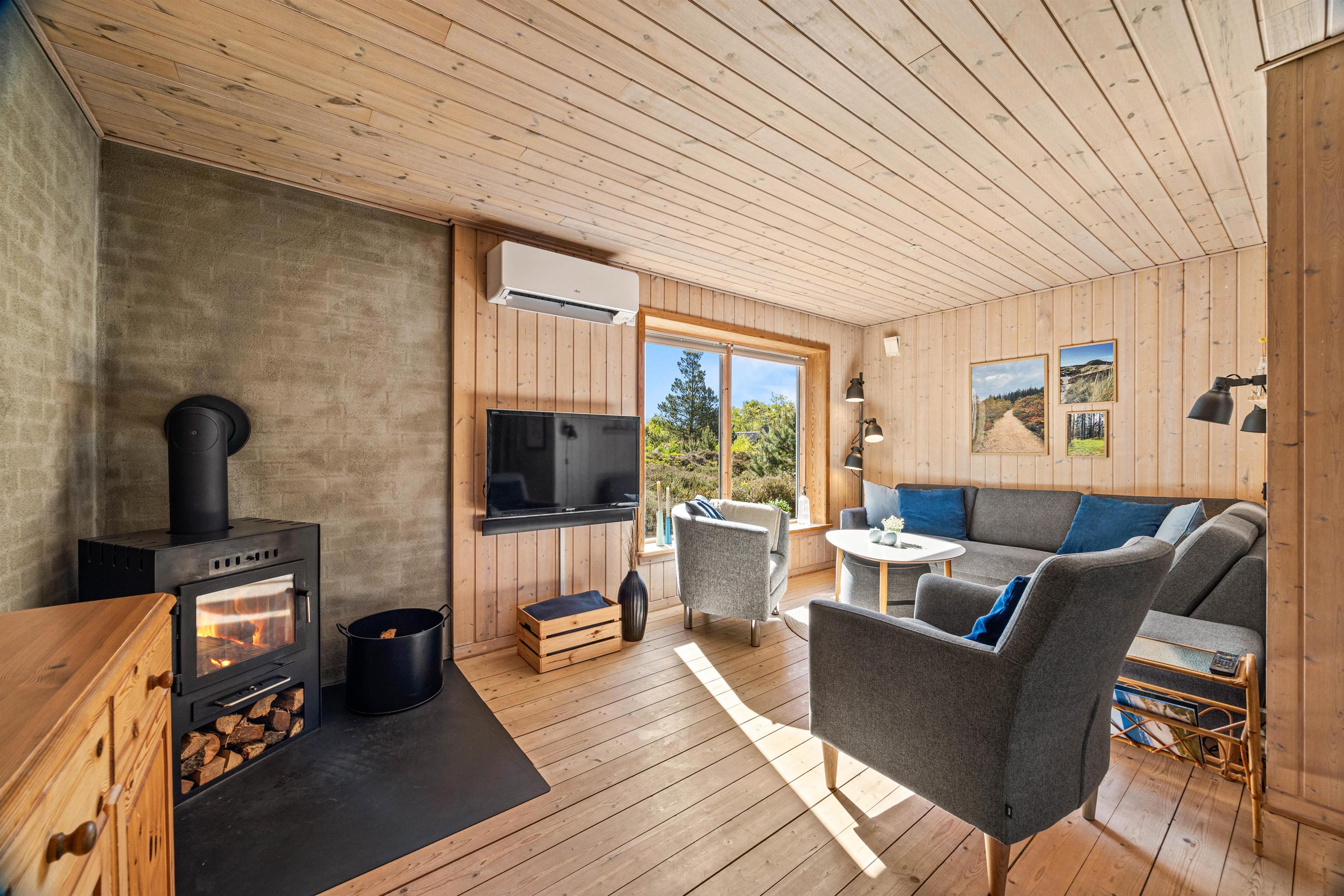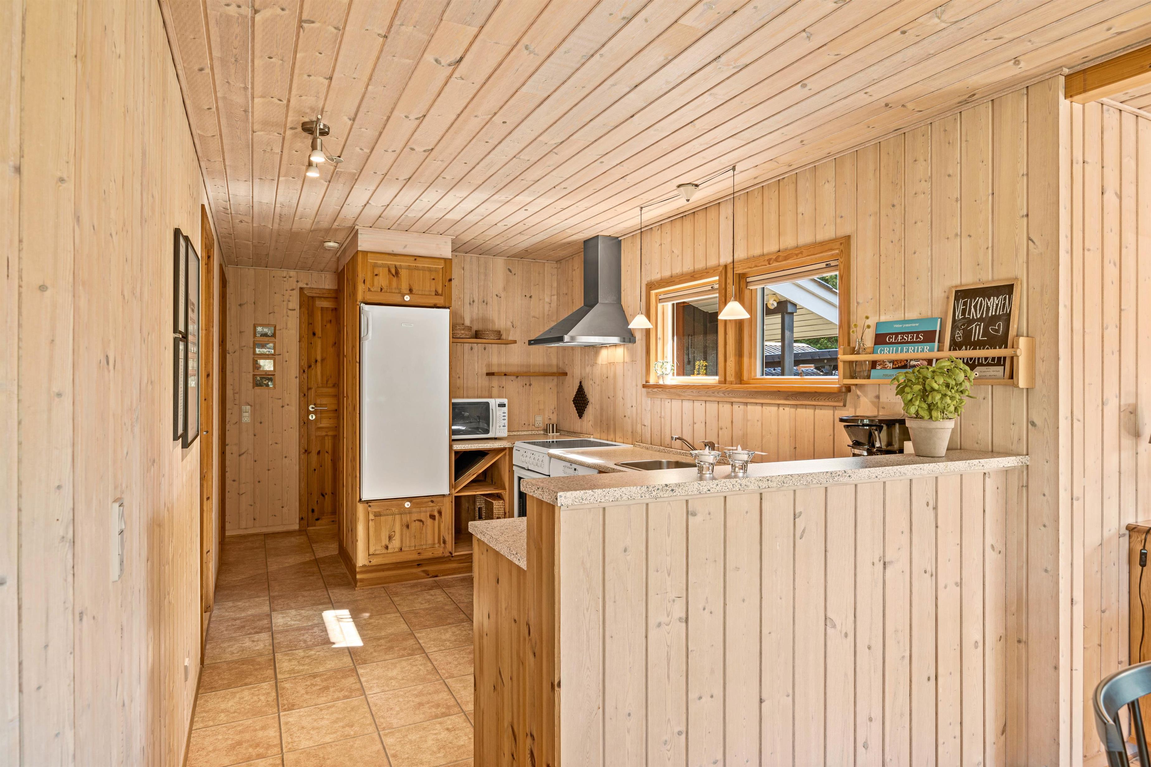 Det fine træhus oser af charme og rummer plads til 6 feriegæster - perfekt til en stille og rolig familieferie! Den hyggelige stue ligger i forbindelse med det åbne køkken, og her kommer I til at tilbringe et hav af hyggelige feriestunder med god mad, spændende film og afslapning foran brændeovnens knitrende varme.