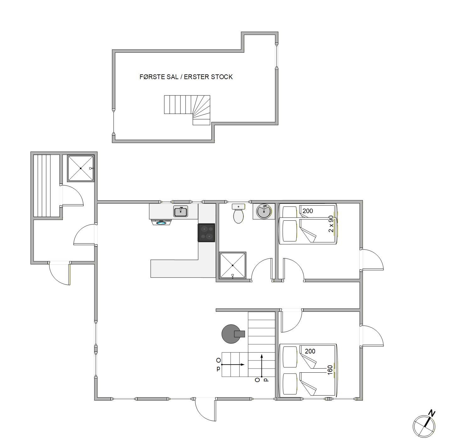 Sommerhusets sovepladser er fordelt over 2 soverum – ét med en dobbeltseng og ét med en etageseng. Dette gør det ideelt for både par, små familier eller grupper af venner. Den indbydende stue er udstyret med en brændeovn, som giver varme og hygge på køligere dage. Badeværelset er moderne indrettet og har gulvvarme, så I altid har lune fødder, uanset vejr og vind. Når I trænger til lidt ekstra luksus, er der også en sauna, hvor I kan slappe af efter en dag med aktiviteter.