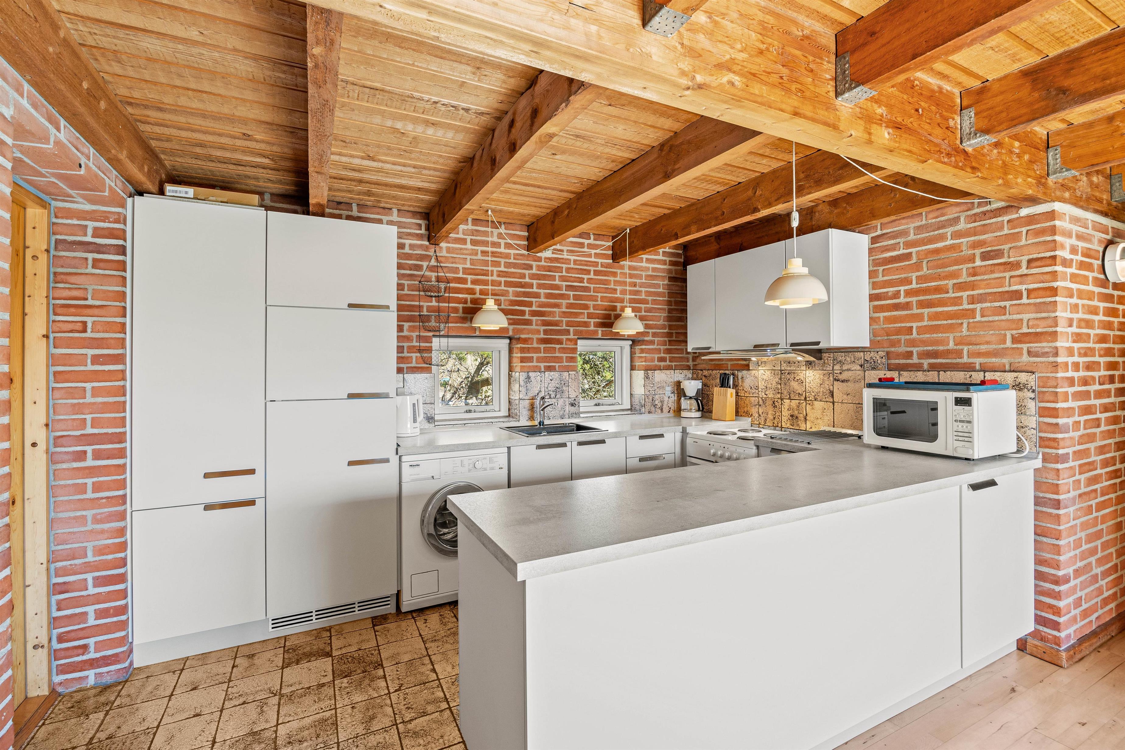 En trappe fører jer op til dette murstenshus i 2 plan, som ligger på en klittop med en pragtfuld udsigt. Sommerhusets flotte køkken ligger i åben forbindelse til stuen, hvorfra det er nemt at få øje på den egnens enestående natur. Også fra Tv-stuen på 1. sal, hvor der er 2 siddegrupper, er der en skøn udsigt over området omkring dette sommerhus.